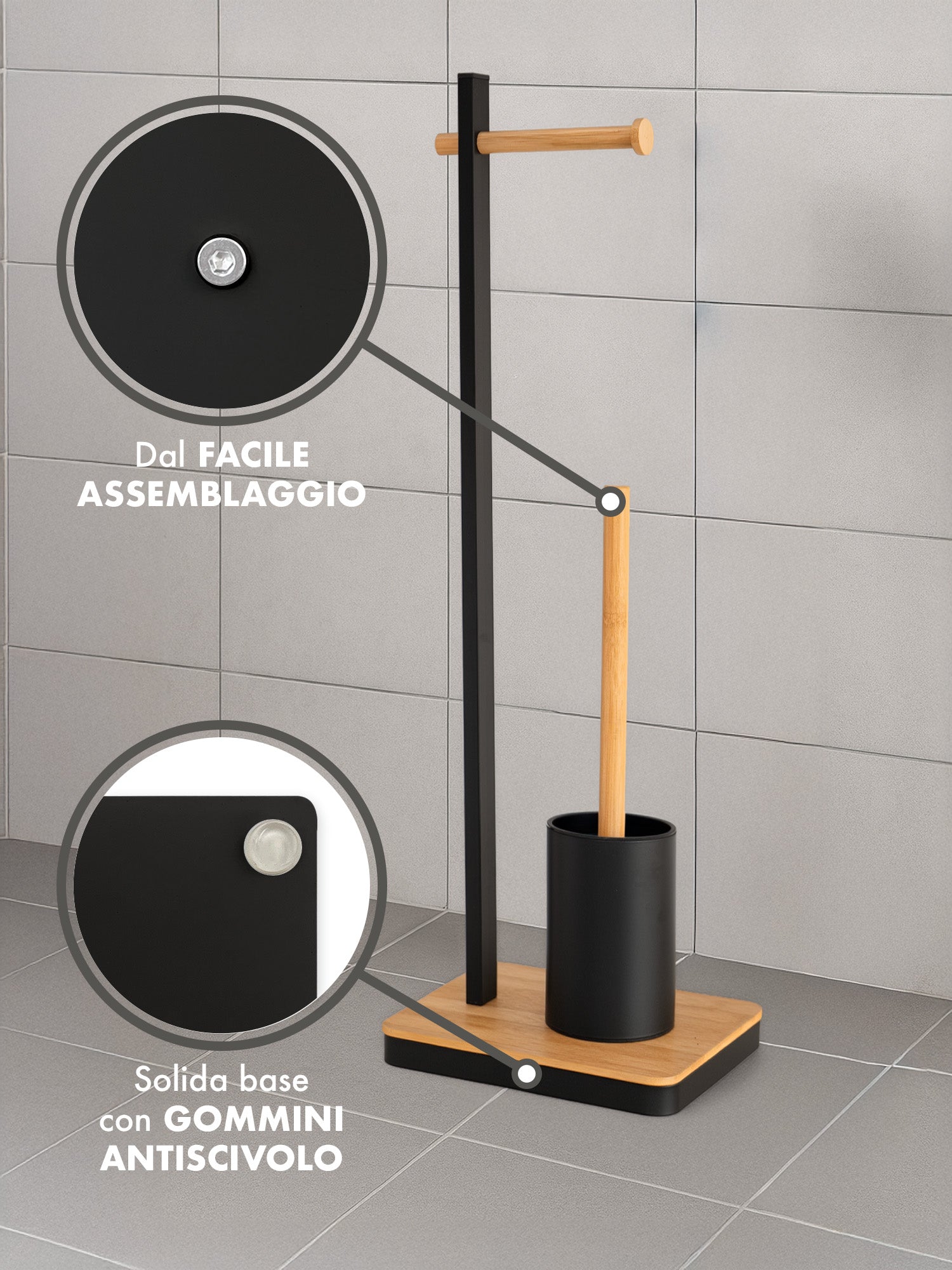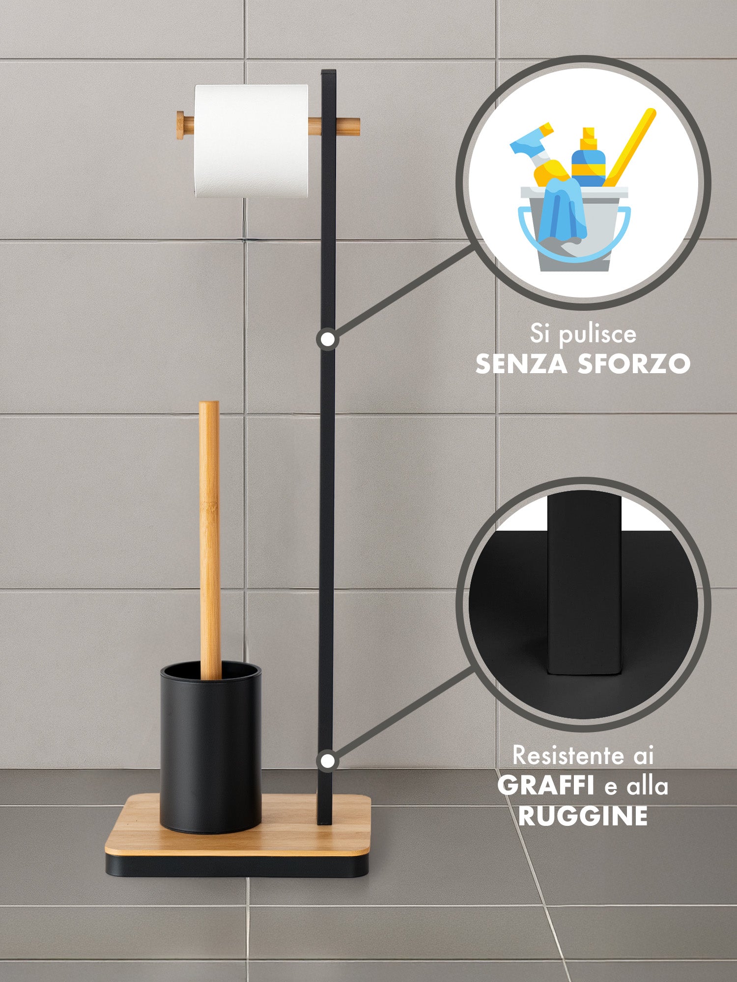 Il portarotolo a piantana è realizzato in metallo con trattamento antiruggine, pensato per resistere all’umidità del bagno. Il montaggio è facilissimo e rapido, così puoi avere la tua piantana operativa in pochi passaggi. Il set è composto dalla piantana con portarotolo e dal porta spazzolino con spazzolino incluso.