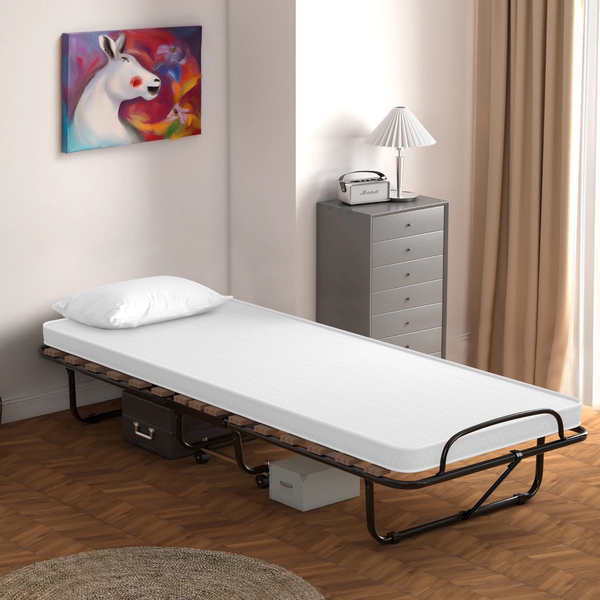 ✔️TRASPORTABILE: Non è solo pieghevole ma anche portatile: alla base del telaio, sulle gambe centrali, sono posizionate infatti 4 ruote che ne facilitano lo spostamento ad esempio dal ripostiglio alla camera da letto o viceversa ed eliminano in tal modo il problema del sollevamento e del trasporto del letto. Il telaio della brandina è realizzato in acciaio resistente il che la rende leggera ma al contempo in grado di sostenere adeguatamente la base a 15 doghe in legno di betulla.