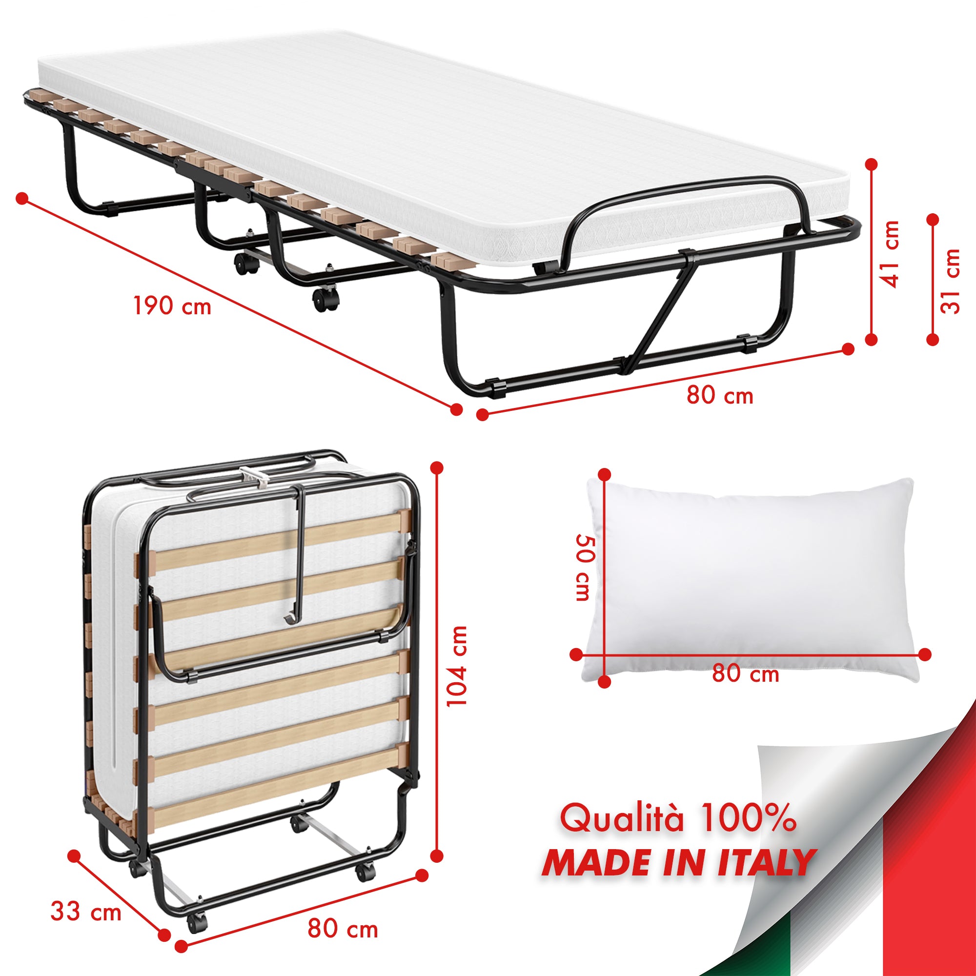 ✔️DIMENSIONI: Dimensioni struttura aperta: 80x190x41 Cm - Dimensioni struttura chiusa: 80x33x104 cm Dimensioni materasso: 80x190x10 cm portata massima 120 Kg OMAGGIO: Inclusa nella brandina riceverai una custodia in tnt per proteggere al meglio la brandina durante i periodi di non utilizzo e un comodissimo cuscino da utilizzare assieme alla brandina