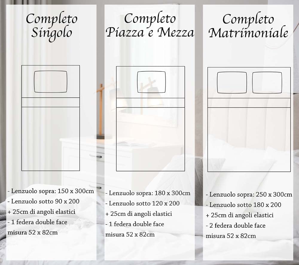 ✔️DIMENSIONI 1 piazza :Lenzuolo sotto con angoli 90x200+25 Cm, Lenzuolo sopra 150x290 1 federa 52x82 1 piazza e Mezza :Lenzuolo sotto con angoli 120x200+25 cm , Lenzuolo sopra 180x290 +1 federa 52x82 2 piazze : Lenzuolo sotto 180x200+25 cm , lenzuolo sopra 250x290 + 2 federe 52x8