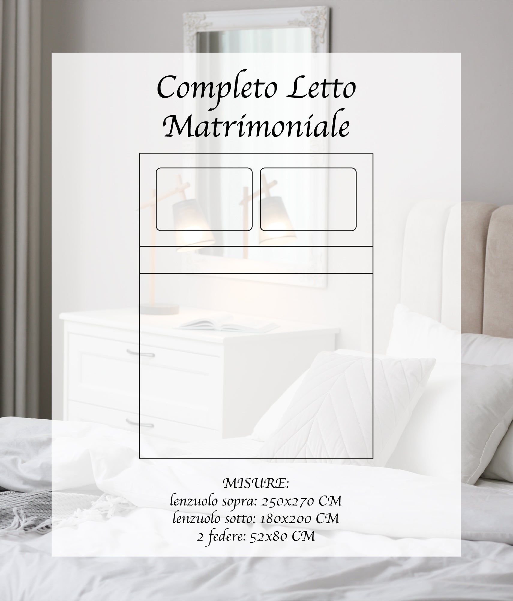 SET LENZUOLA Il completo letto è così composto Lenzuolo Sotto con angoli elastici 180 x 200 +25 cm di Elastico, lenzuolo sopra 250 x 270 Cm + 2 federe 52 x 80 + 10 Cm di pratica patella per inserire in tutta facilità il cuscino, sul lenzuolo sopra e sulle federe è applicato un elegantissima balza per un contrasto di colore unico.