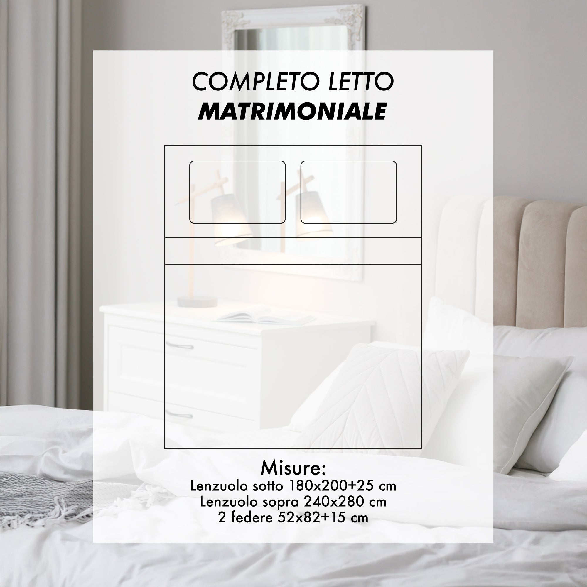 ✔️LA CONFEZIONE COMPRENDE: un Lenzuolo sotto con angoli elasticizzati 180x200 cm + 25 cm di angolo elasticizzato, e un Lenzuolo sopra 240x280 cm. Insieme, due federe di 52x82 cm con una patella di 15 cm per stabilizzare al meglio il cuscino, offrendo una sistemazione perfetta e una tenuta ottimale sul letto.