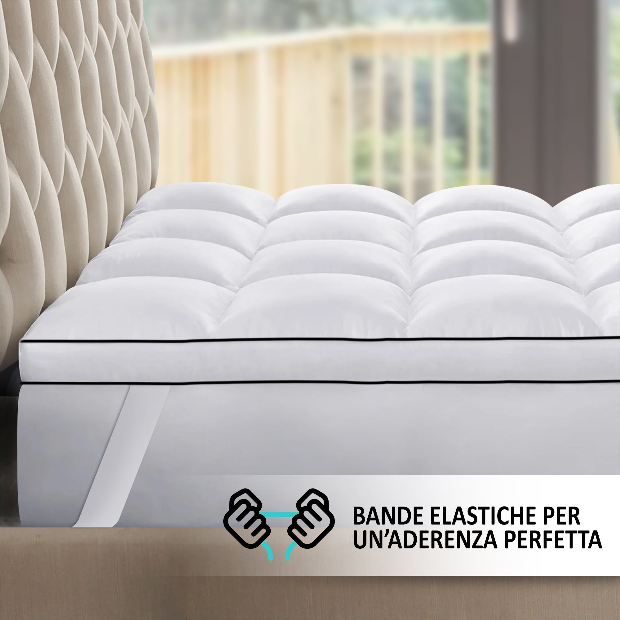 Topper Per Materasso In Vera Piuma D'Oca Alto 7 Cm Certificato Oeko Tex 1800 Gr/Mq Trattamento Down Proof Soffice Anallergico Ipoallergenico Traspirante Termoregolante Con Bande Elastiche