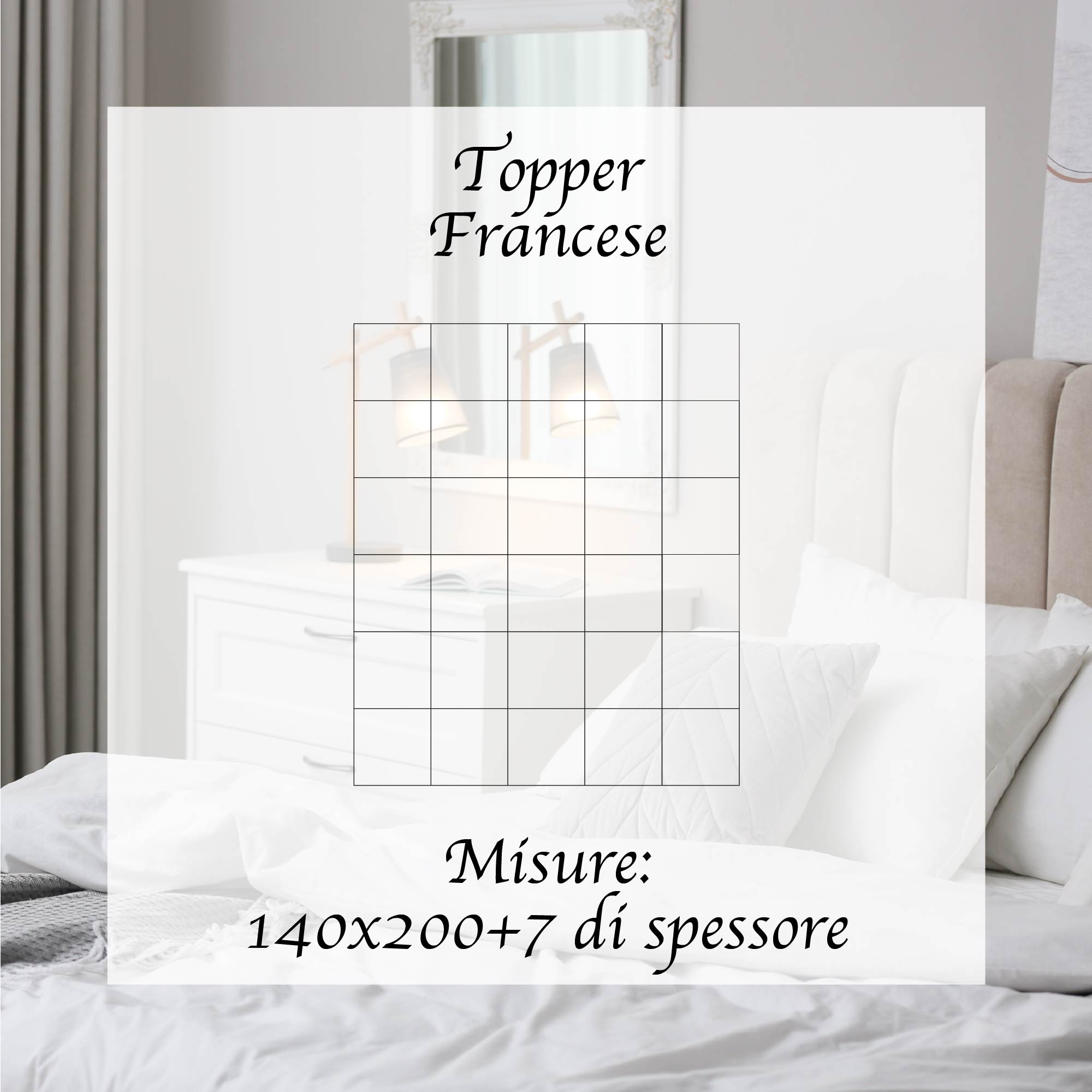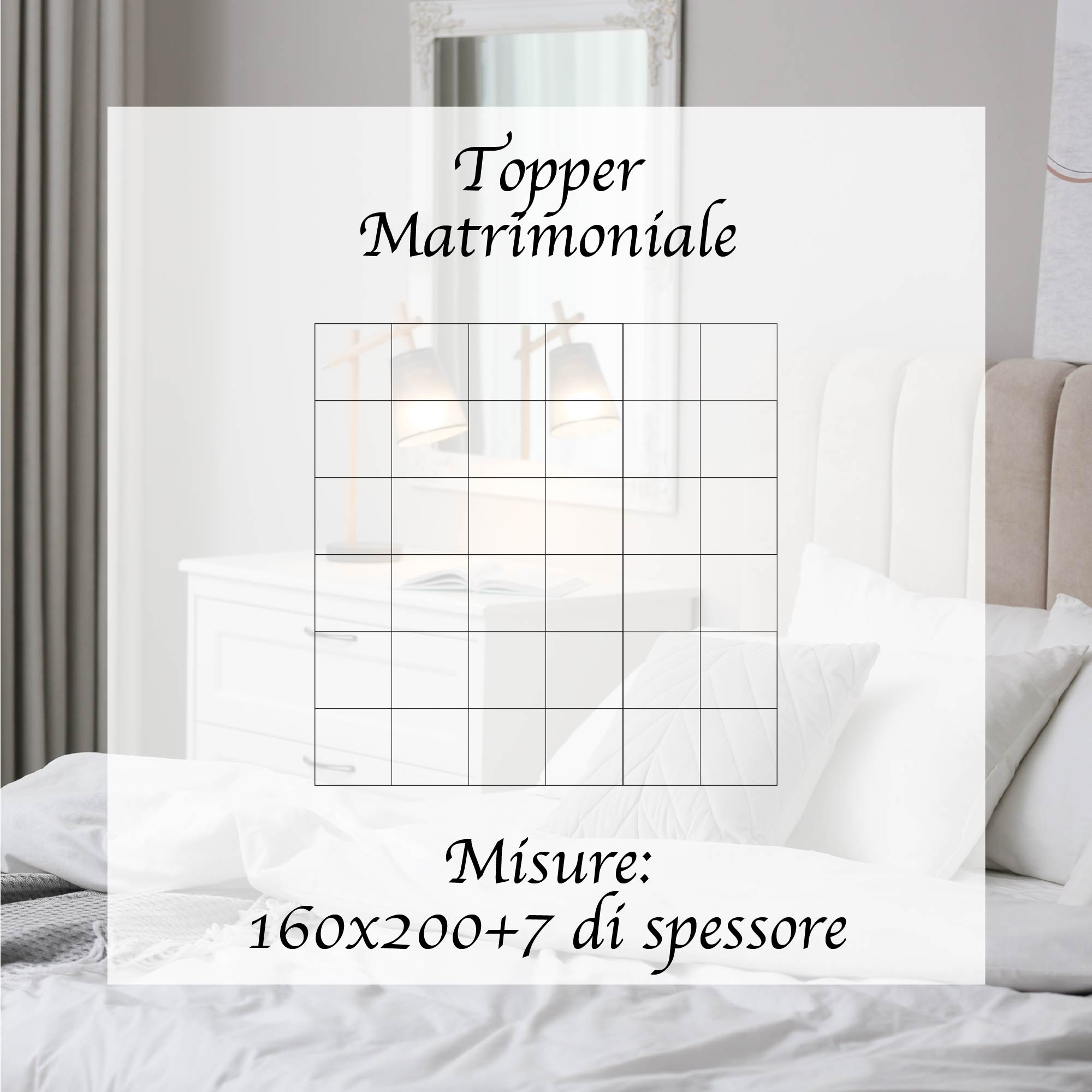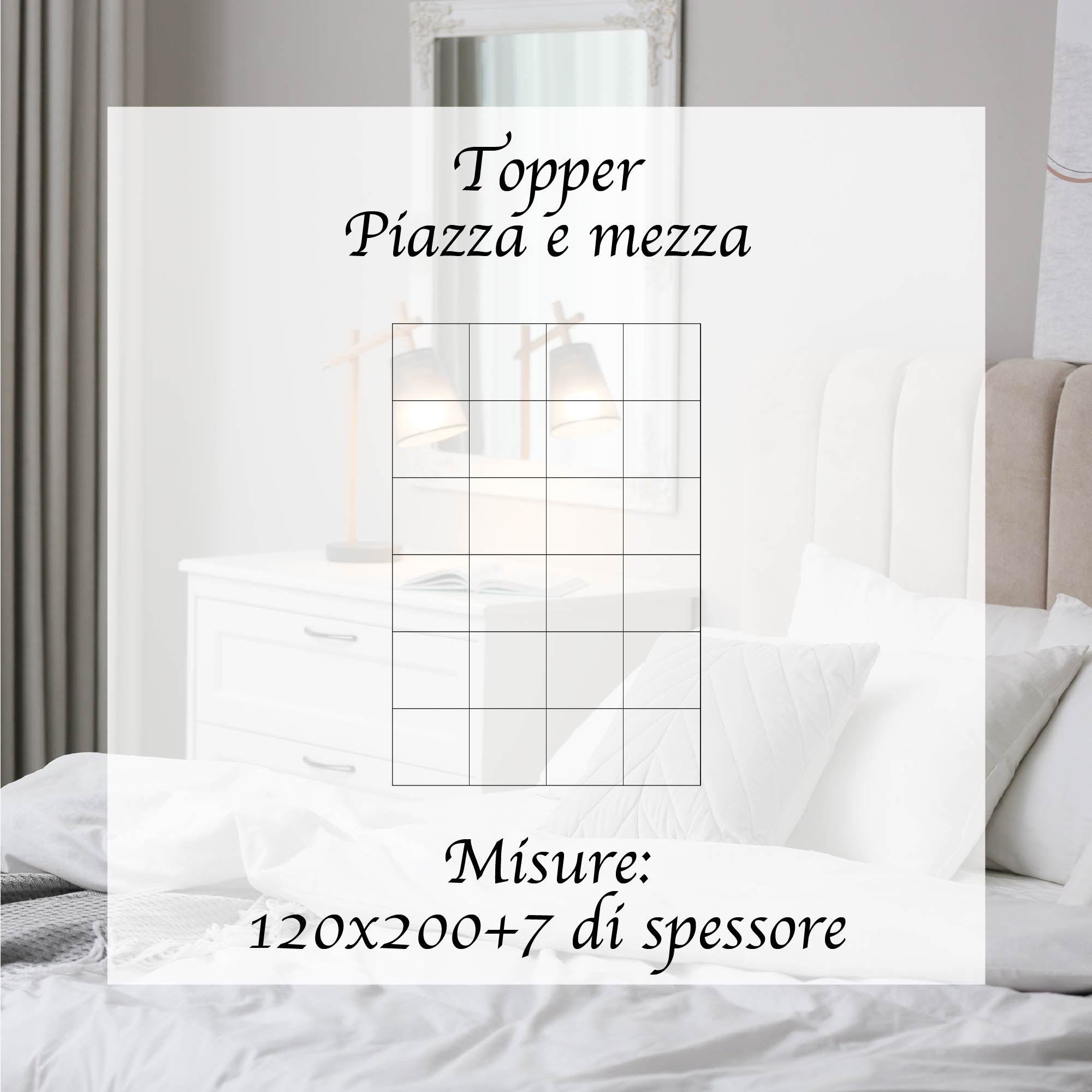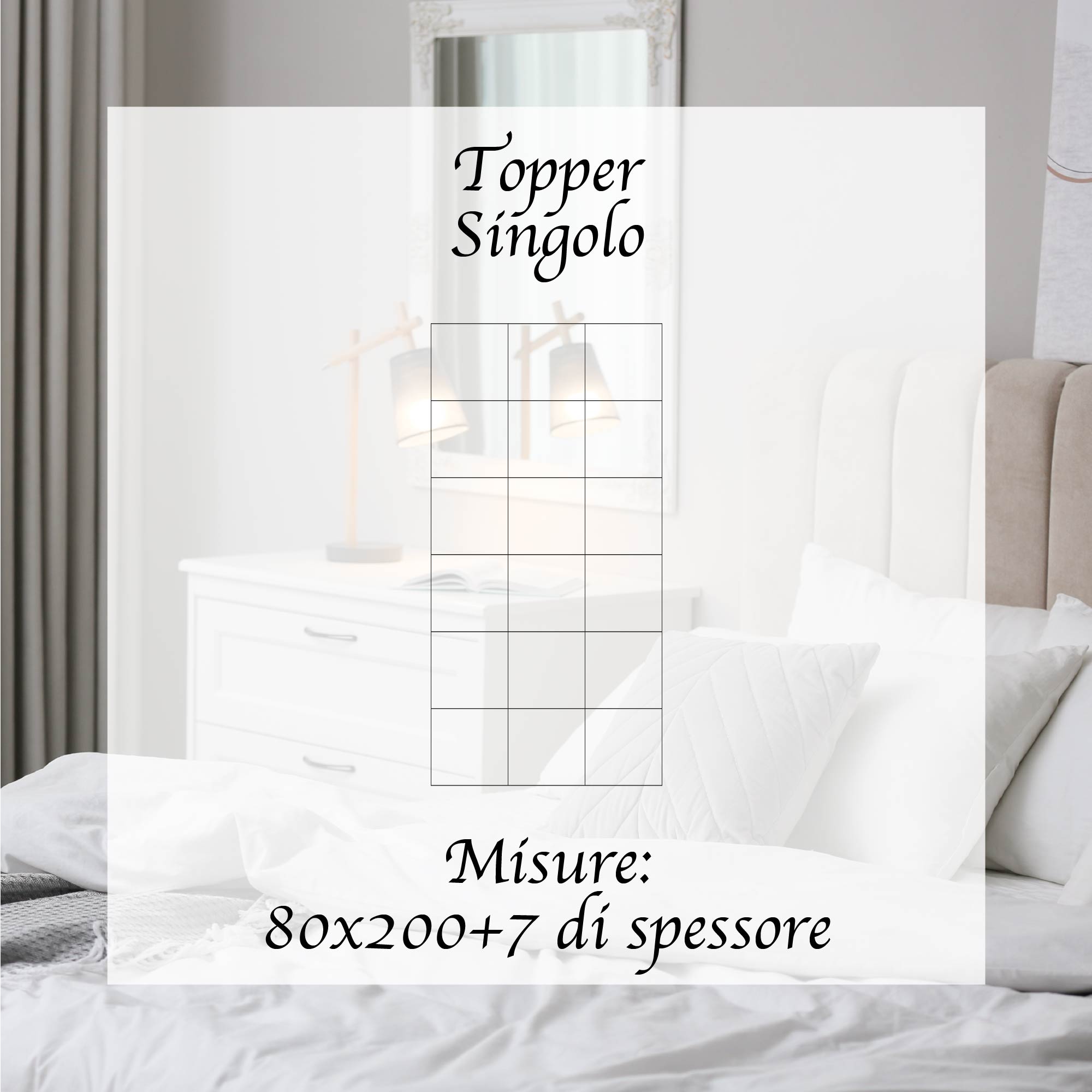 DIMENSIONI: Misura Singola 80 x 200 Cm - Misura Piazza Mezza 120 x 200 Cm - Misura Matrimoniale 160 x 200 Cm - Altezza del Topper 7 Cm, Nei 4 Lati del Topper sono presenti Bande elastiche che consentono di fissare in modo ottimale il topper al materasso.