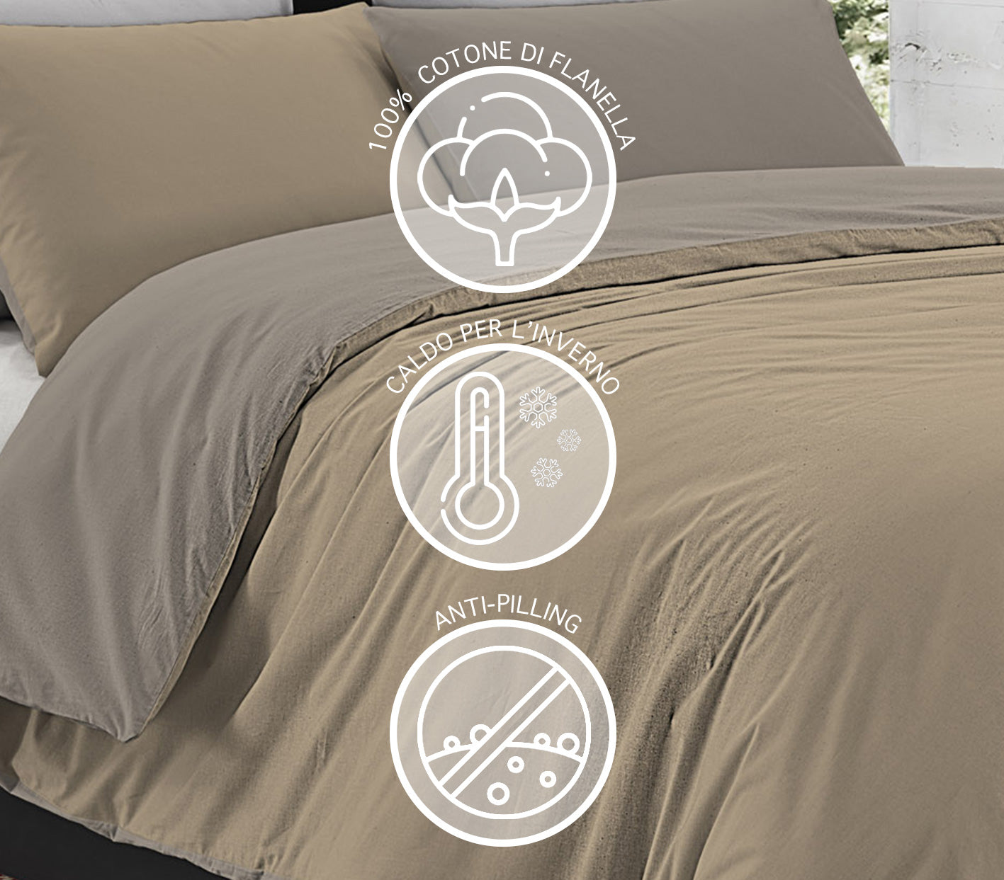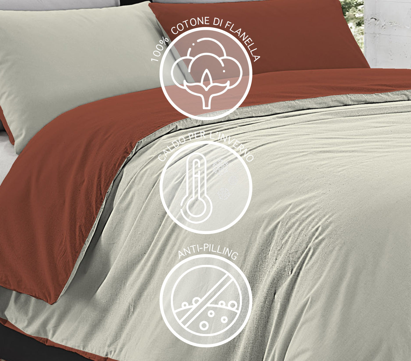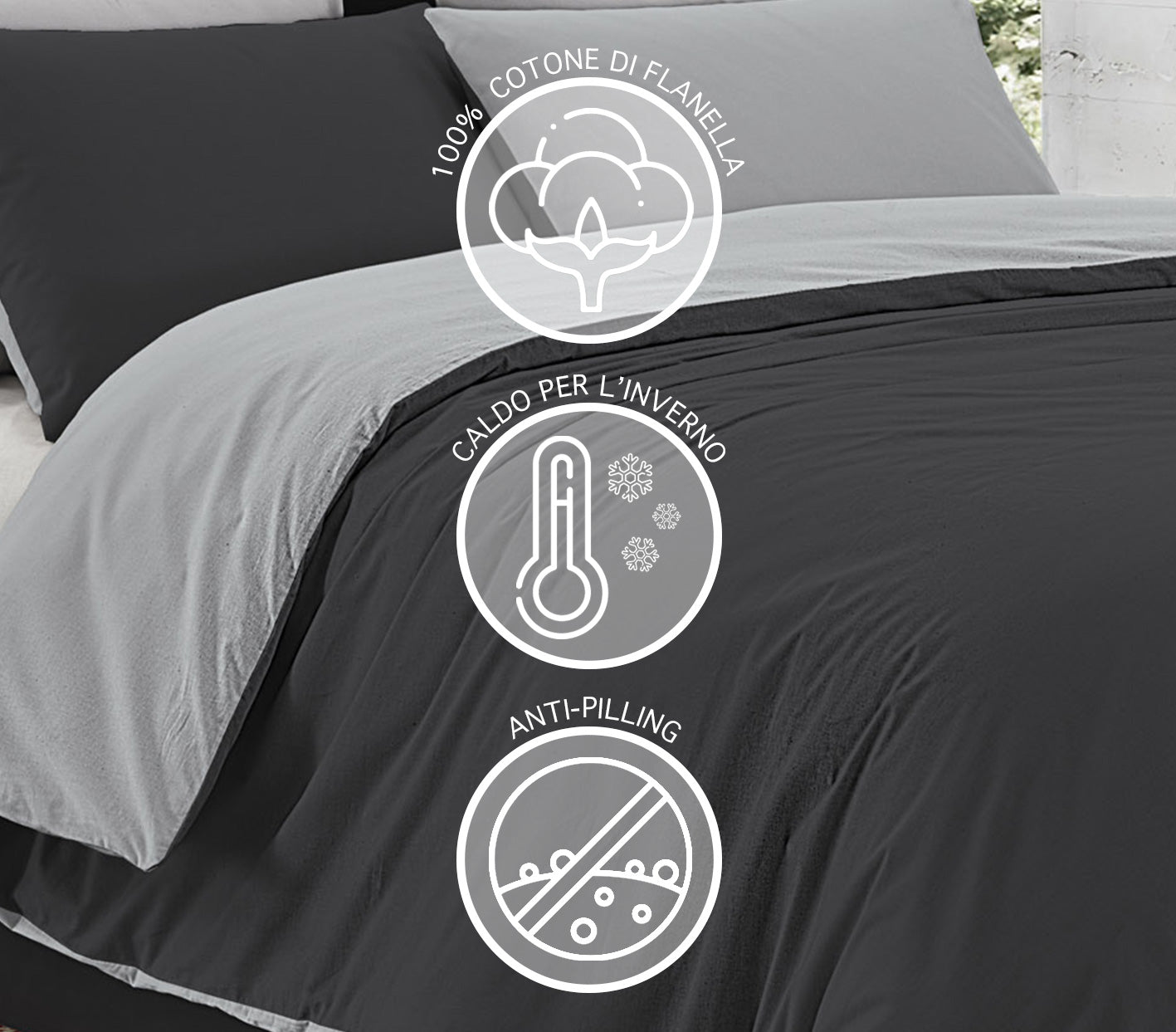 100% cotone con trattamento antipilling, questa Parure Copripiumino in Flanella Felpato Bicolore è lavabile a 30° in lavatrice ed è composta da sacco copripiumino Double Face e due federe Double Face. Dimensioni: Matrimoniale: Sacco 200x250 cm + 40 cm di Patella, 2 federe 50x80 cm. Colori atossici e resistenti, massimo comfort. Praticità di vestizione con la banda patella da infilare sotto al materasso. Facile da mettere.