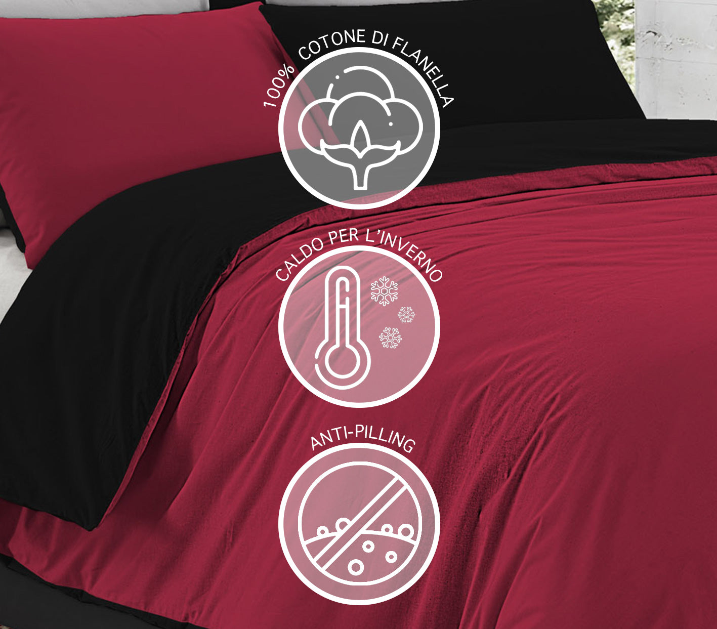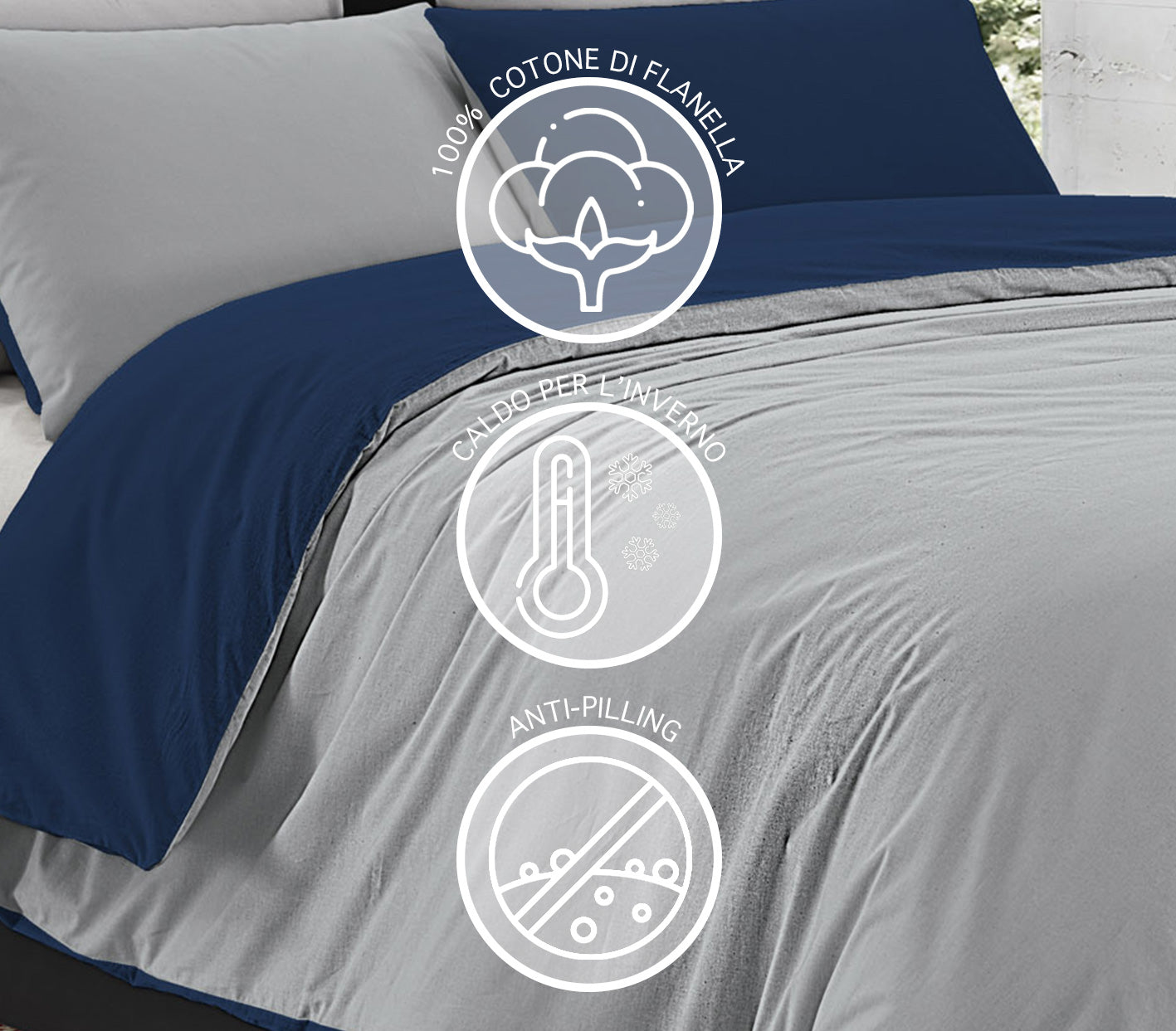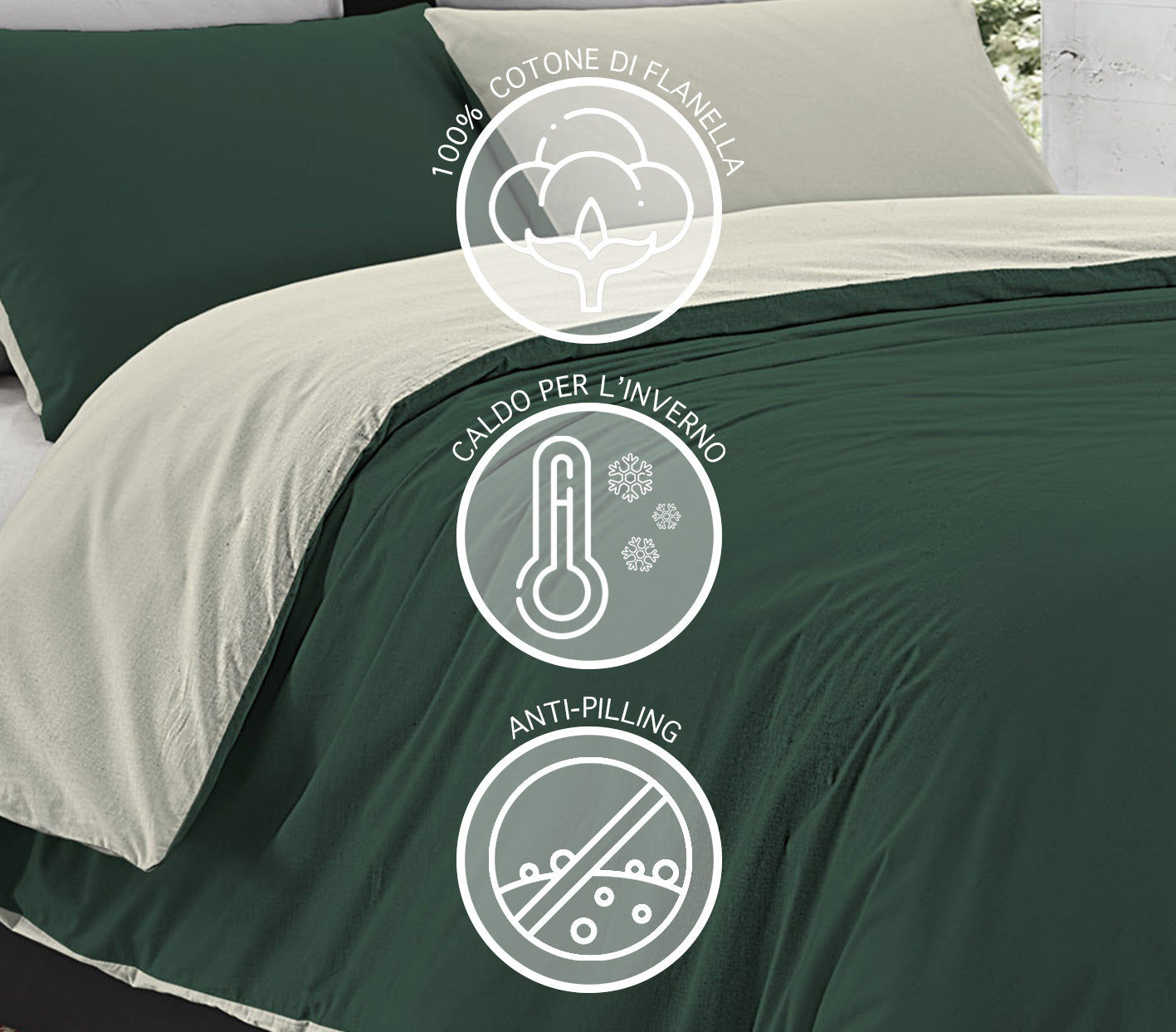 100% cotone con trattamento antipilling, questa Parure Copripiumino in Flanella Felpato Bicolore è lavabile a 30° in lavatrice ed è composta da sacco copripiumino Double Face e due federe Double Face. Dimensioni: Matrimoniale: Sacco 200x250 cm + 40 cm di Patella, 2 federe 50x80 cm. Colori atossici e resistenti, massimo comfort. Praticità di vestizione con la banda patella da infilare sotto al materasso. Facile da mettere.