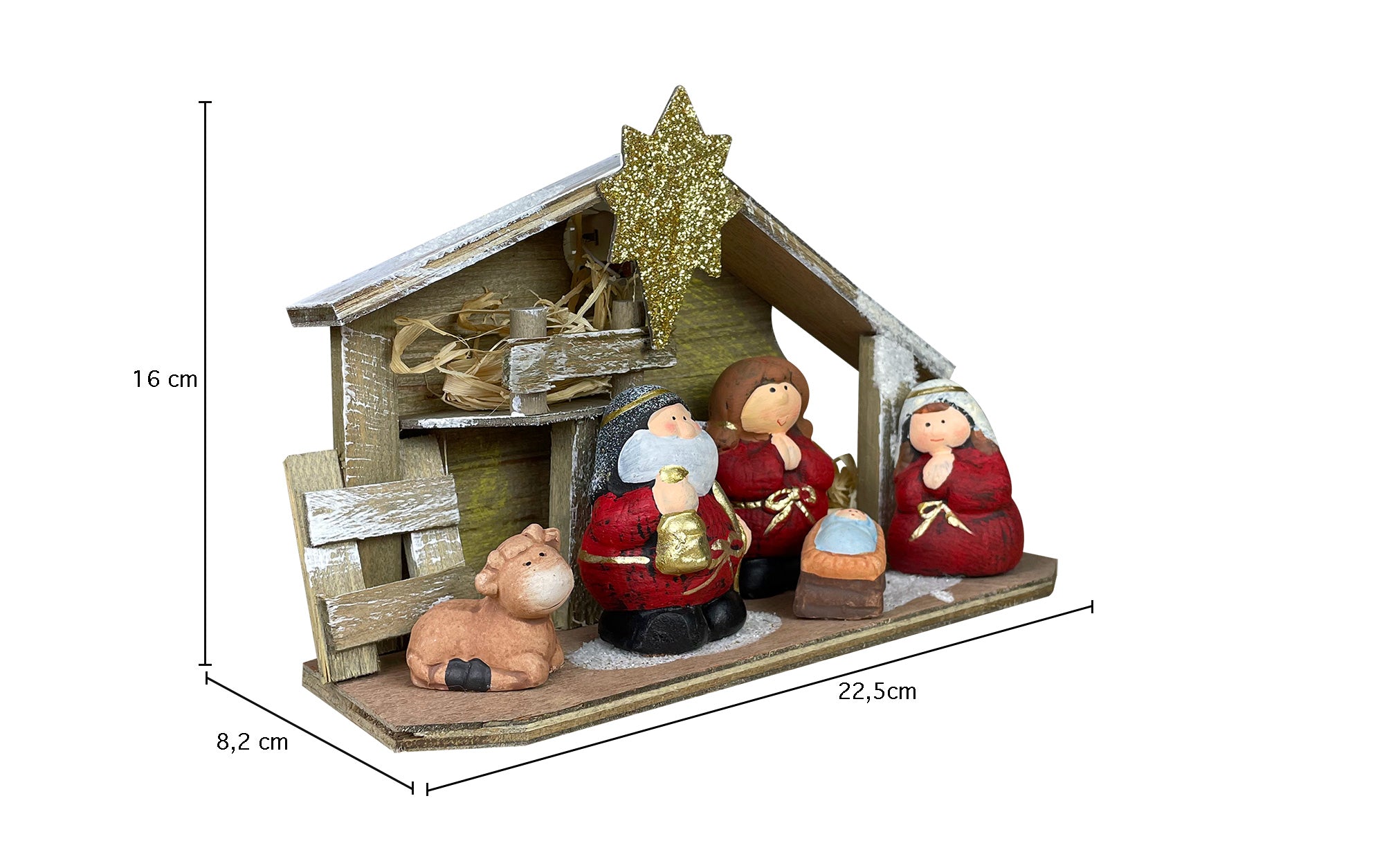 Questo presepio, interamente realizzato in terracotta con una struttura in legno, è decorato a mano con 4 personaggi: Gesù, Giuseppe, Maria e Babbo Natale. Le sue dimensioni sono di 16 cm di altezza, 8,2 cm di larghezza e 22,50 cm di lunghezza. Può essere alimentato grazie alla luce sfavillante che illumina il presepio attraverso una lampadina interna collocata sul retro e accesa tramite un bottone. Ideale per chi ama l'atmosfera del Natale, questo prodotto unico e moderno aggiunge innovazione alla tradizione.