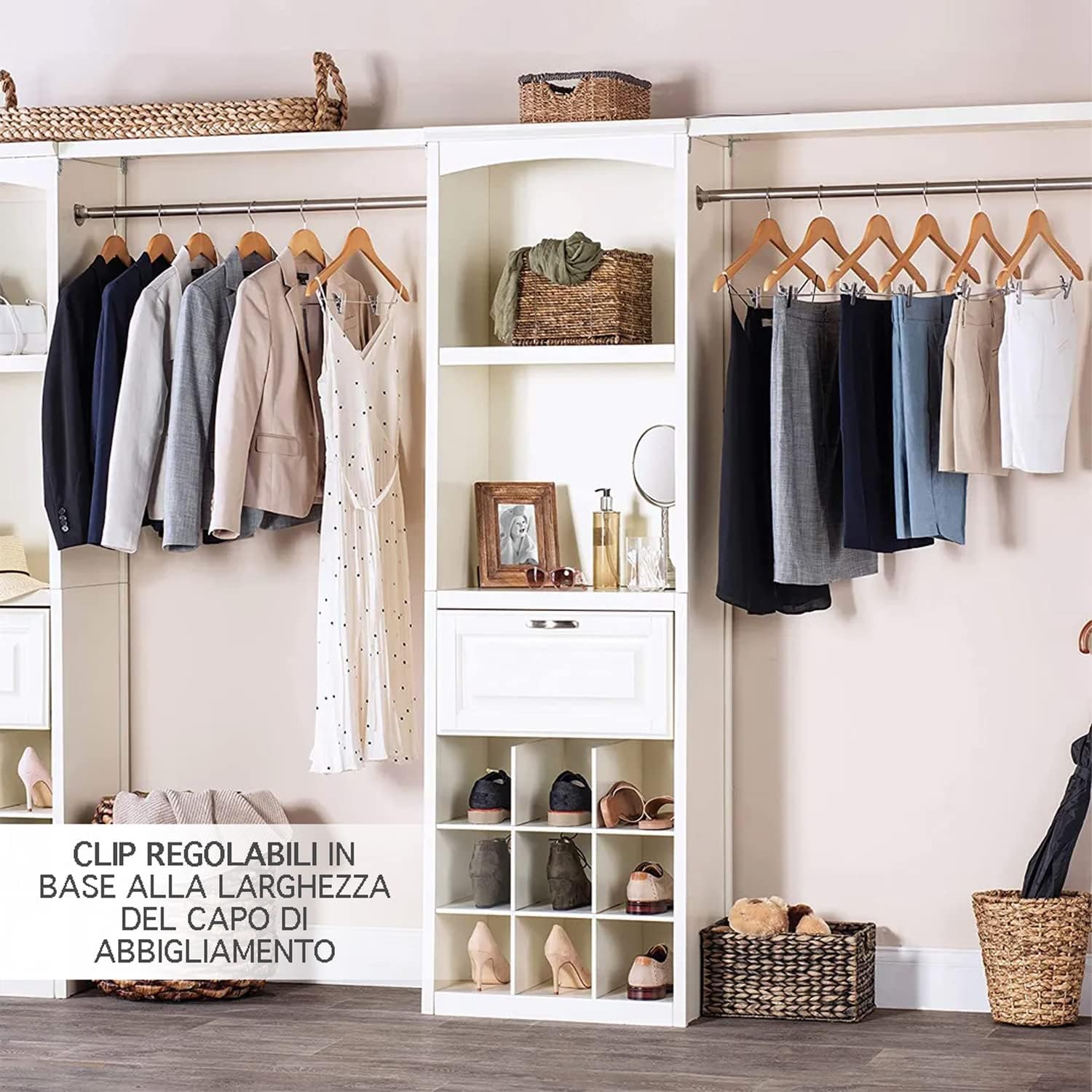 ✔️Regolabili in larghezza in modo da appendere gonne e pantaloni di qualsiasi dimensione, la parte superiore ben sagomata con scanalature consente di appendere con facilità giacce e camicie