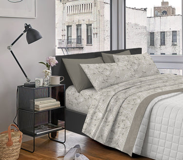 Misura Matrimoniale Lenzuolo Sotto con angoli 180 x 200 + 23 Cm di angoli elastici su tutto il perimetro Lenzuolo Sopra 240 x 280 Cm 2 Federe con patella 50 x 80 Cm