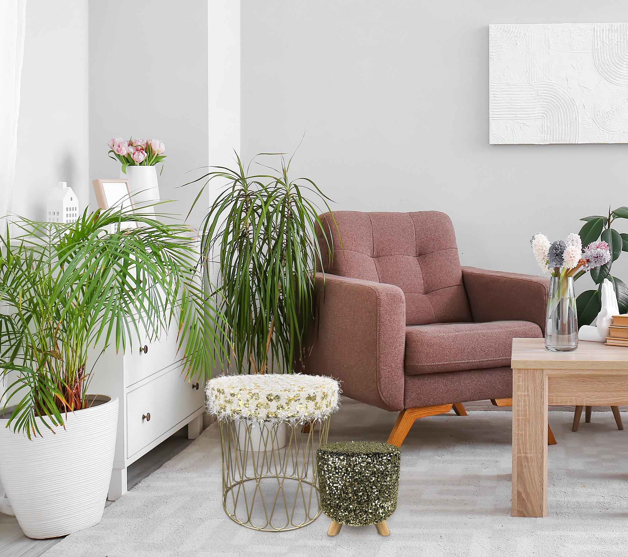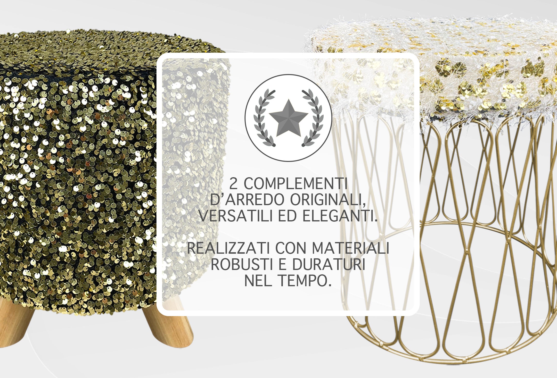 Qualità: Interamente realizzati selezionando materiali di qualità in morbido tessuto rivestito da paillettes che donano una piacevole luminosità all'ambiente , struttura robusta sia quella in metallo del pouf grande sia quella in legno del medio
