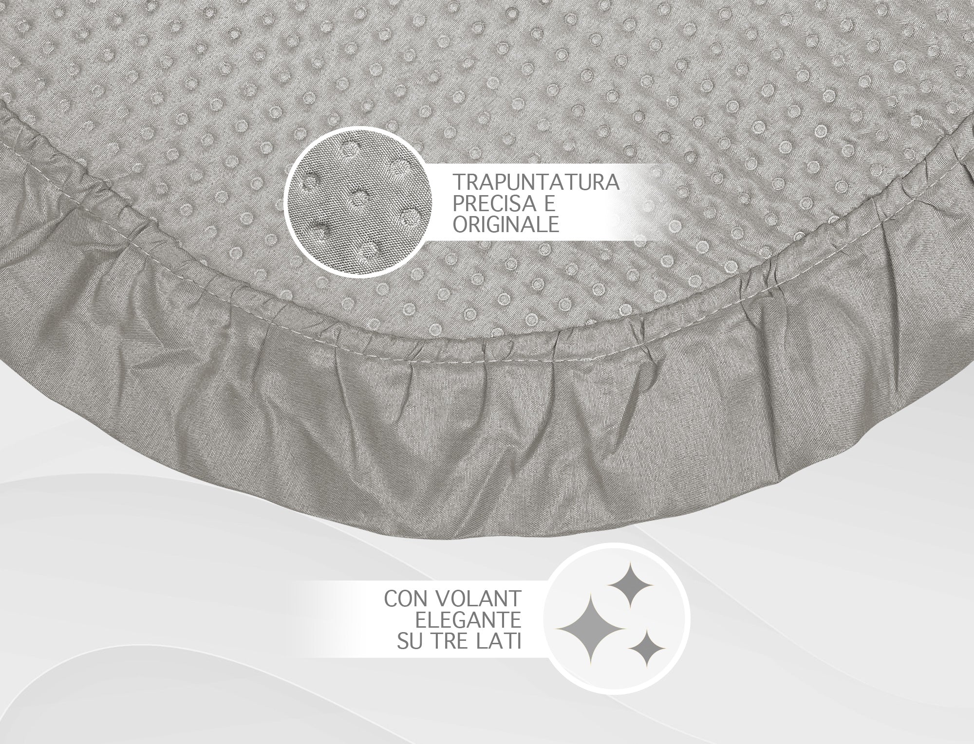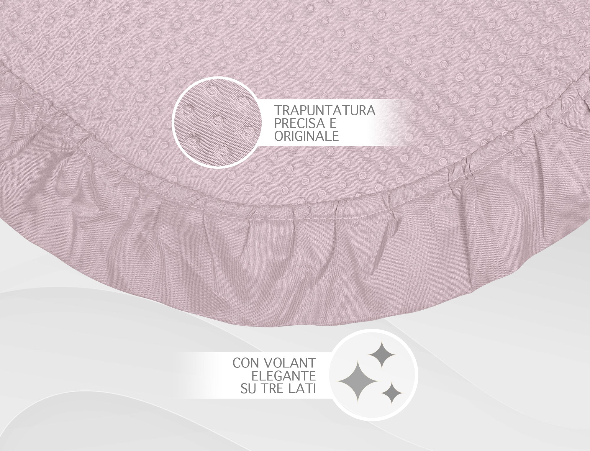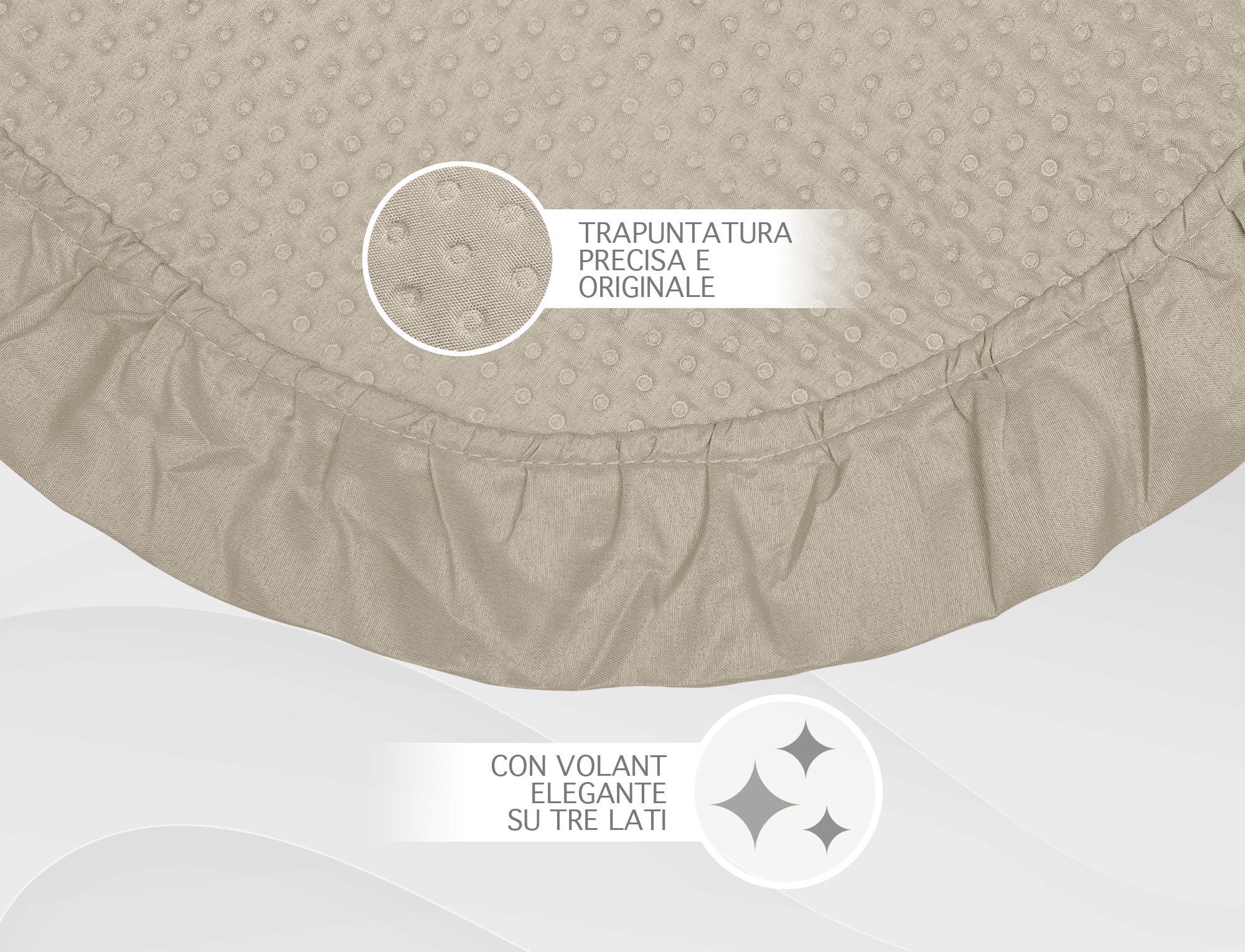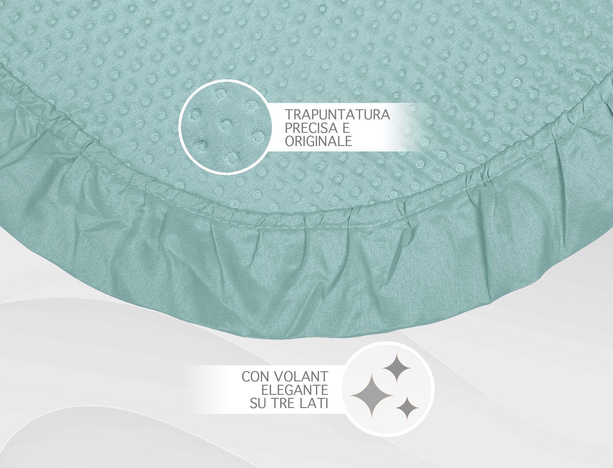 Qualità: Trapuntatura ricamata a laser per curare ogni dettaglio nei particolari,con bellissime ed eleganti balze applicate sui tre lati realizzato in pregiata microfibra con trattamento Manopesca per dare al prodotto una morbidezza unica.