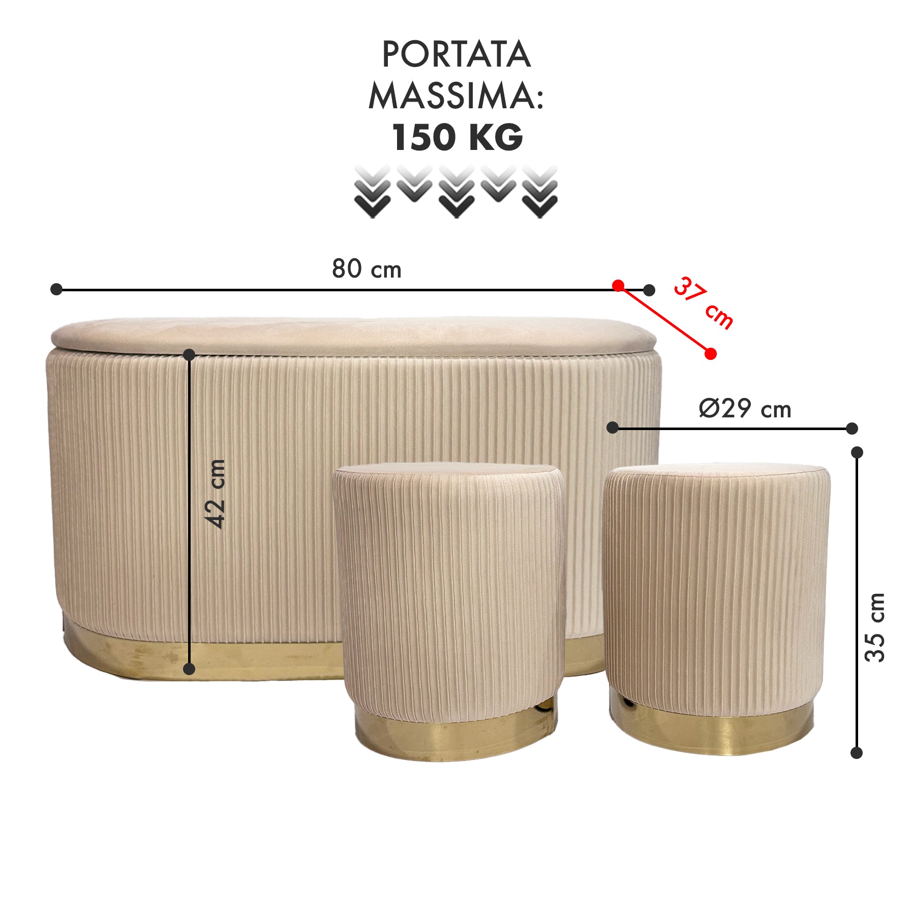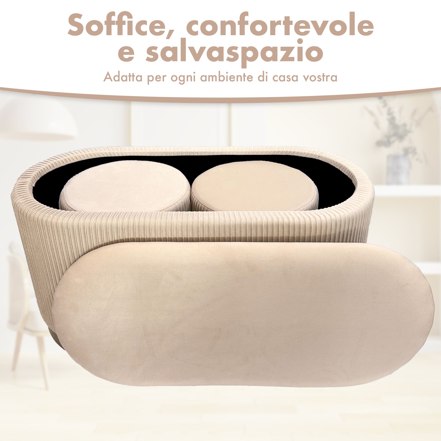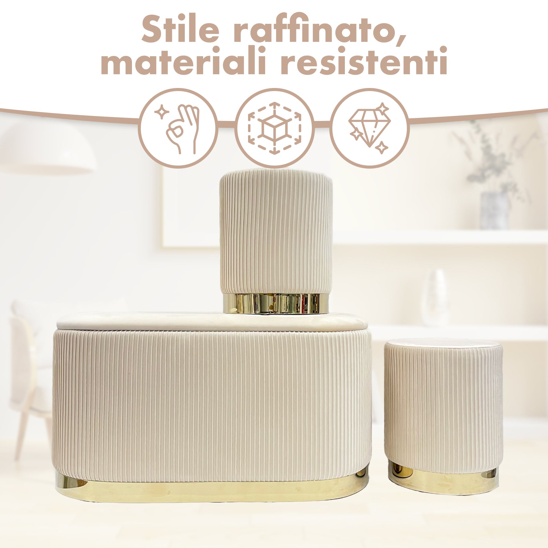 ✔️Set da 3 pouf eleganti – Include 1 pouf grande con contenitore (42x80 cm) e 2 pouf piccoli (29x35 cm).