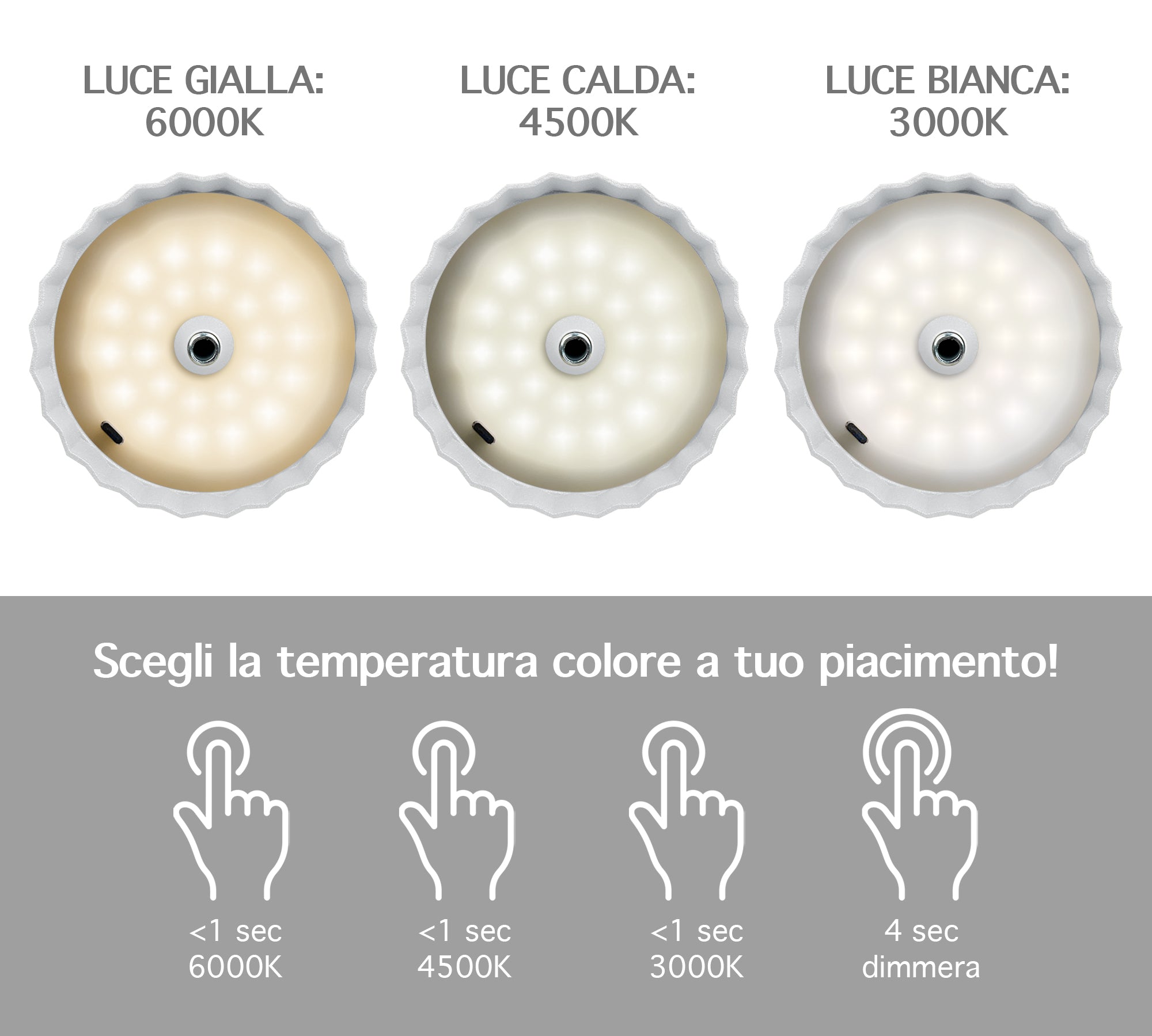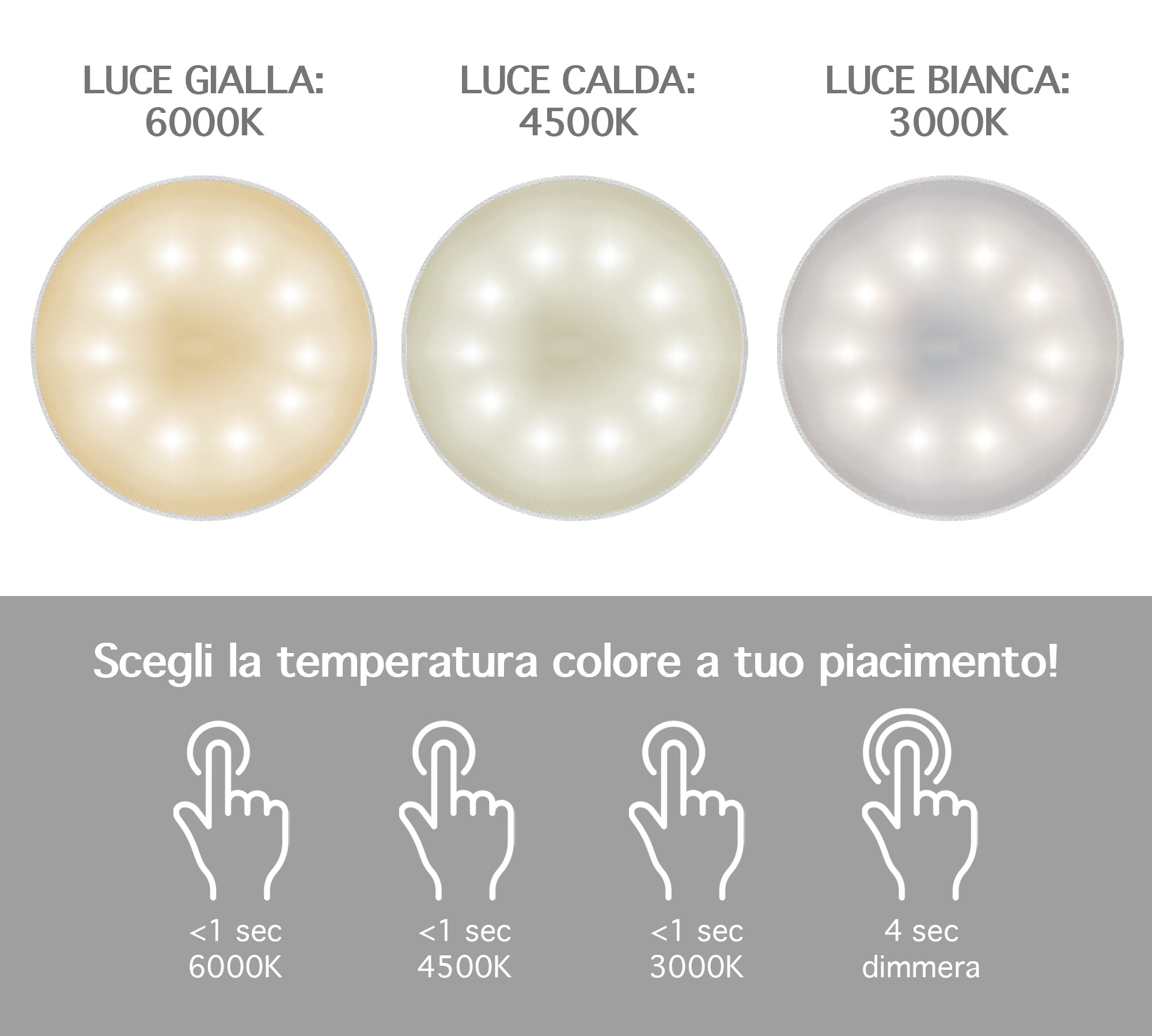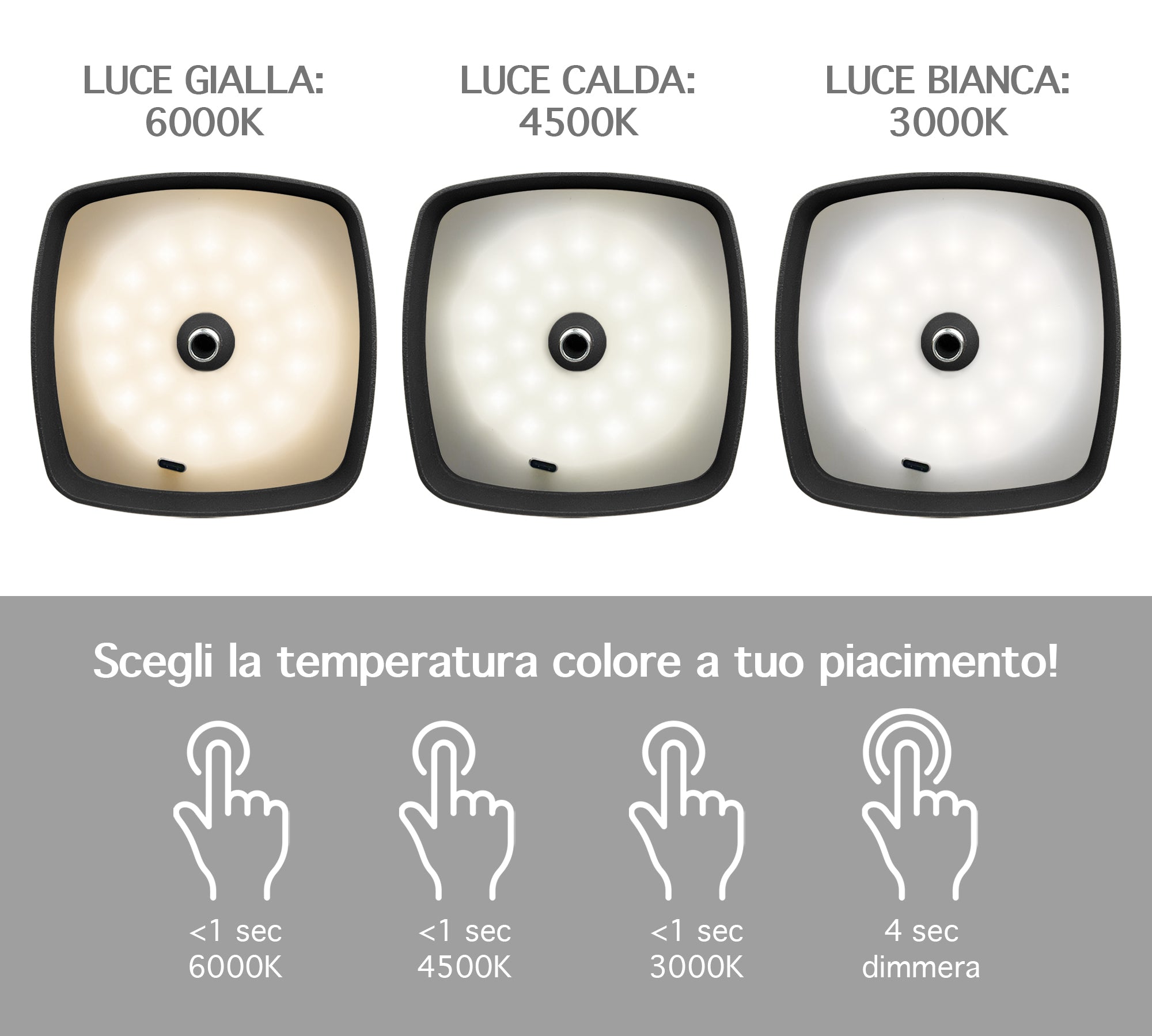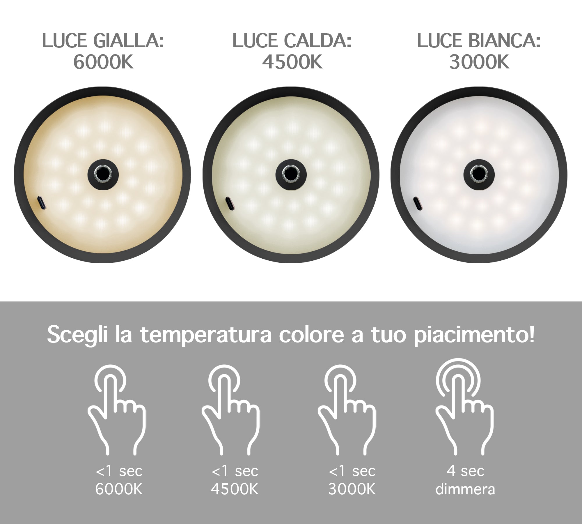 ✔️TOCCO TOUCH DIMMERABILE: Tramite il pulsante Touch Presente sulla parte superiore della lampada con tocchi alternati è possibile cambiare il colore della luce Calda/Fredda/Naturale mentre con un tocco prolungato è possibile regolarne l'intensità ( Funzione Dimmerabile ) Con 3 Diverse temperatura di calore 3000/4500/6000 k