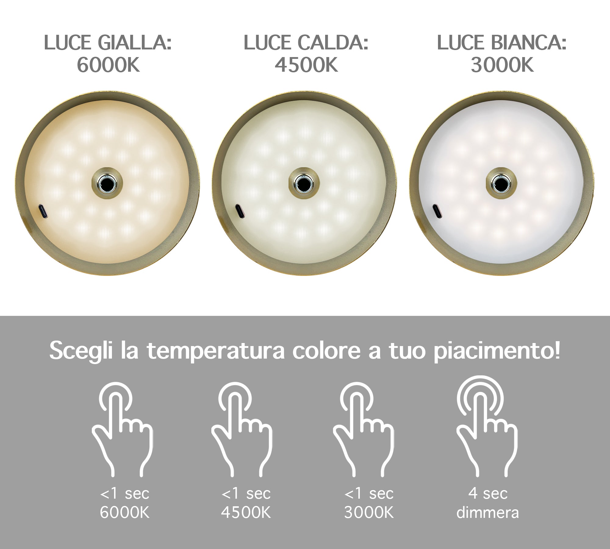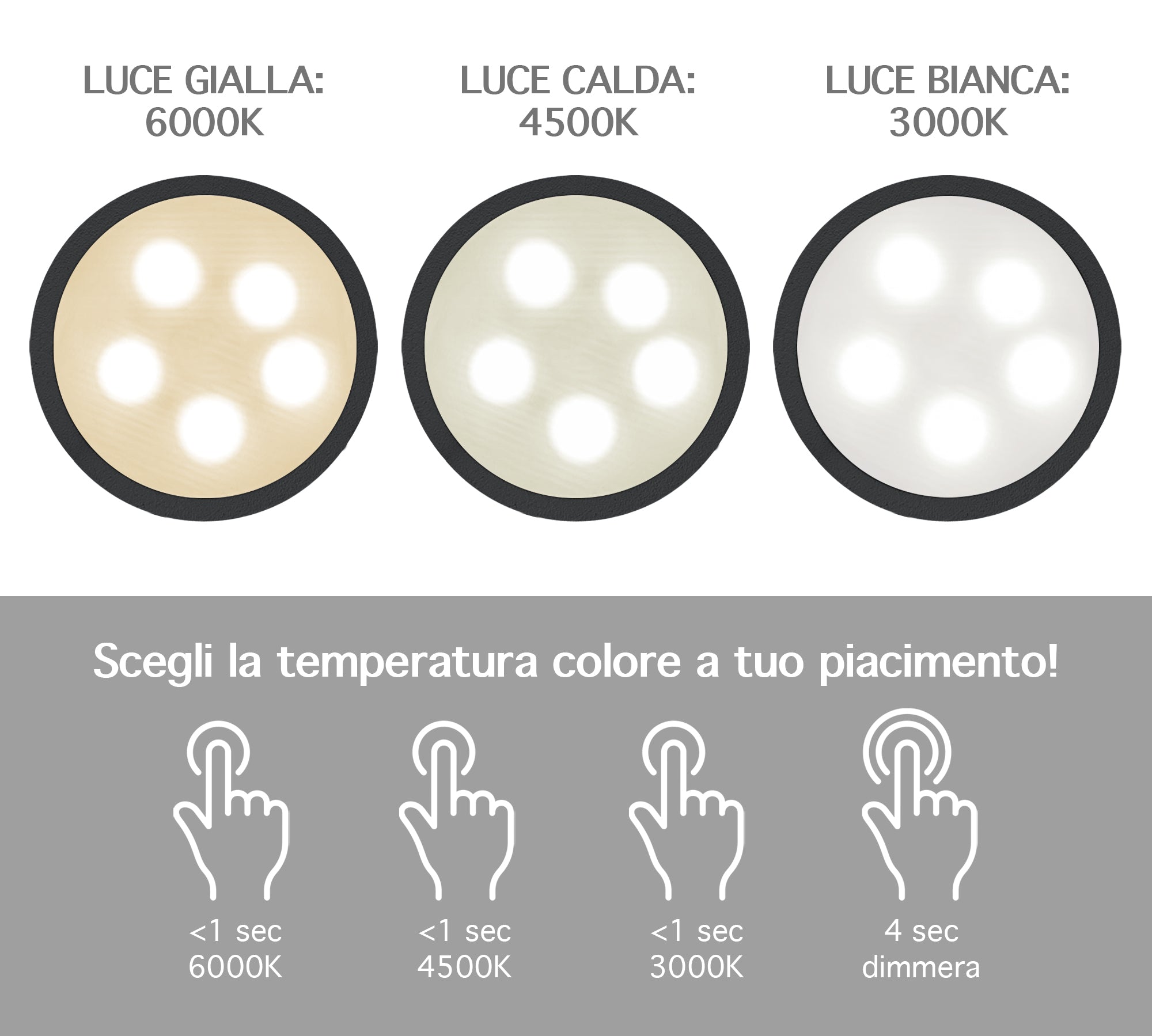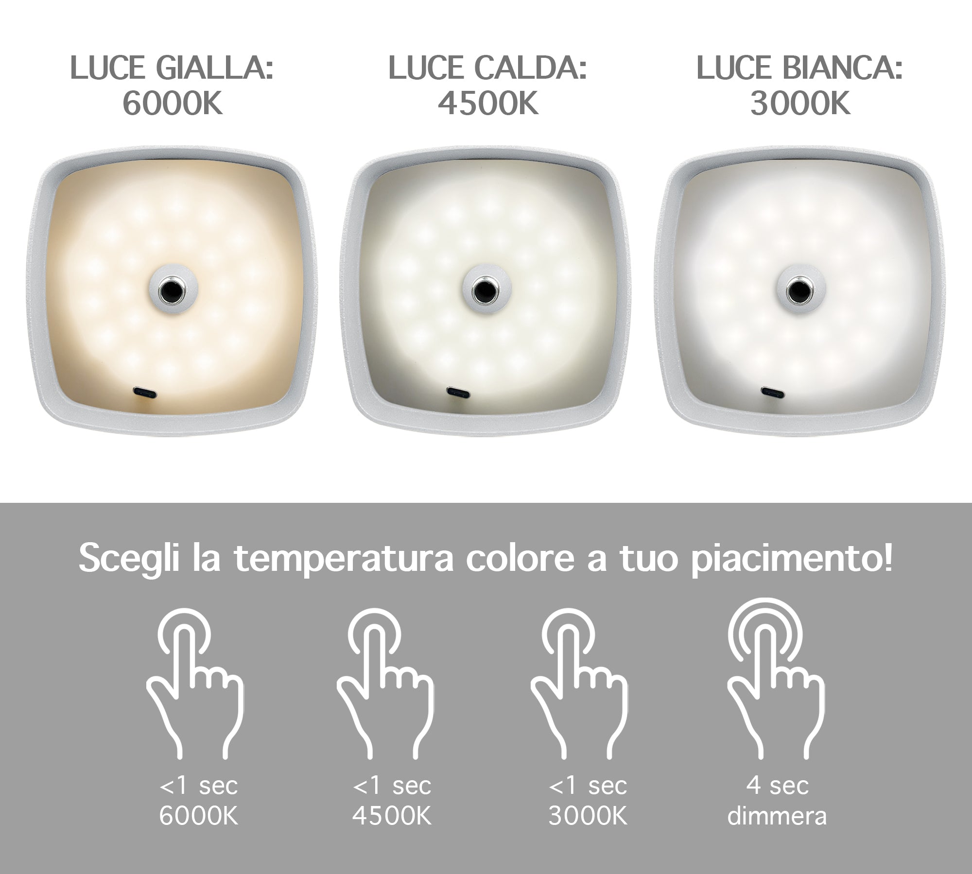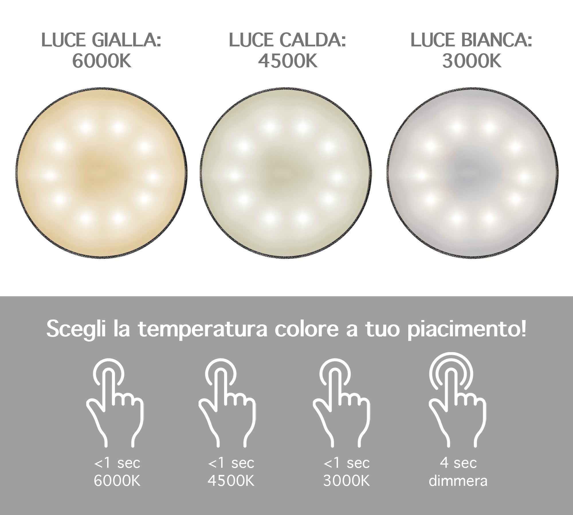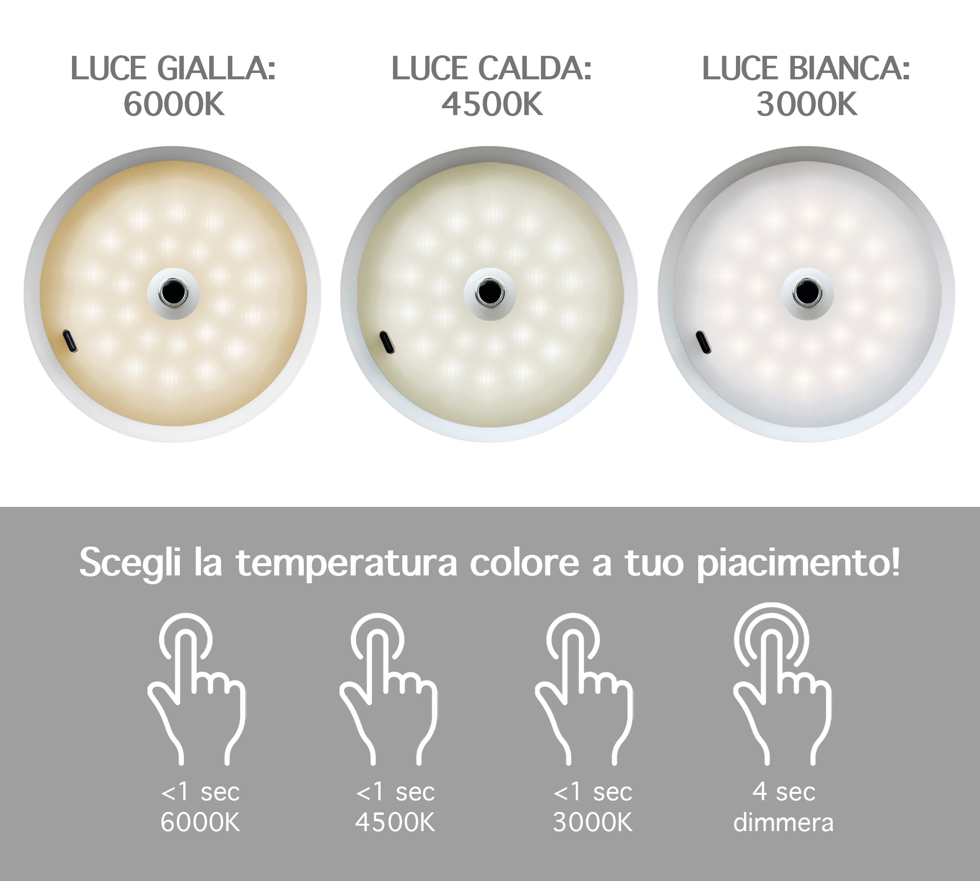 ✔️TOCCO TOUCH DIMMERABILE: Tramite il pulsante Touch Presente sulla parte superiore della lampada con tocchi alternati è possibile cambiare il colore della luce Calda/Fredda/Naturale mentre con un tocco prolungato è possibile regolarne l'intensità ( Funzione Dimmerabile ) Con 3 Diverse temperatura di calore 3000/4500/6000 k