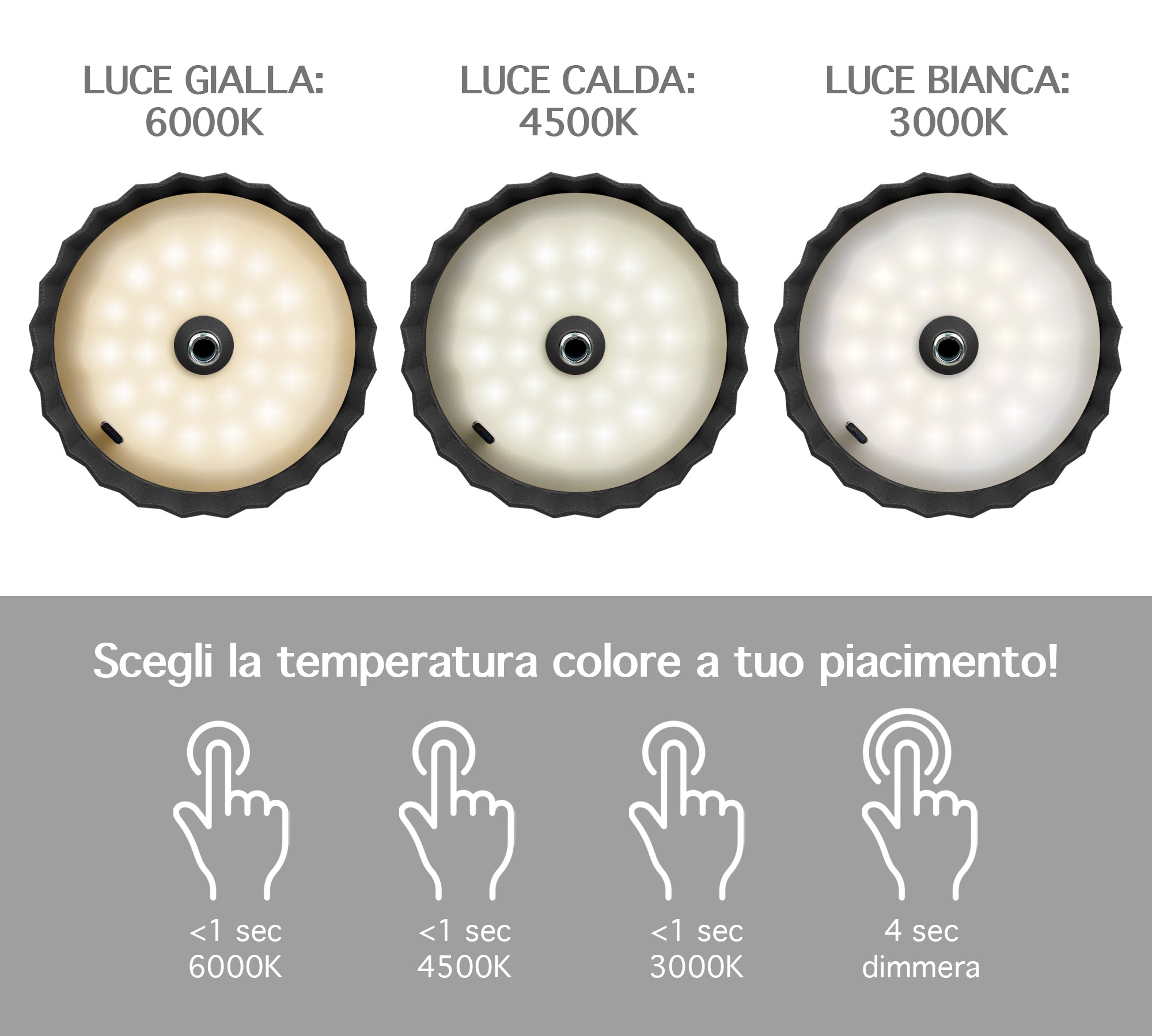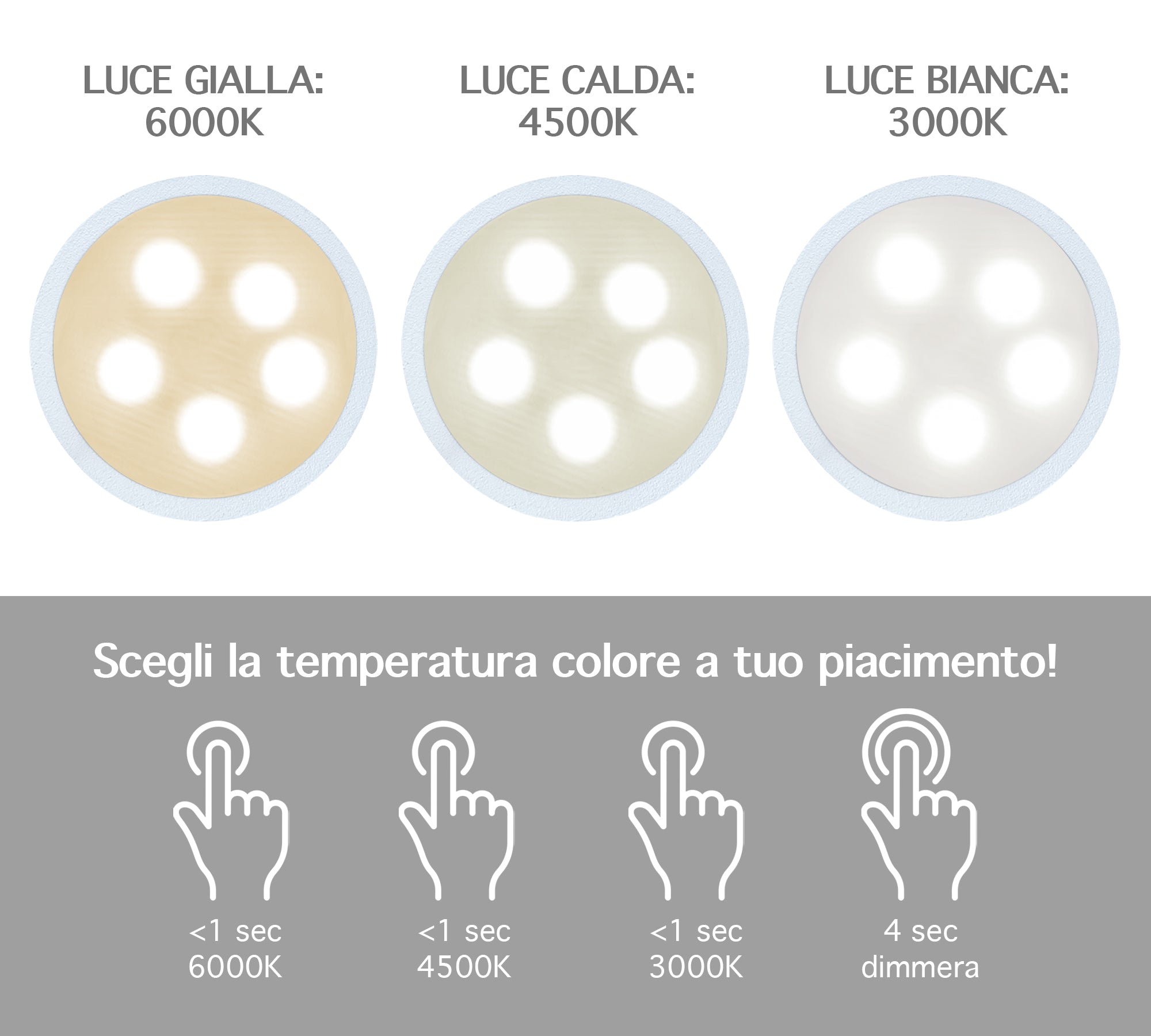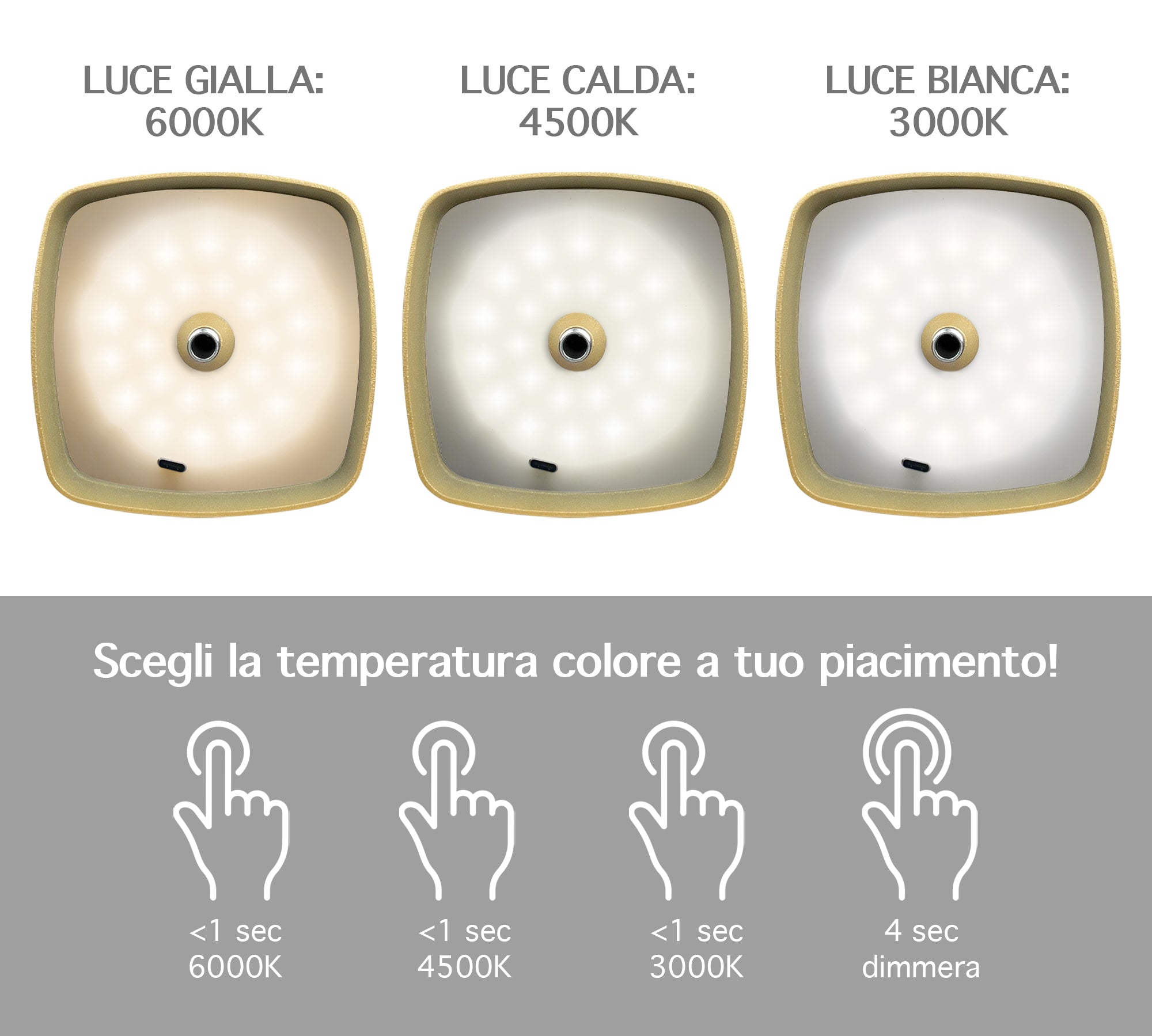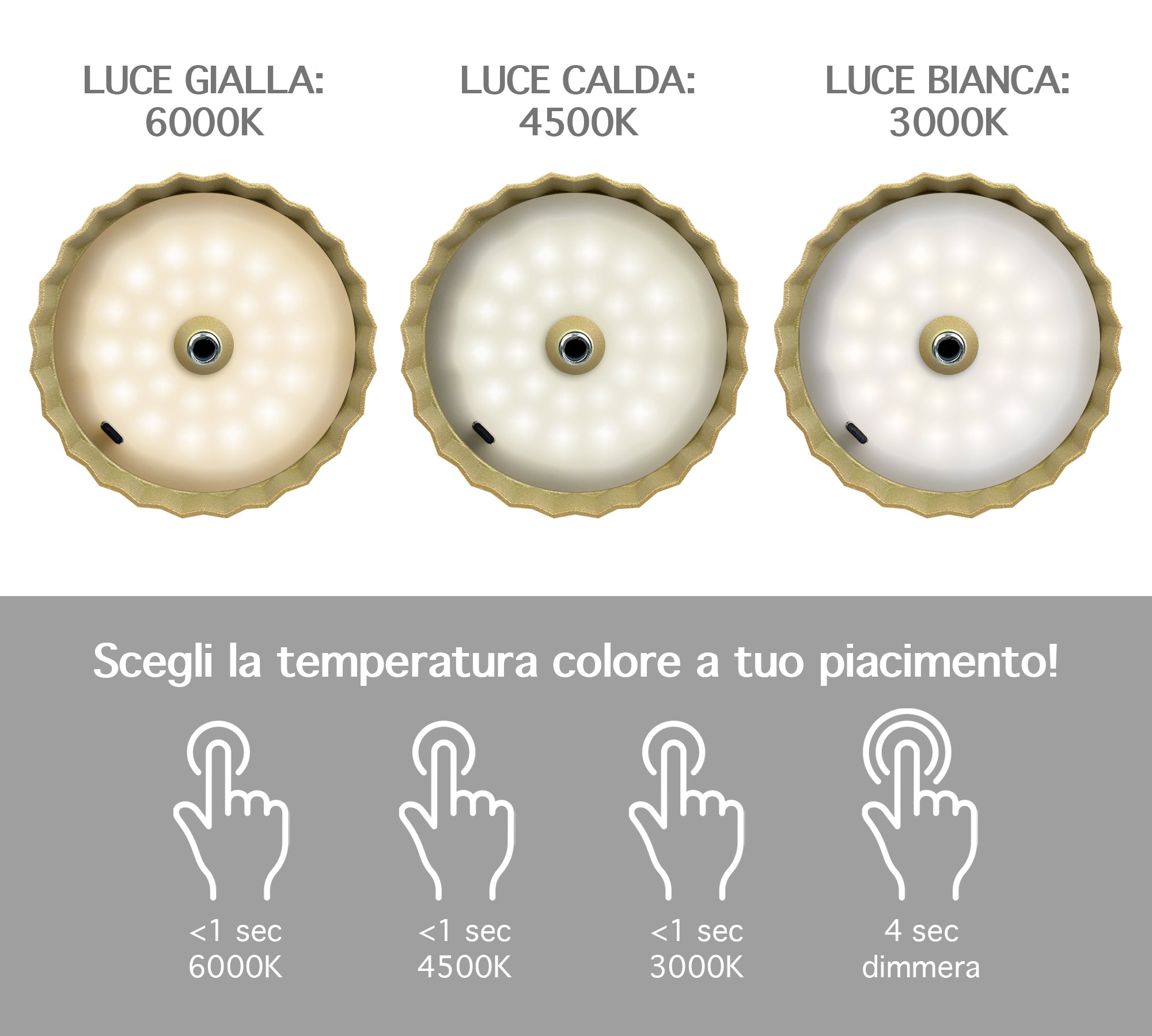✔️TOCCO TOUCH DIMMERABILE: Tramite il pulsante Touch Presente sulla parte superiore della lampada con tocchi alternati è possibile cambiare il colore della luce Calda/Fredda/Naturale mentre con un tocco prolungato è possibile regolarne l'intensità ( Funzione Dimmerabile ) Con 3 Diverse temperatura di calore 3000/4500/6000 k