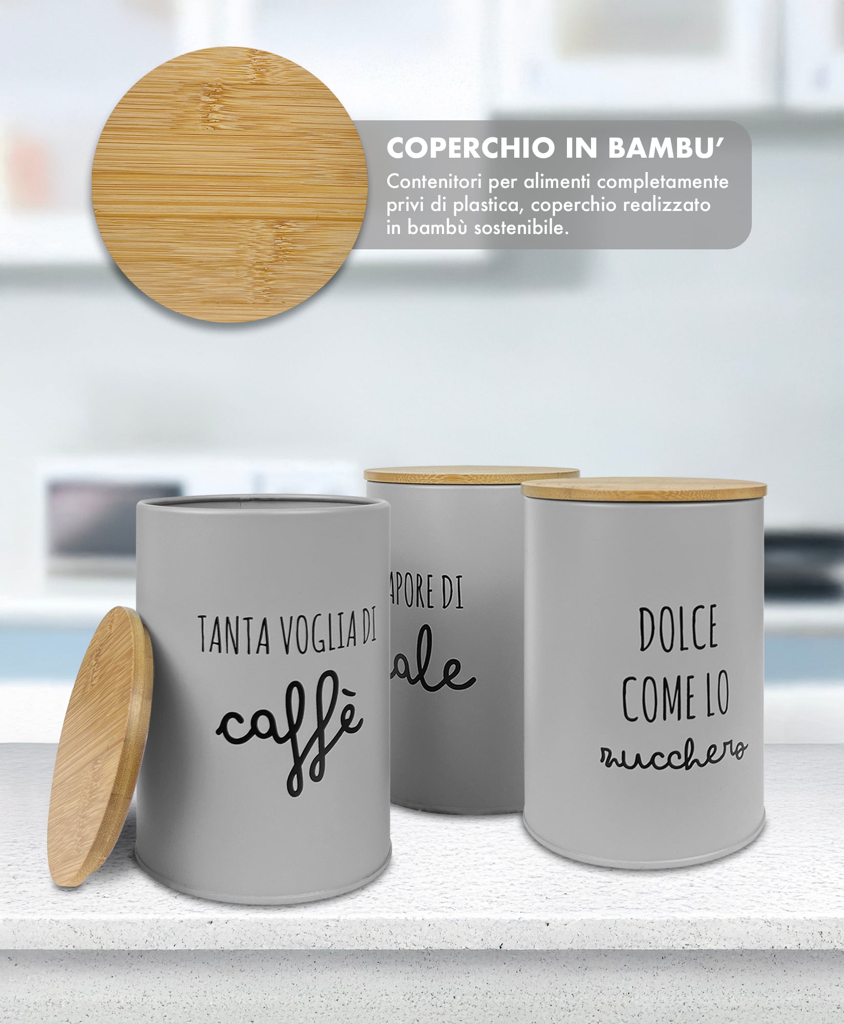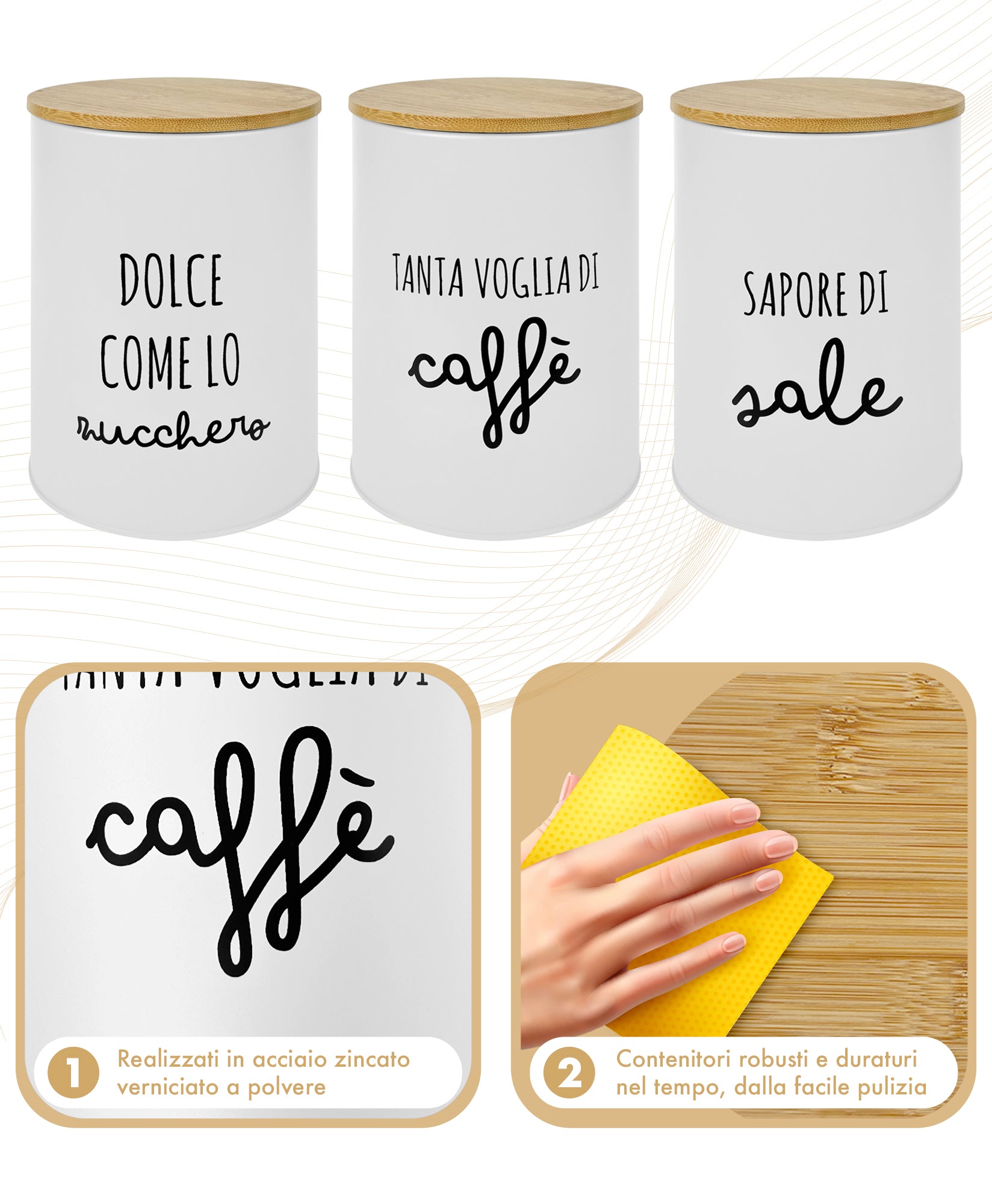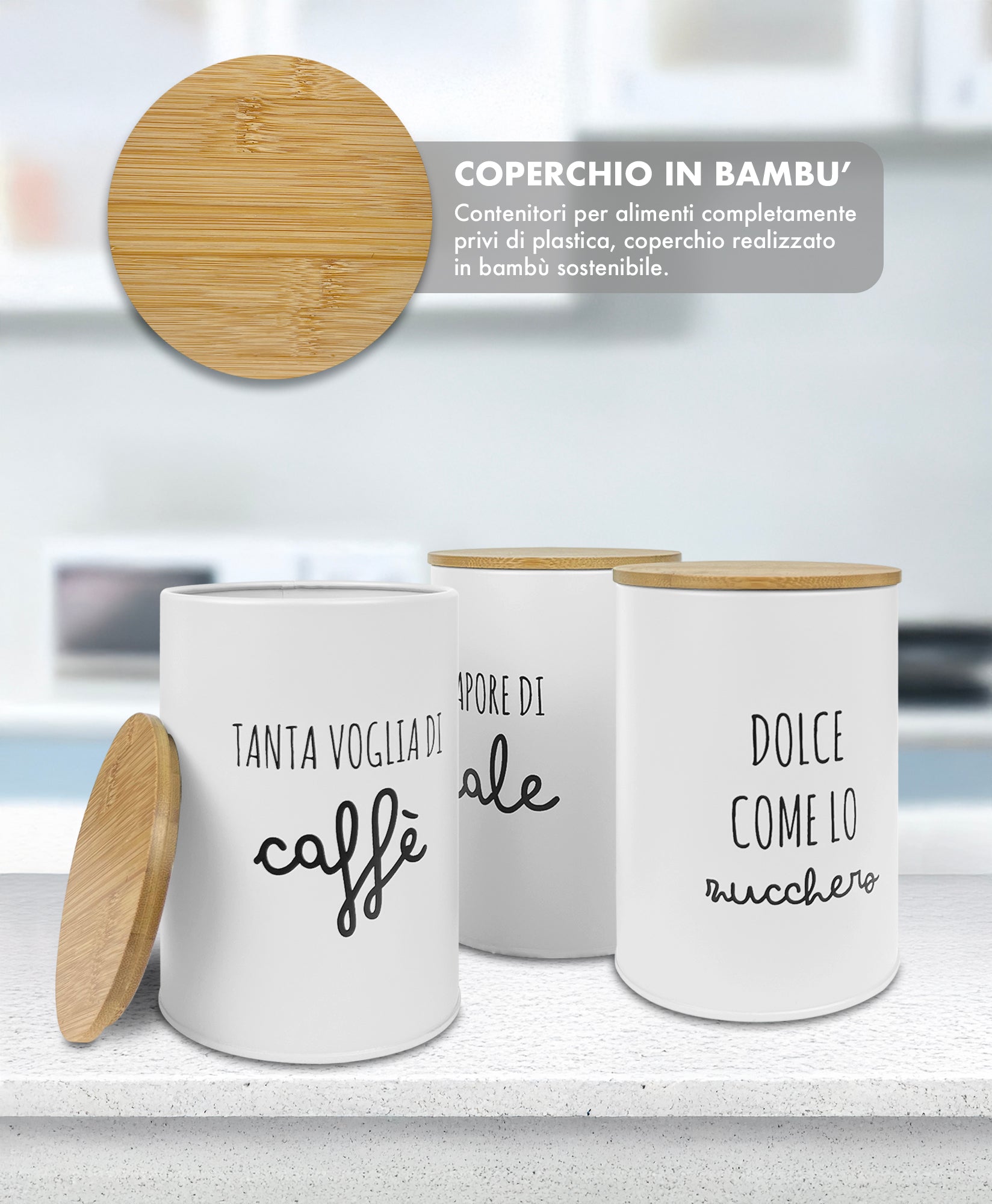 Set 3 Pezzi Barattoli Cucina Contenitori Certificati Contatto Alimentare Contenitore Sale Zucchero Caffè Moderne Scritte Barattolo Con Coperchio Ermetico Legno Bambù Dispenser Organizzatori Alimenti Spezie