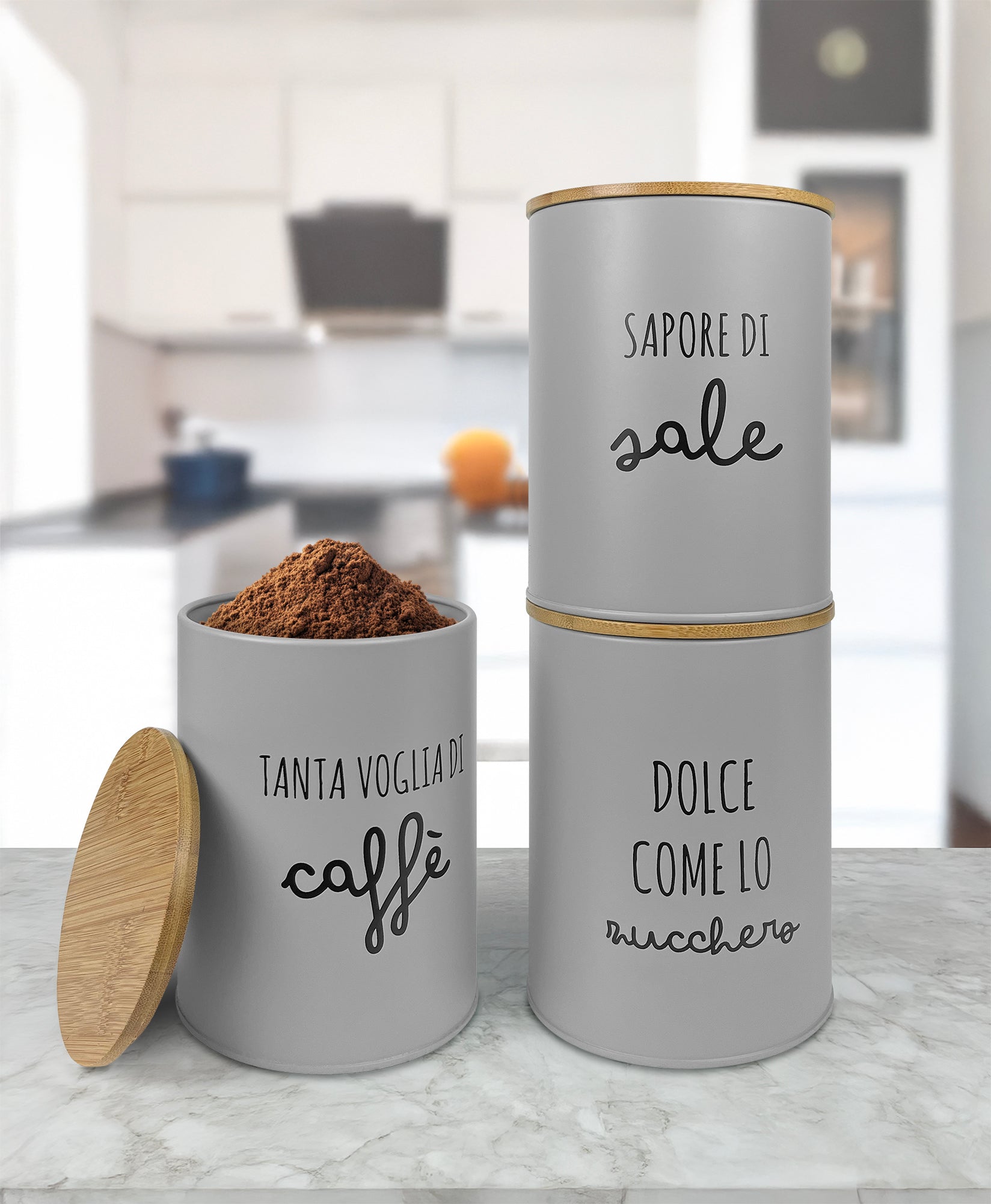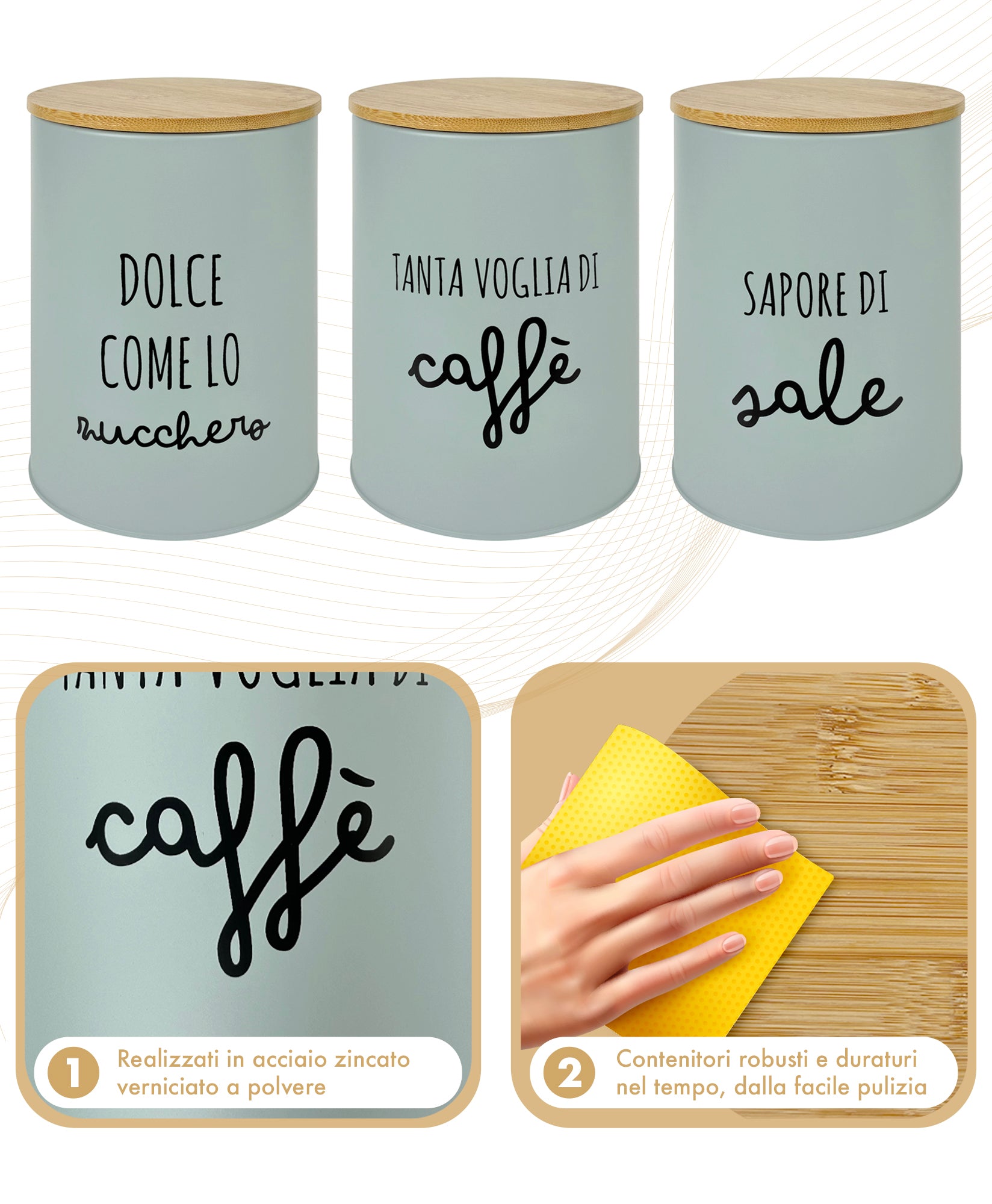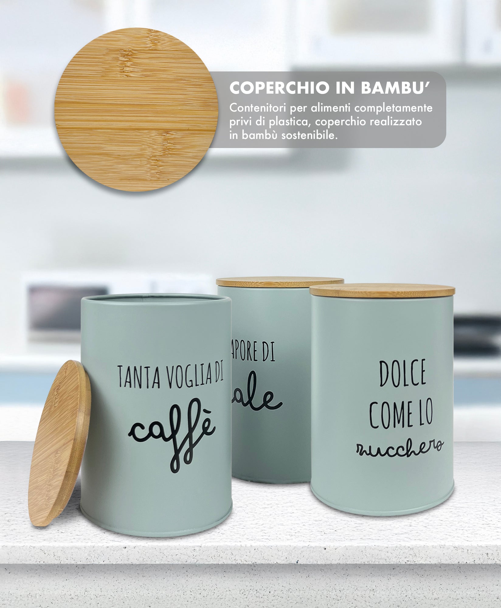 ORGANIZZATORI: ottima soluzione per chi desidera conservare gli alimenti in modo efficace e stiloso. Composto da tre barattoli in metallo, ciascuno dotato di un tappo ermetico in legno di bambù, questo set è progettato per mantenere freschi gli ingredienti, proteggendoli dall'umidità e dall'aria. La scelta dei materiali non solo garantisce una lunga durata, ma conferisce anche un tocco di eleganza e modernità alla cucina.
