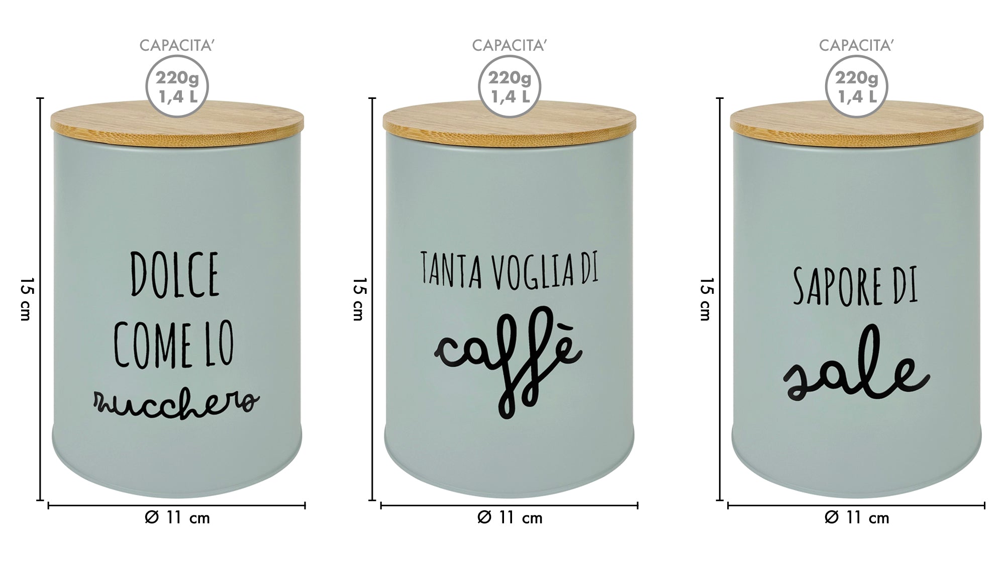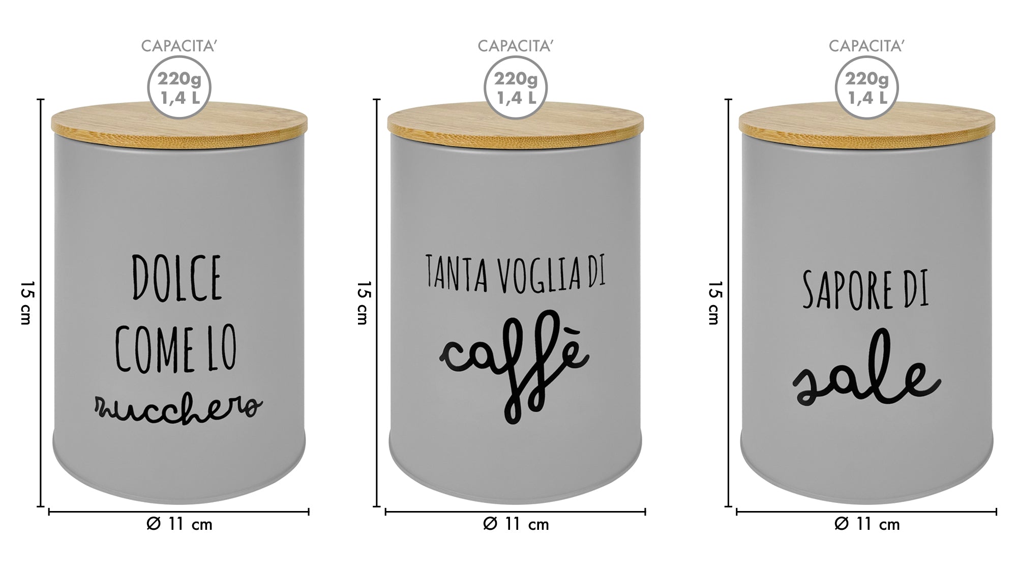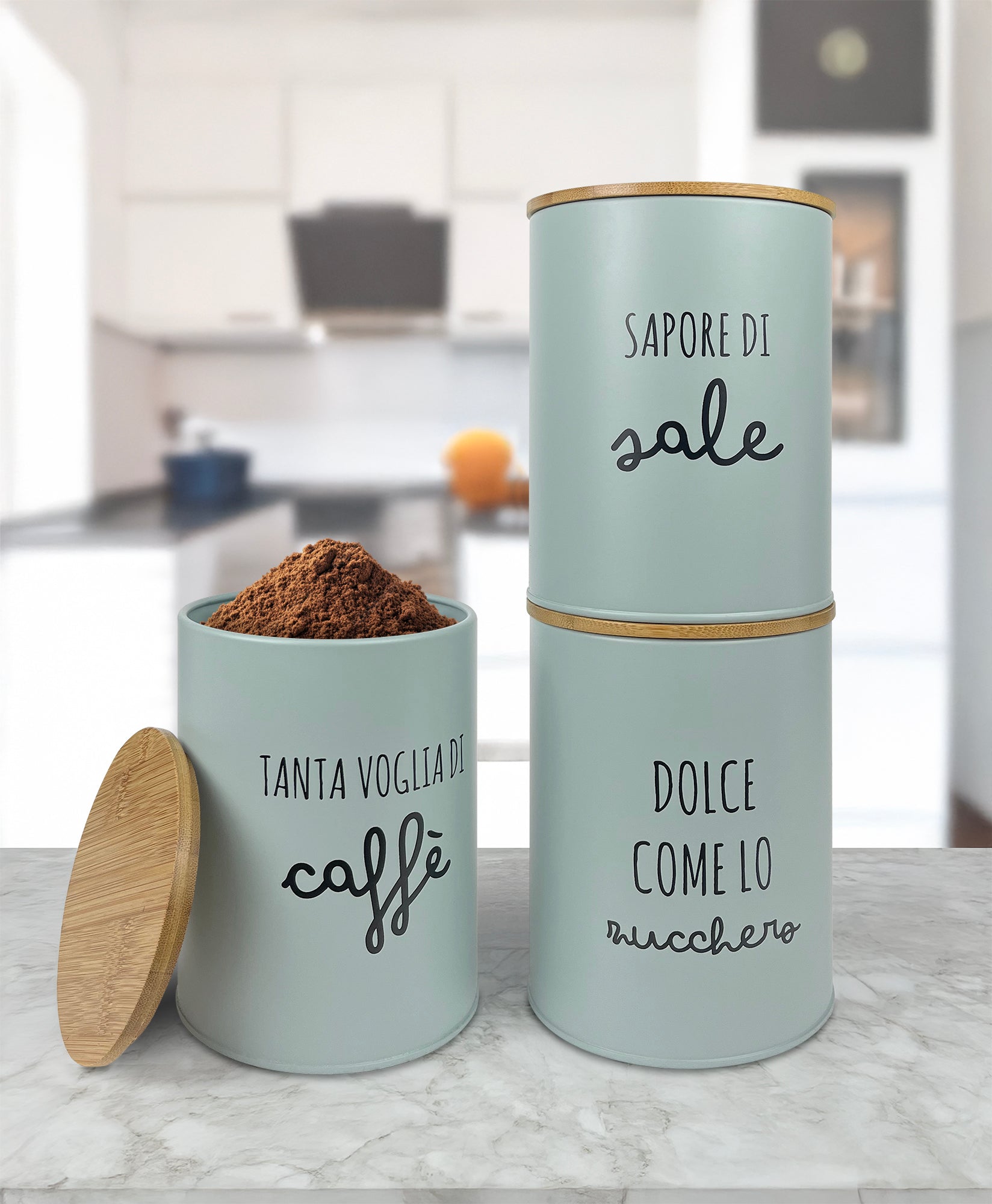 ORGANIZZATORI: ottima soluzione per chi desidera conservare gli alimenti in modo efficace e stiloso. Composto da tre barattoli in metallo, ciascuno dotato di un tappo ermetico in legno di bambù, questo set è progettato per mantenere freschi gli ingredienti, proteggendoli dall'umidità e dall'aria. La scelta dei materiali non solo garantisce una lunga durata, ma conferisce anche un tocco di eleganza e modernità alla cucina.