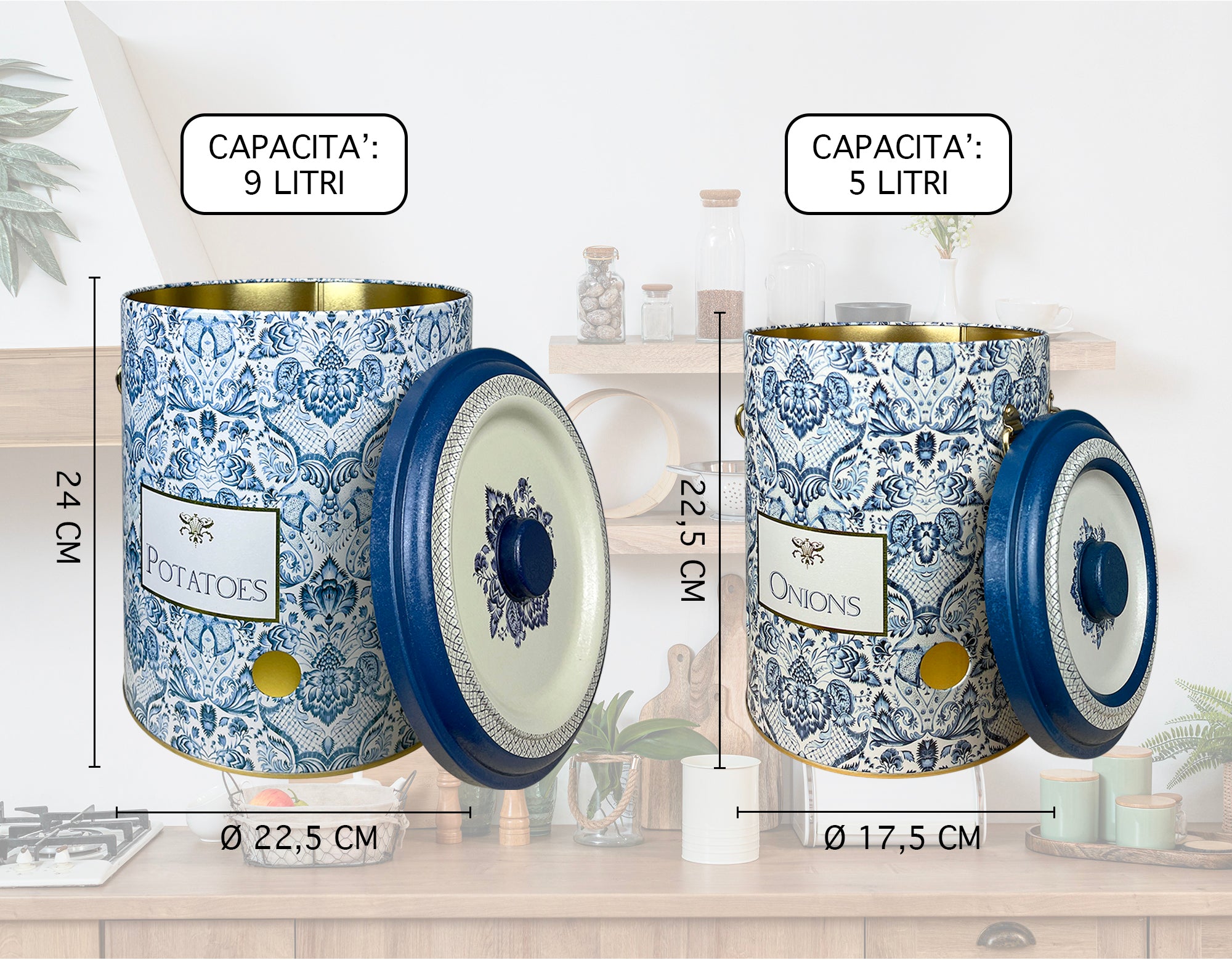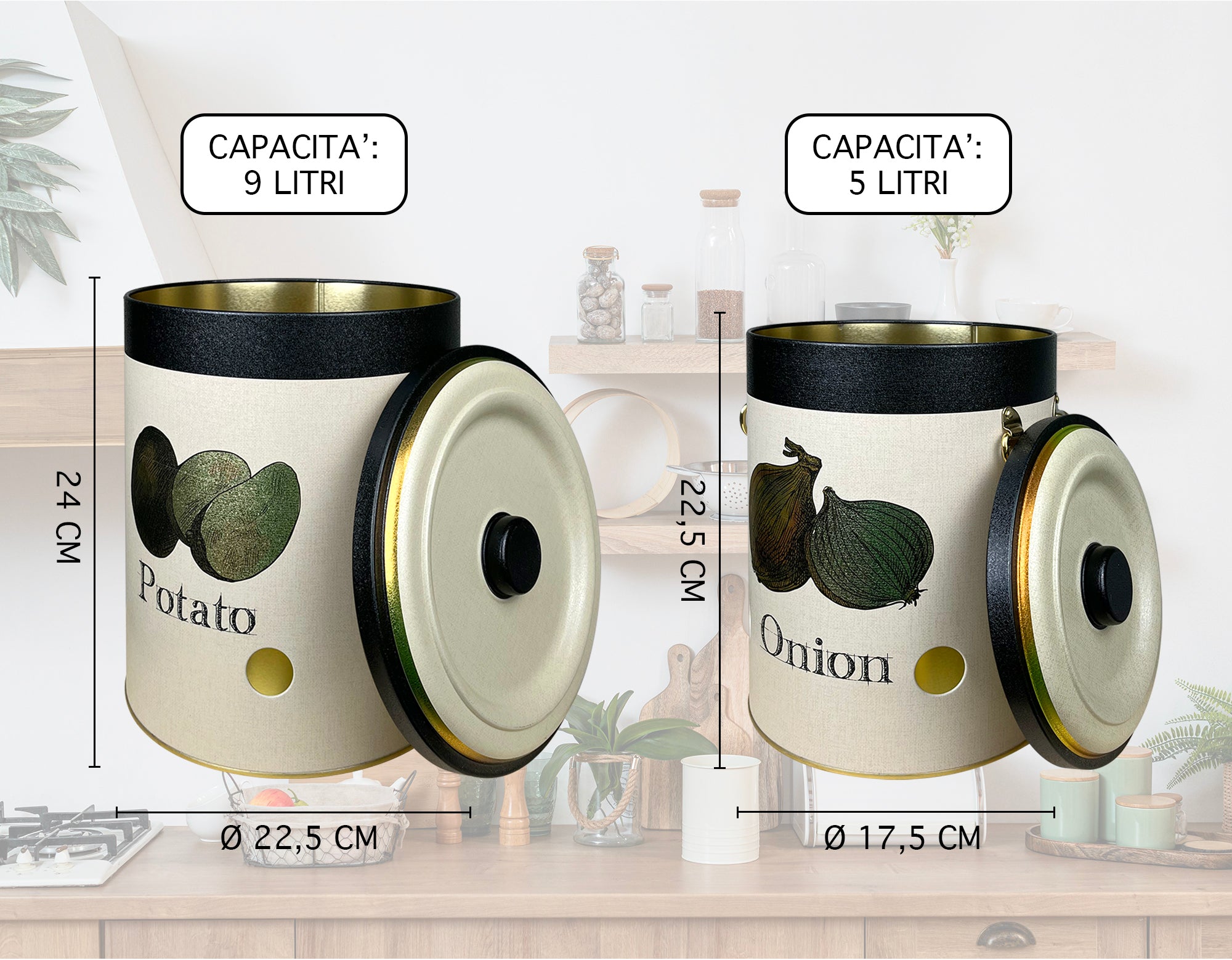 Dimensioni: I contenitori sono impilabili uno dentro l'altro Contenitore Grande Altezza 24 Cm Diametro 22.5 Cm Capacità 9 Litri Contenitore Medio Altezza 22.5 Cm Diametro 17.5 Cm Capacità 5 Litri