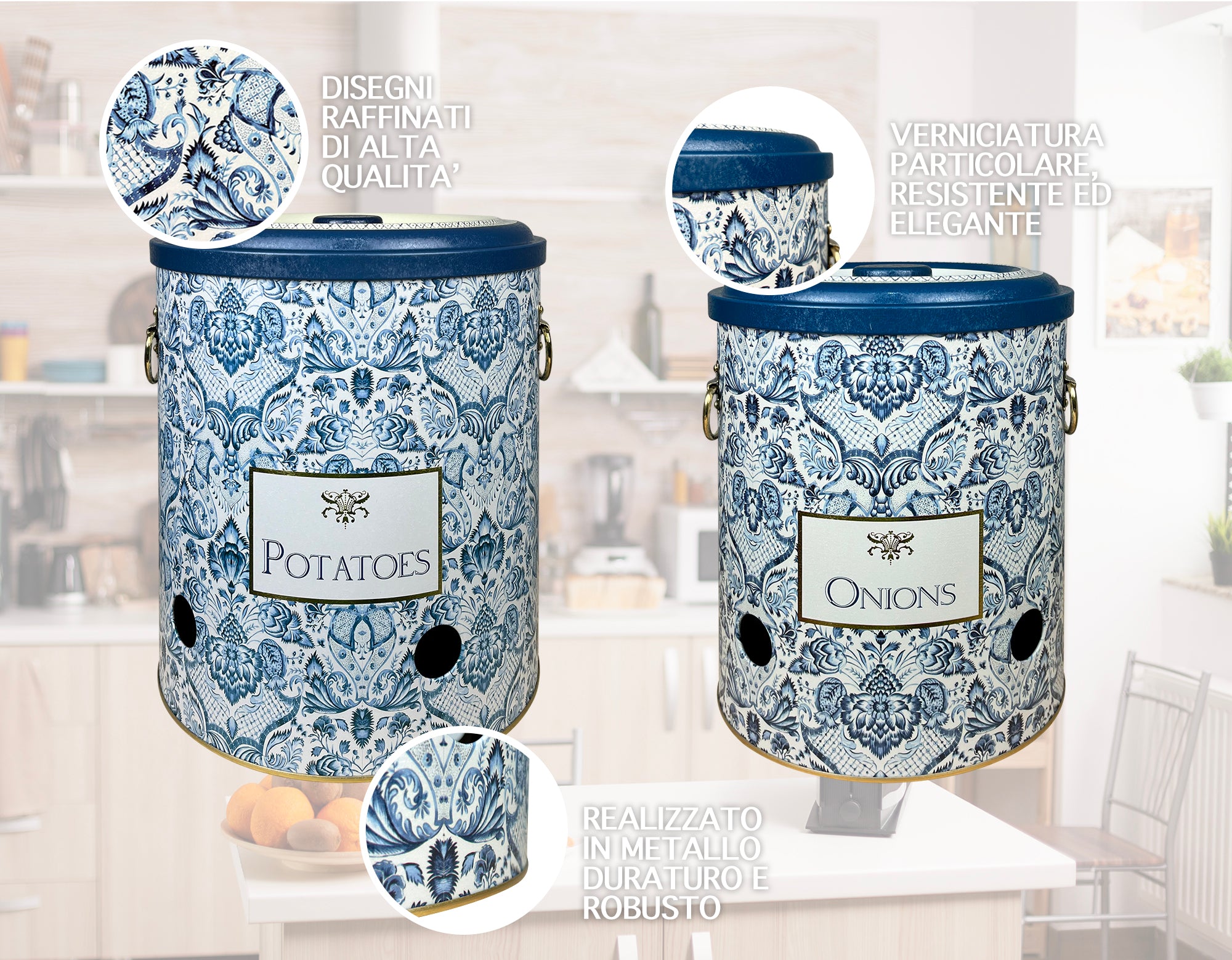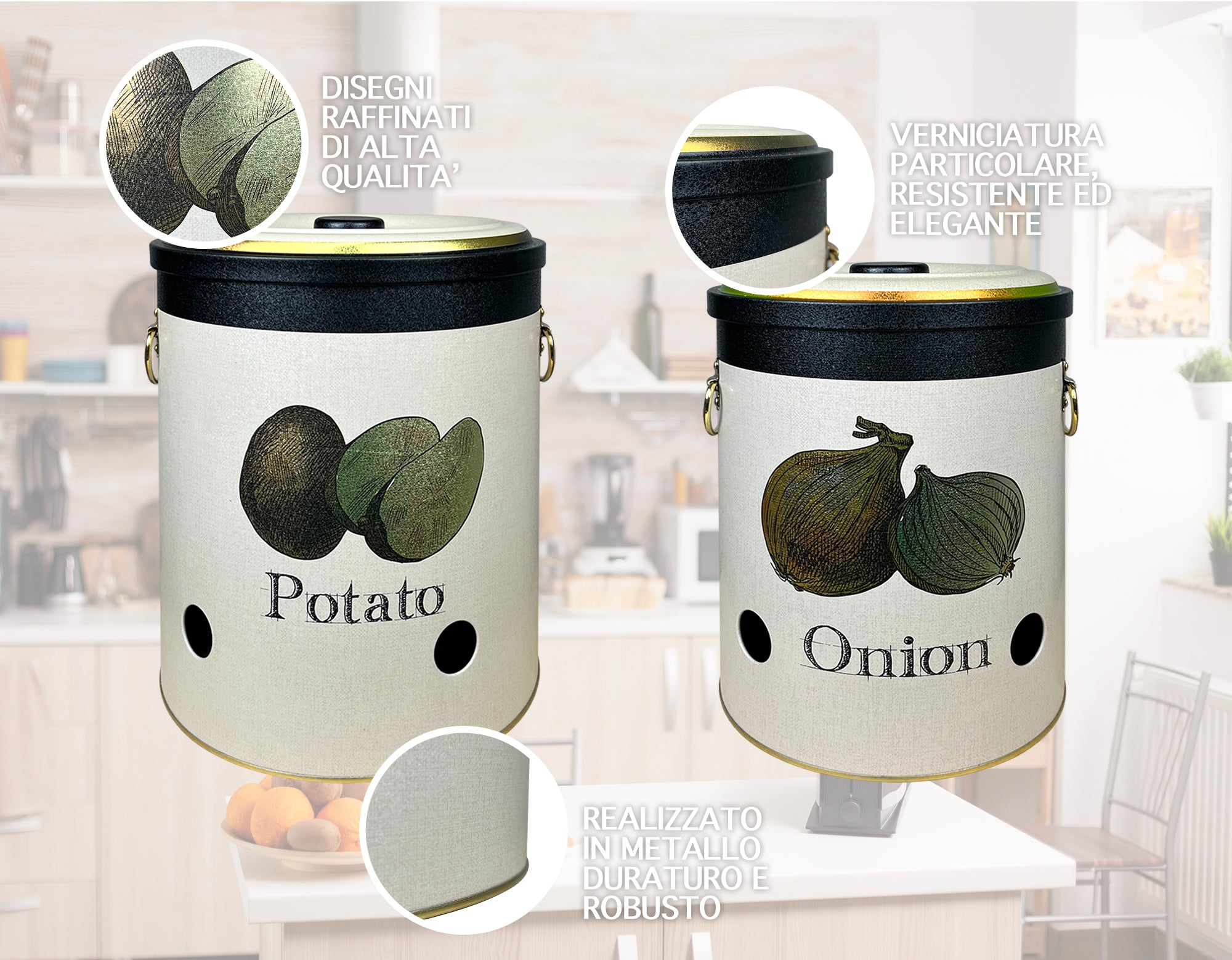 Scatola Ventilata: i contenitori forati consentono il passaggio di aria all'interno del recipiente evitando cosi la creazione di muffe e cattivi odori - Sono lavabili e idonei al mantenimento di cibi sia in cucina che in frigorifero ideali per il contenimento di patate e tuberi in generale. Design Raffinato: Dai disegni moderni ed eleganti questo raffinato set di 2 barattoli con coperchio e maniglie si adatta con stile nella tua cucina.