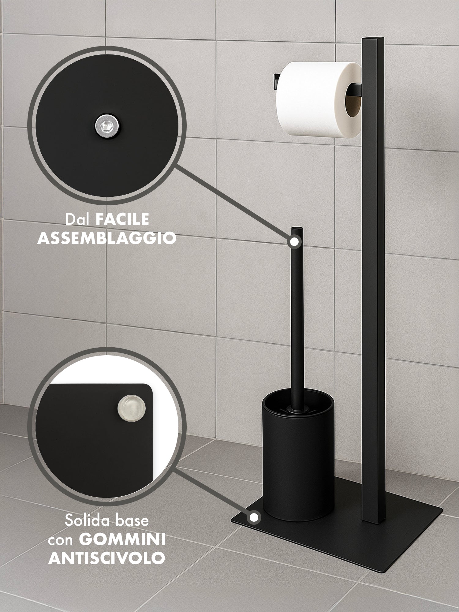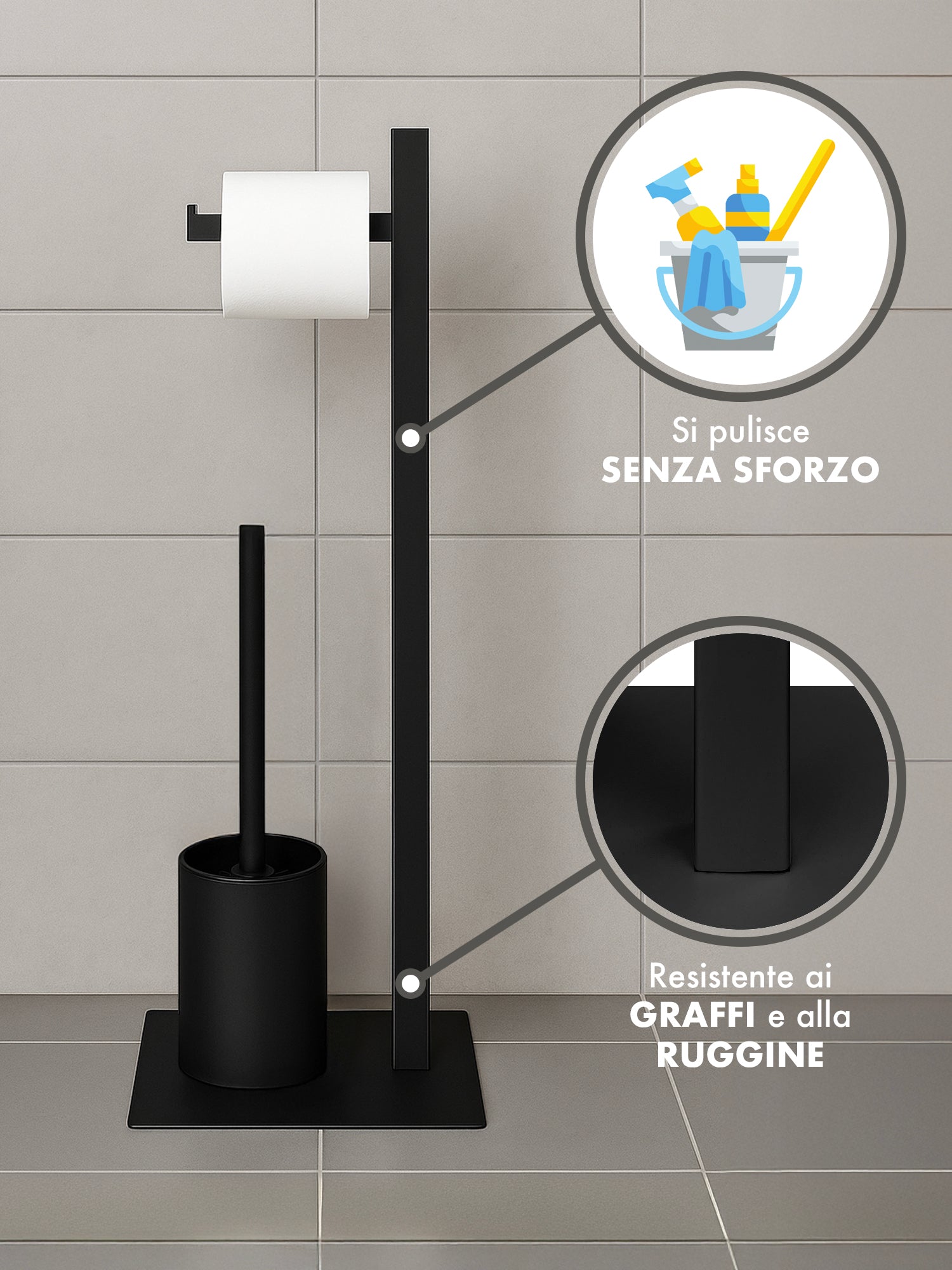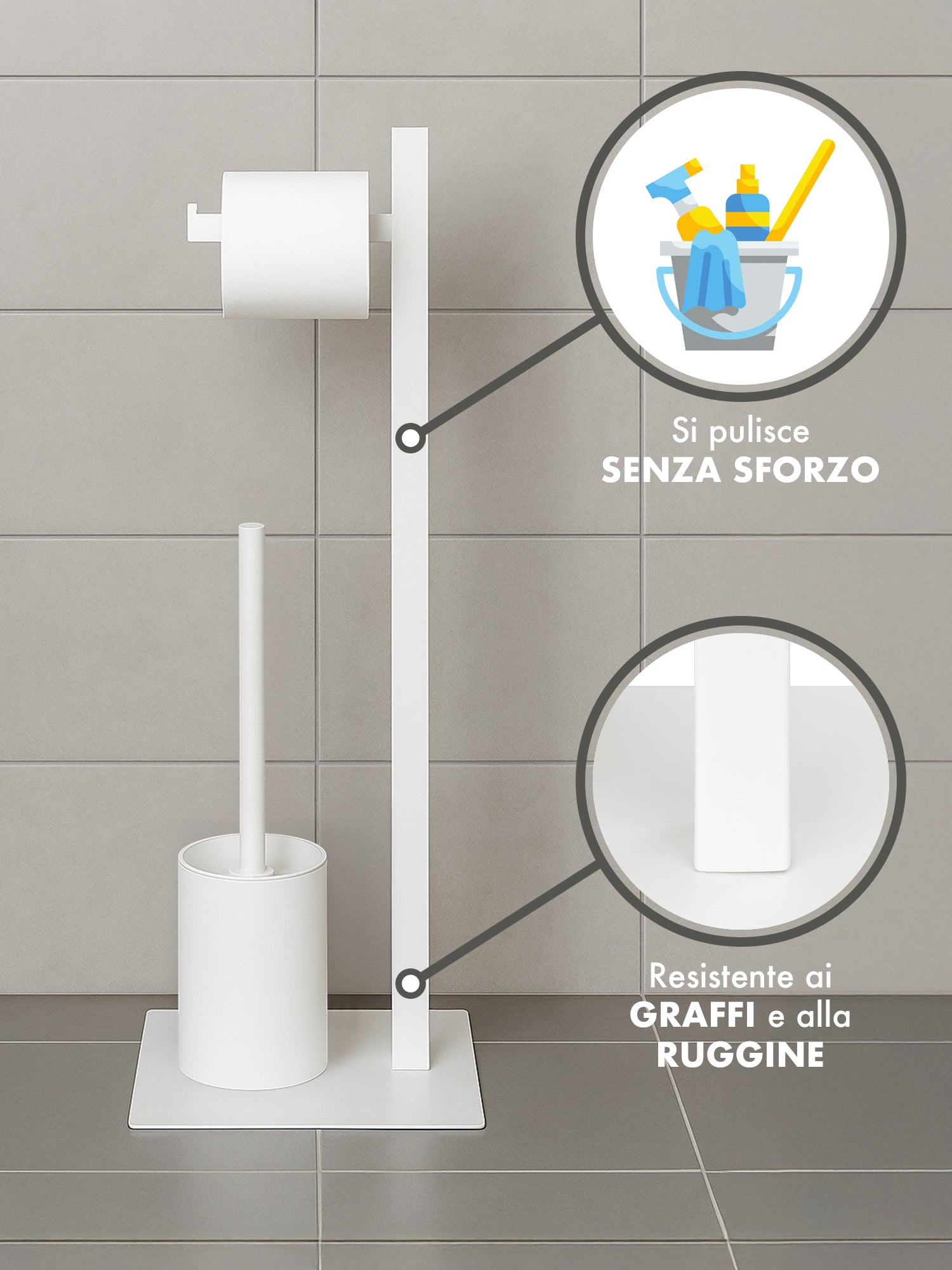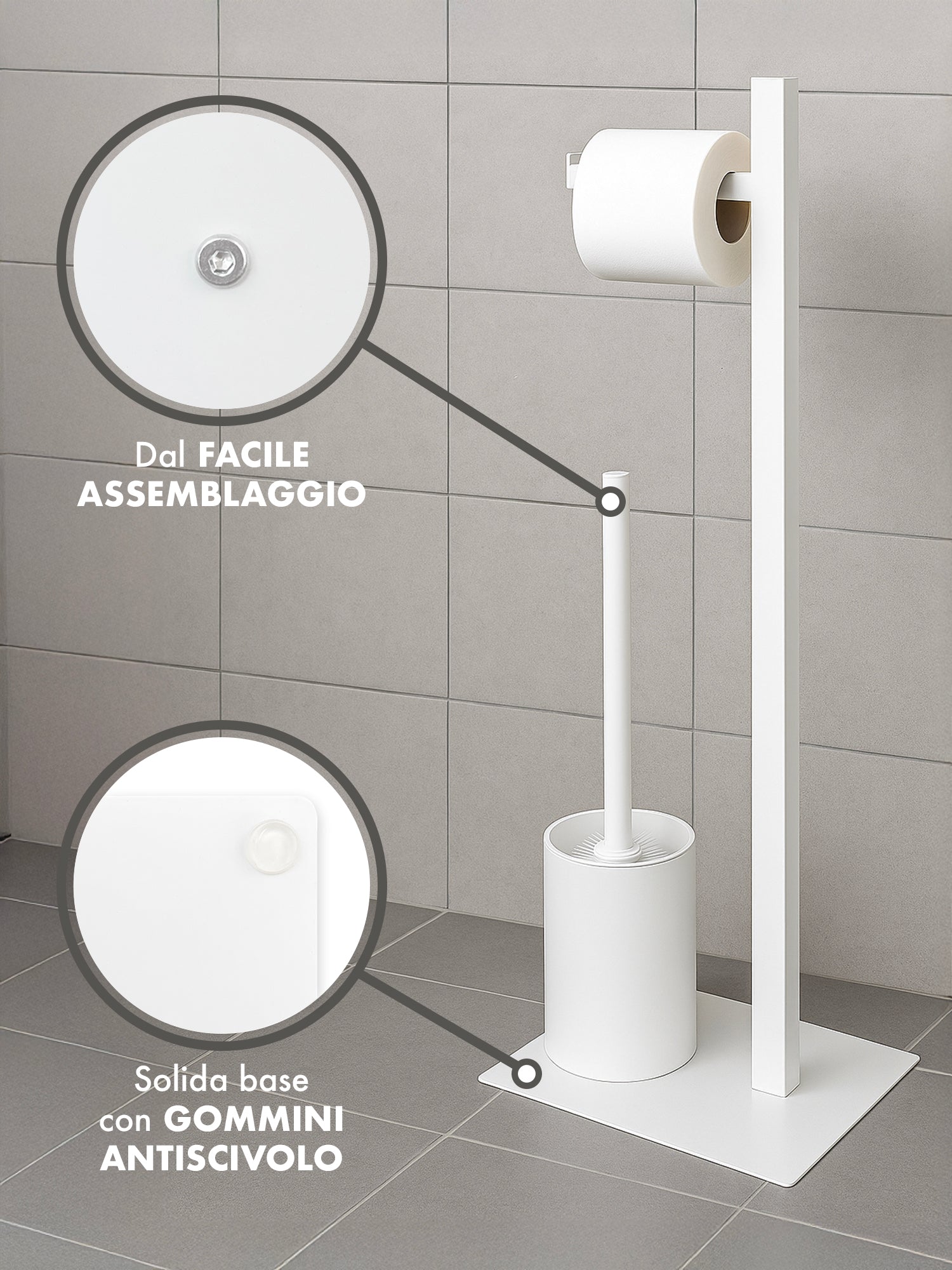 Il portarotolo a piantana è realizzato in metallo con trattamento antiruggine, pensato per resistere all’umidità del bagno. Il montaggio è facilissimo e rapido, così puoi avere la tua piantana operativa in pochi passaggi. Il set è composto dalla piantana con portarotolo e dal porta spazzolino con spazzolino incluso.