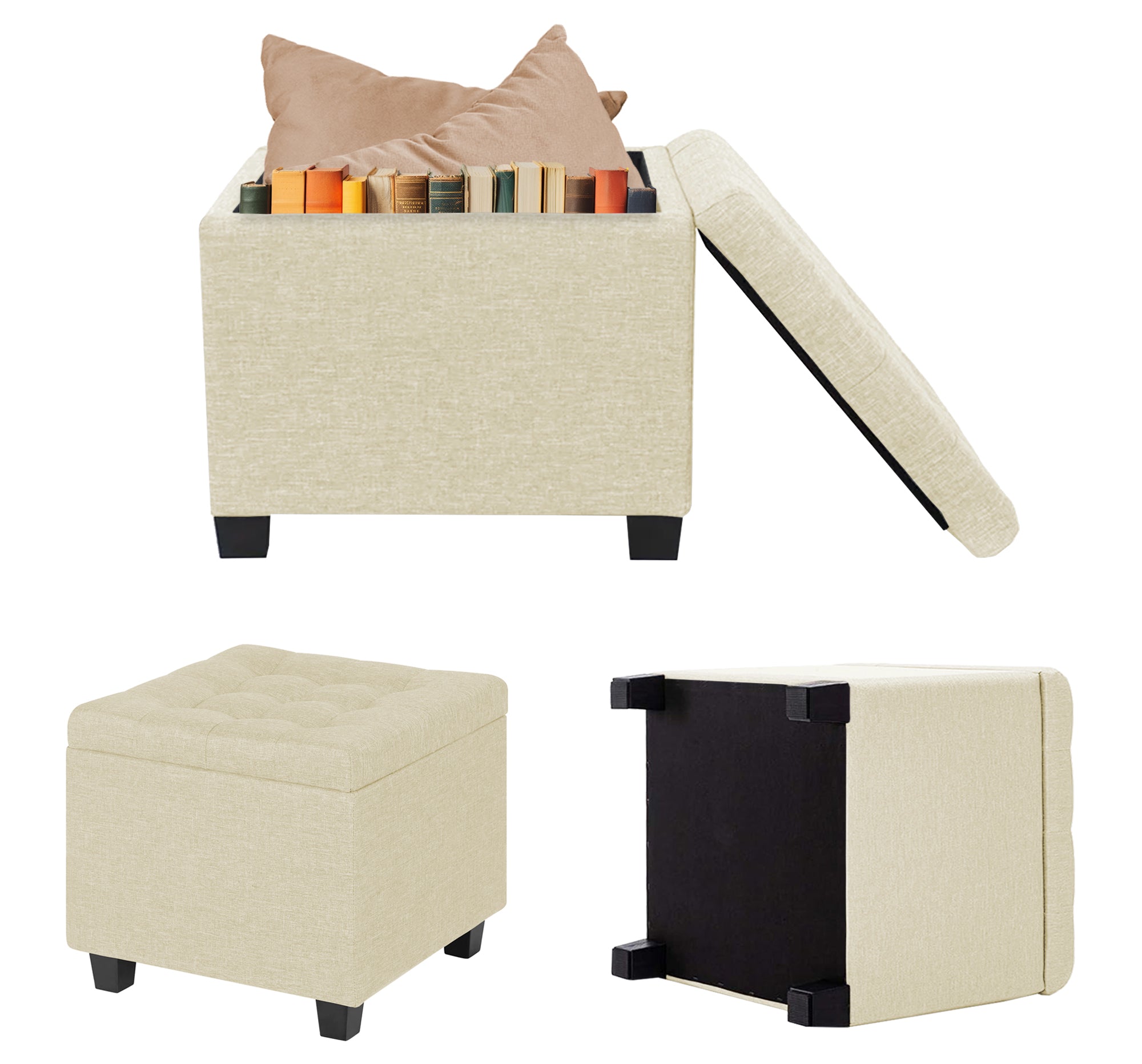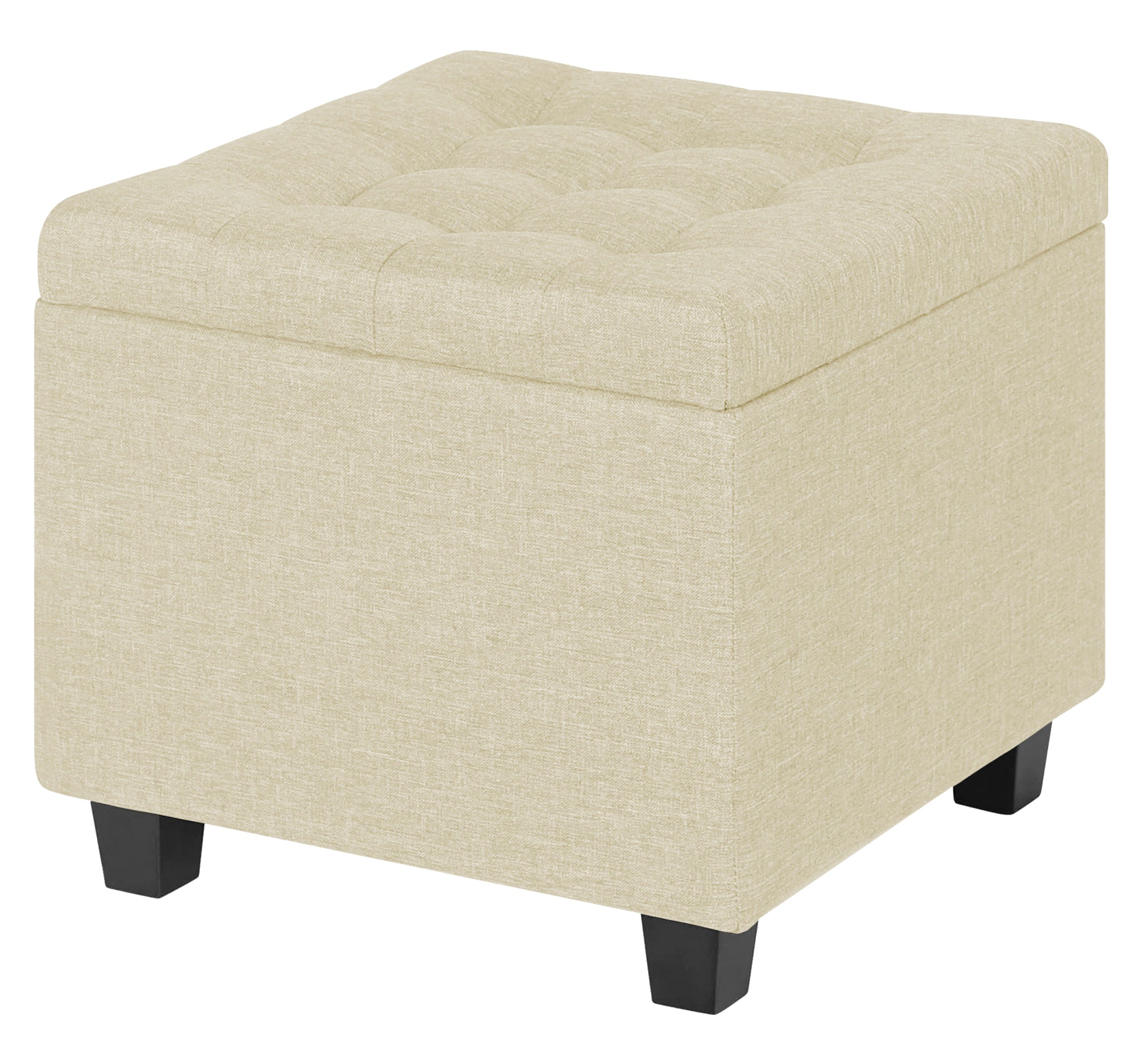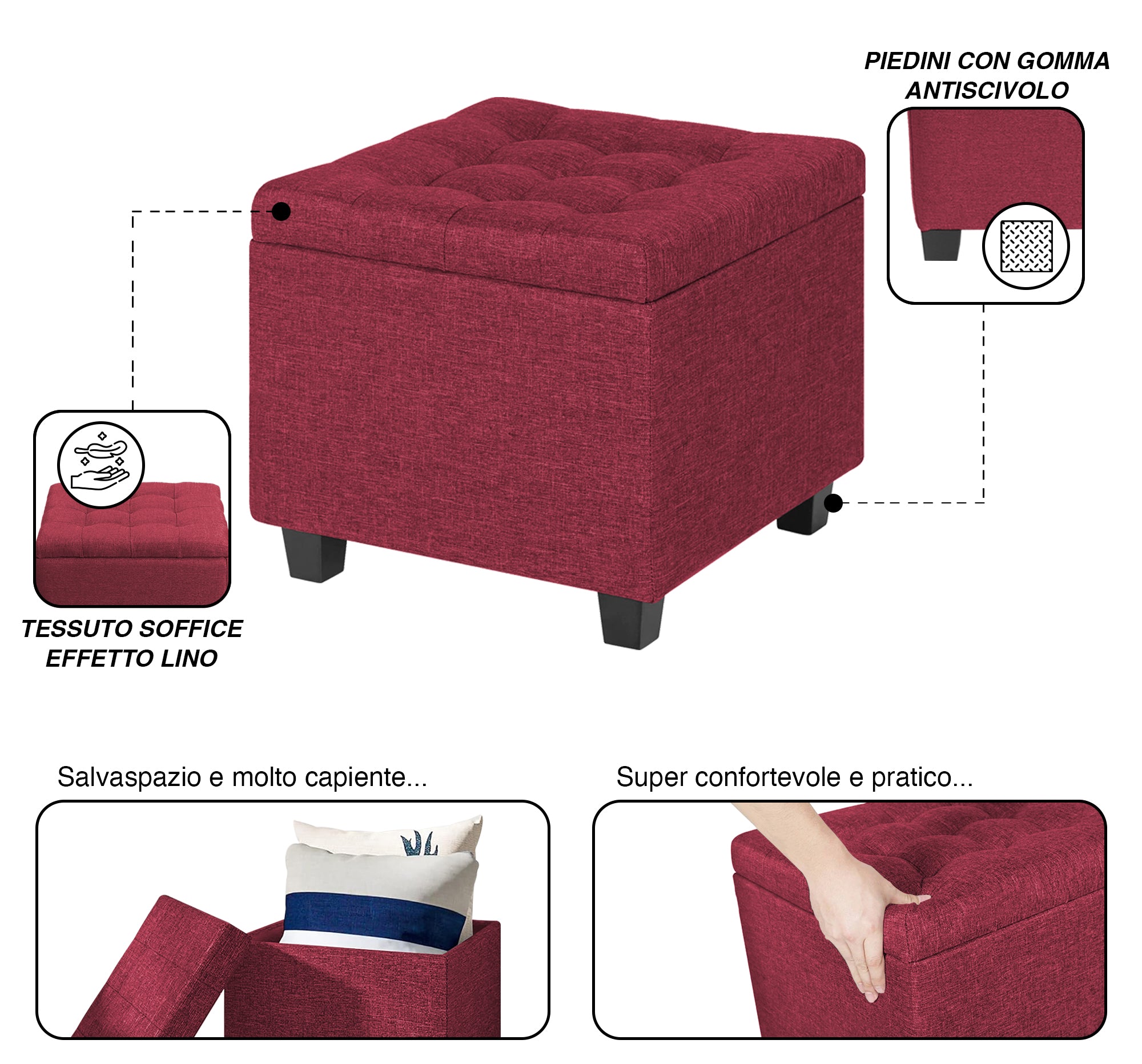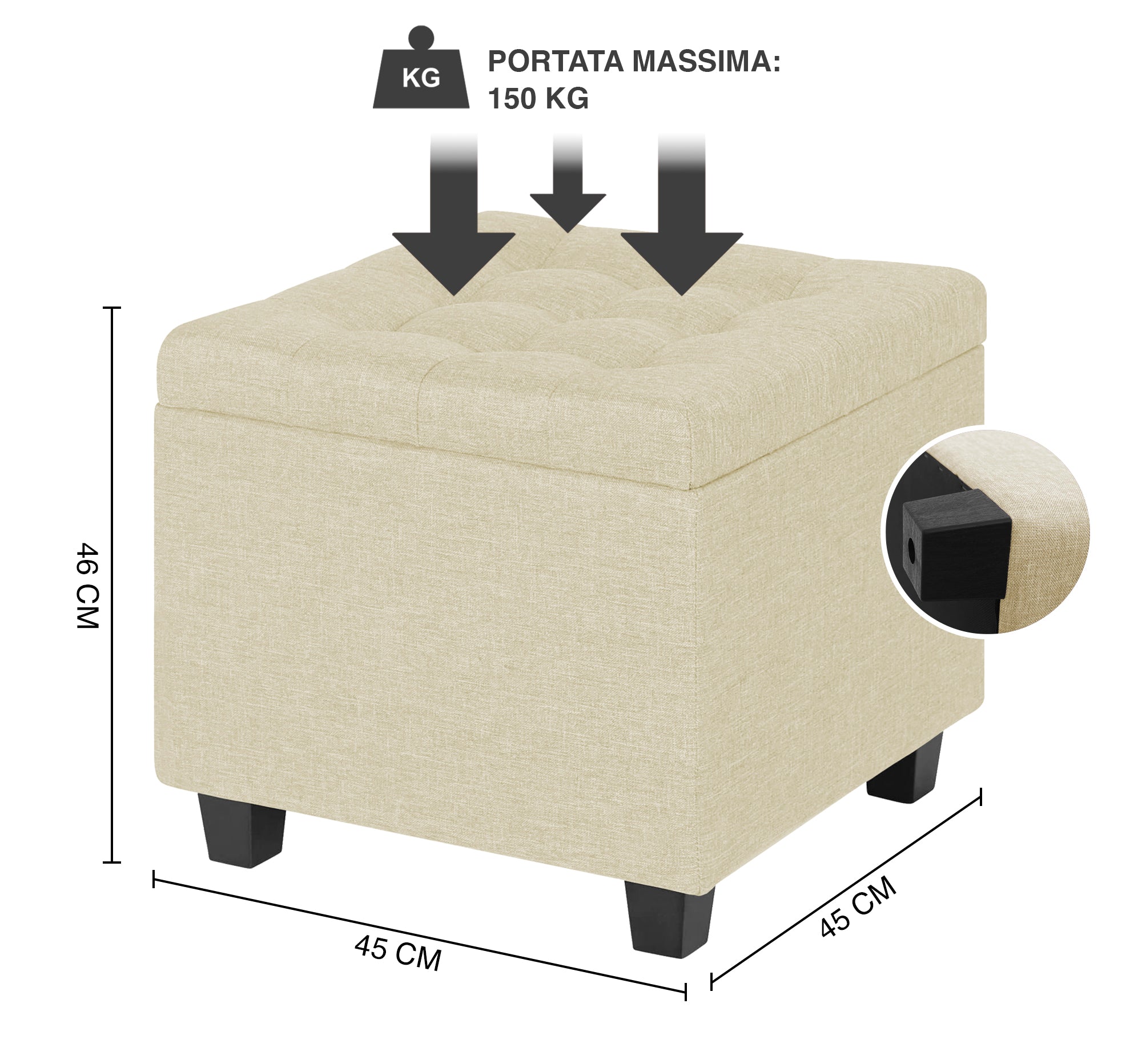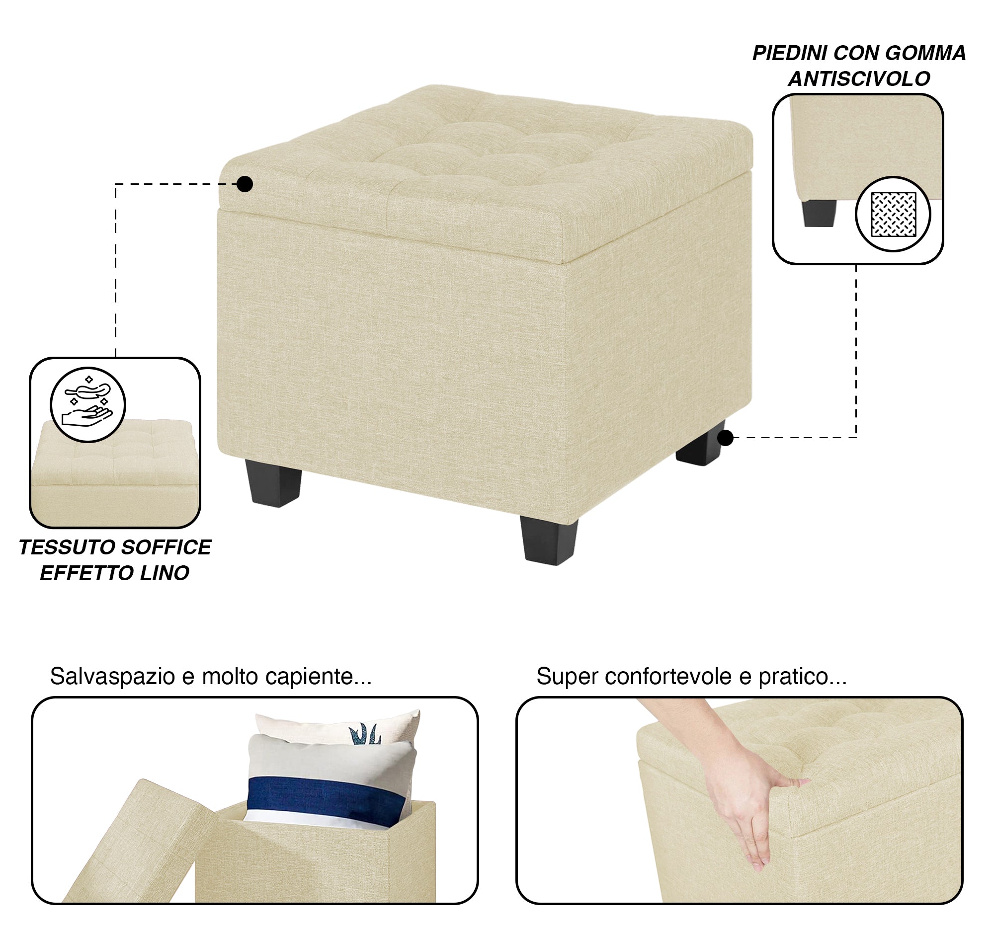 Pouf Poggiapiedi Cubico XXL Con Contenitore Integrato Cubo Imbottito Lino 45Cm Piedini legno Panca Moderna Cassapanca
