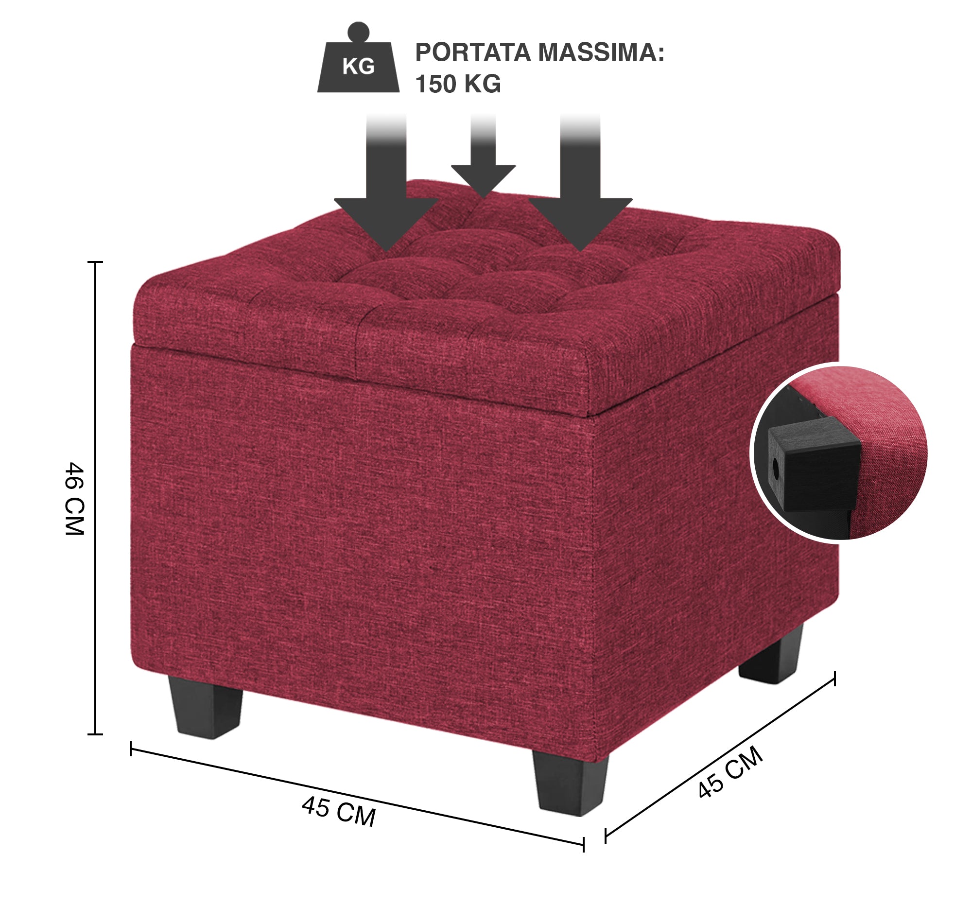✔️Dimensioni: 45 x 45 x 41 Cm - Portata Massima 150 Kg Oltre che essere bello esteticamente il pouf è anche perfetto per ogni stanza grazie alle sue misure che la rendono adatto ad ogni tipo di soggiorno, camera, ingresso è imbottito per una comoda seduta e molto resistente la struttura è stata realizzata interamente in legno rinforzata