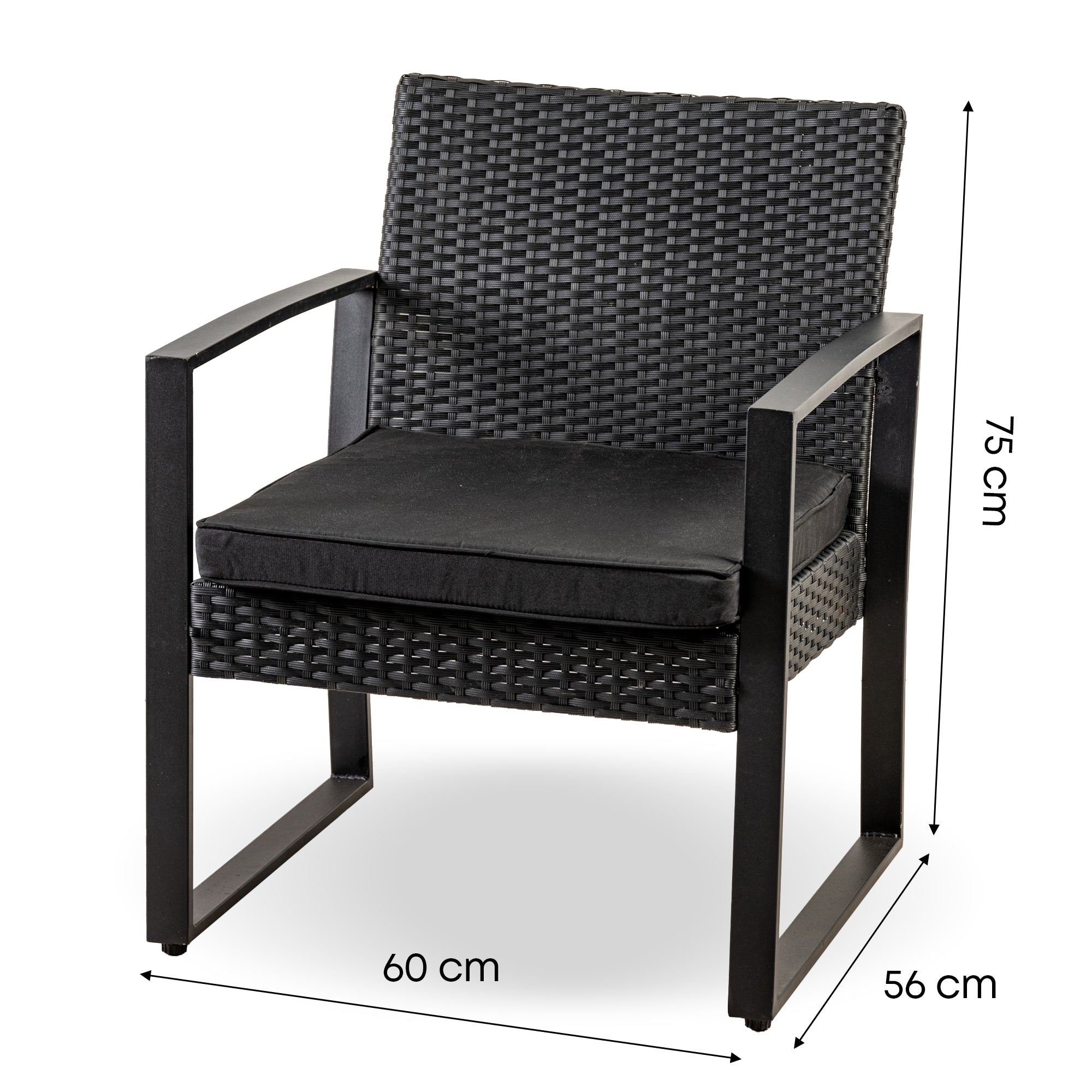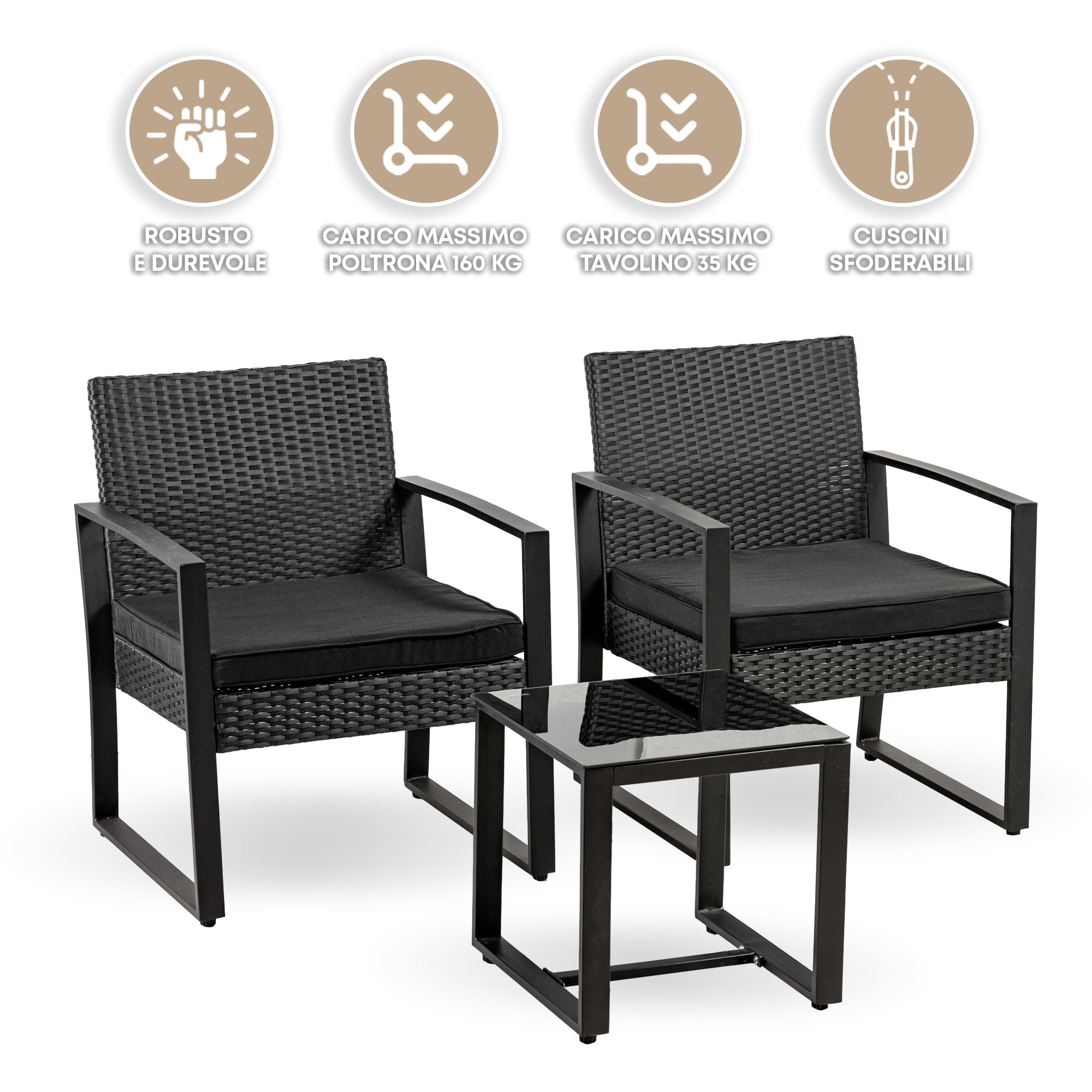Qualità: Elegantissimo Set da Giardino/Terrazzo composto da 2 poltrone e un tavolino in Rattan Sintetico Struttura in acciaio con rivestimento antiruggine impermeabile e resistente se lasciato all'aperto al continuo utilizzo alle intemperie ai cambiamenti climatici non teme Raggi Uv,Umidità e non scolorisce nel tempo.