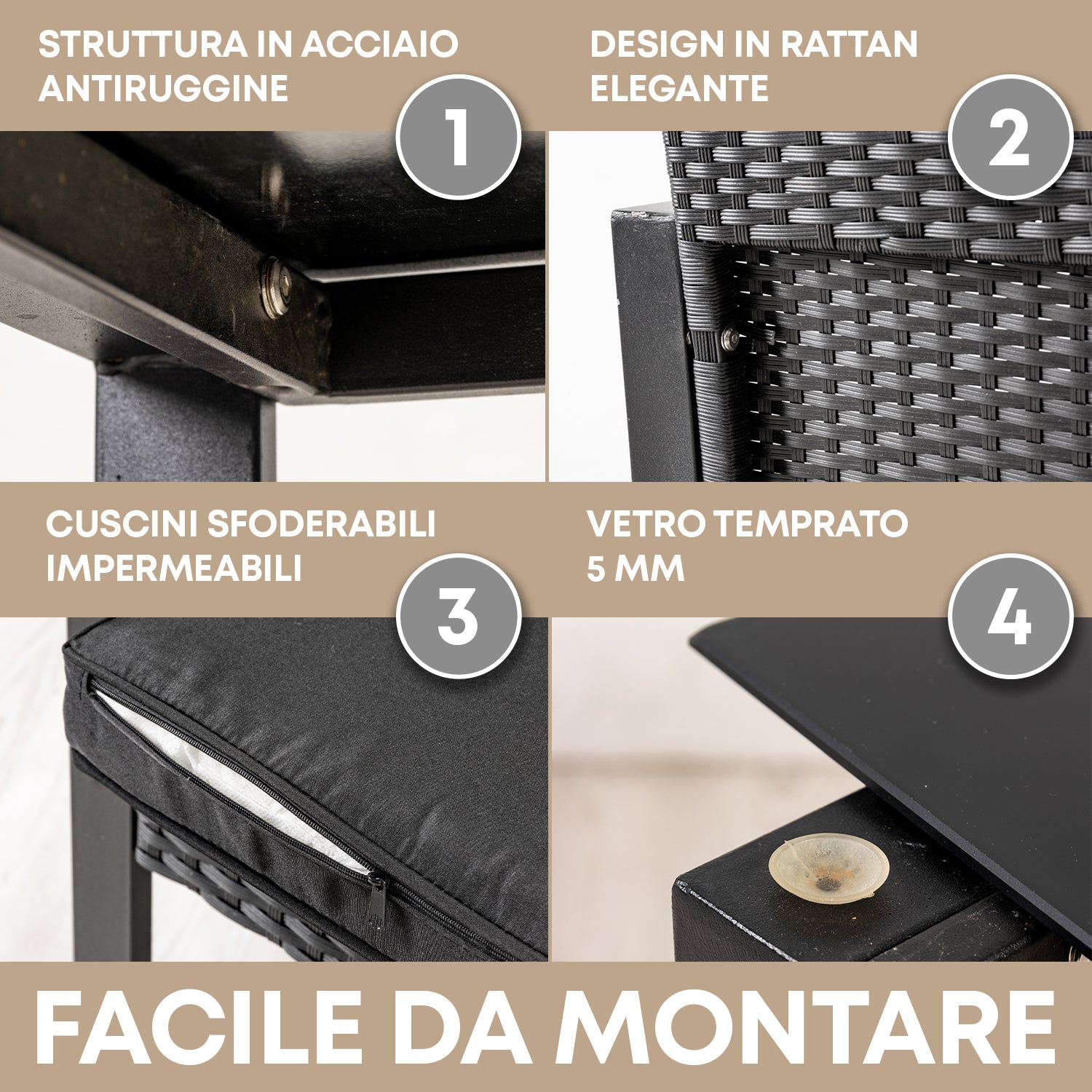 Stabilità: Il set ha un telaio stabile in acciaio verniciato a polvere. Grazie alle viti di regolazione del tavolo e delle sedie, il salottino può essere adattato individualmente alle irregolarità del pavimento,il tavolino elegantissimo anch'esso stabile e resistente con vetro temprato 5 Mm