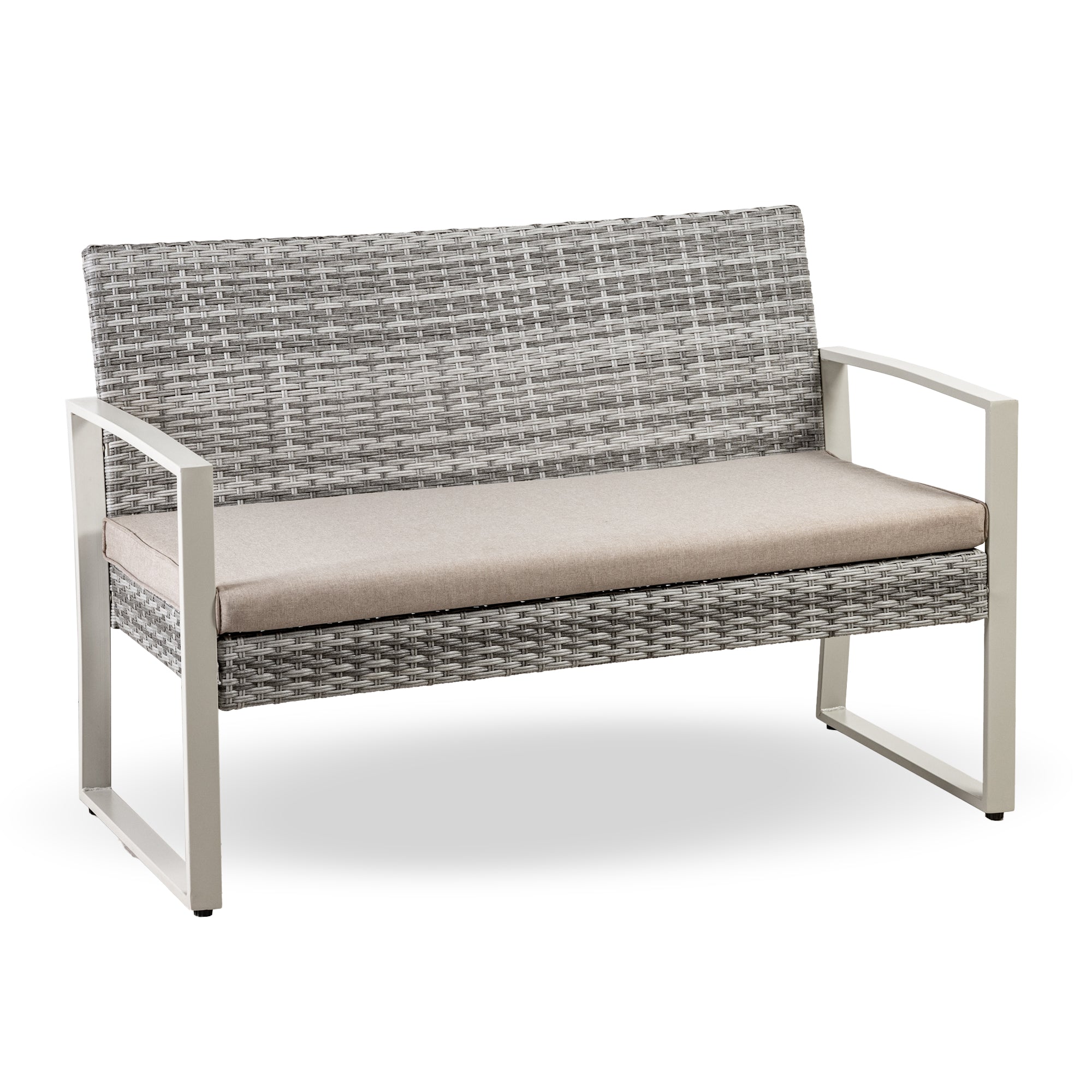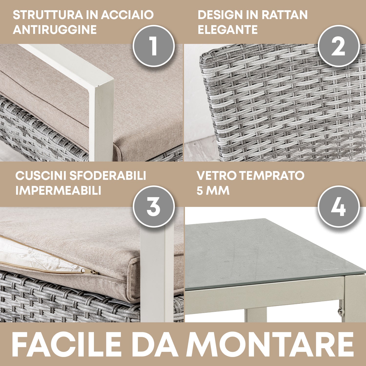 Qualità: Elegantissimo Set 4 Pezzi da Giardino/Terrazzo composto da 2 Poltrone, 1 Tavolo 1 Divano Rivestiti in moderno Rattan Sintetico Struttura in acciaio con rivestimento antiruggine impermeabile e resistente se lasciato all'aperto al continuo utilizzo alle intemperie ai cambiamenti climatici non teme Raggi Uv,Umidità e non scolorisce nel tempo.