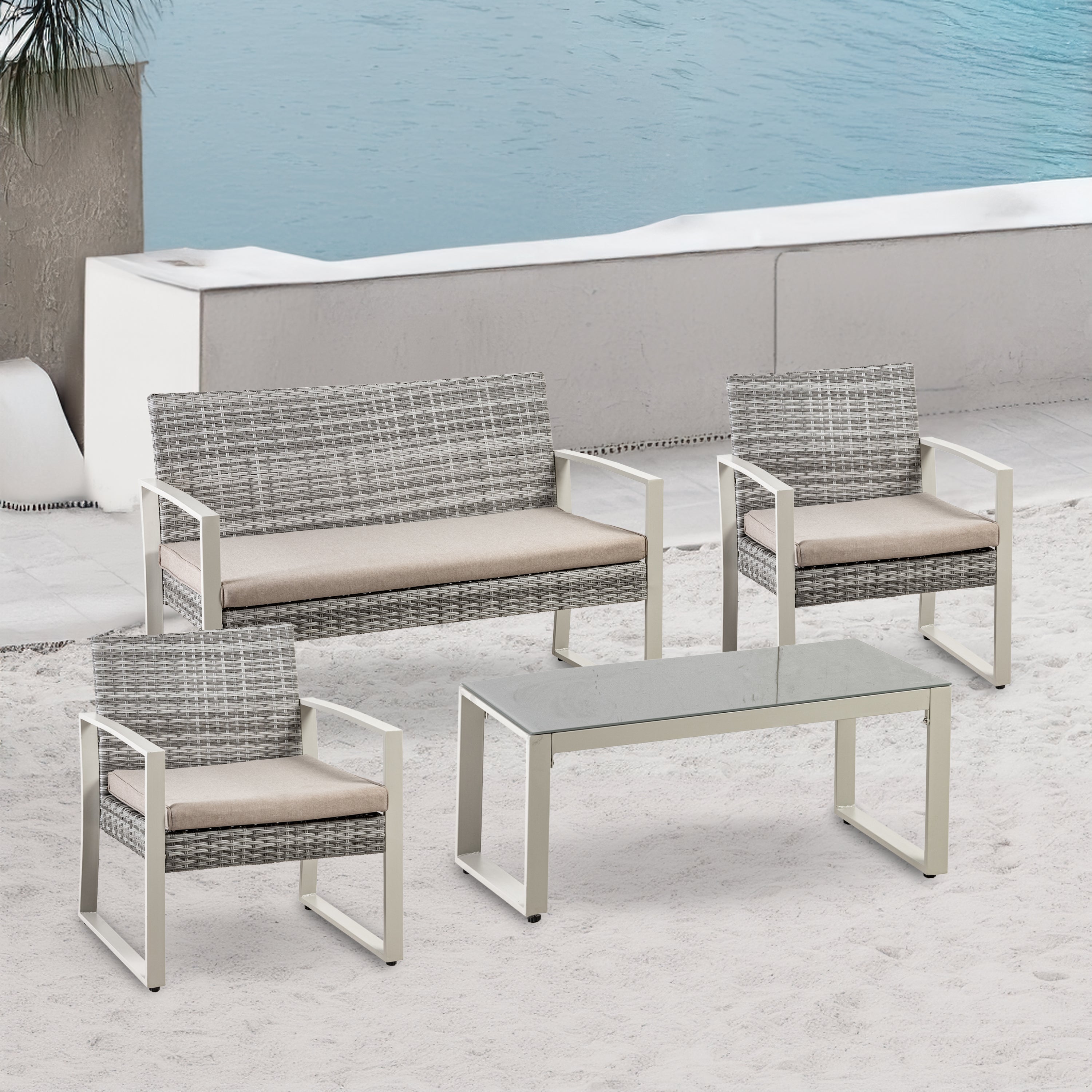 Salotto Da Esterno 4 Pezzi 2 Poltrone 1 Divano 1 Tavolo Elegante Telaio In Acciaio Salottino Piano In Vetro Temperato Comodi Cuscini Terrazzo Balcone Giardino