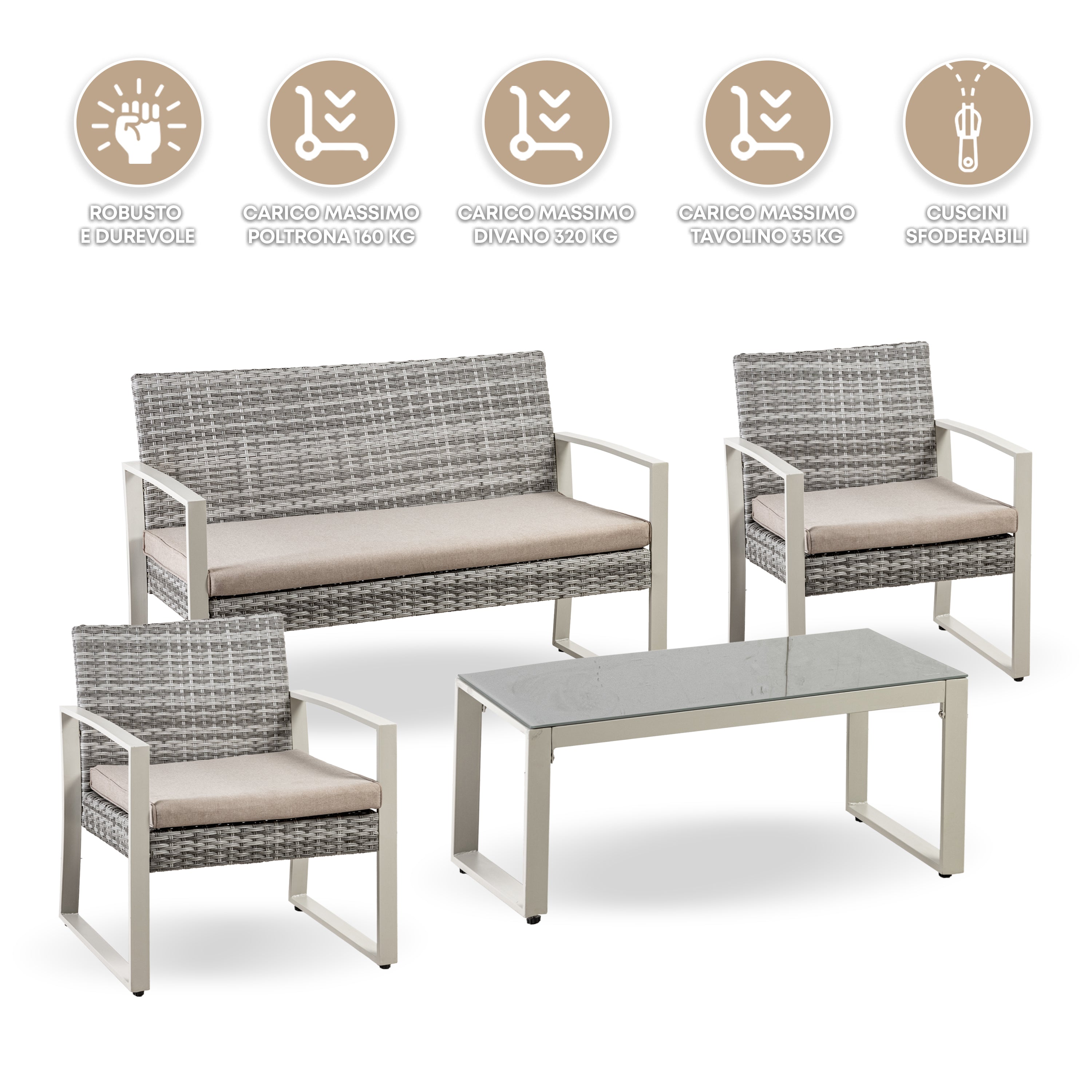 Design Elegante: Elegantissimo ideali per giardini,terrazze e verande stupisci i tuoi ospiti con un complemento d'arredo unico ed esclusivo Portata Poltrone 160 Kg Portata Divano 320 Kg Portata Tavolino 35 Kg