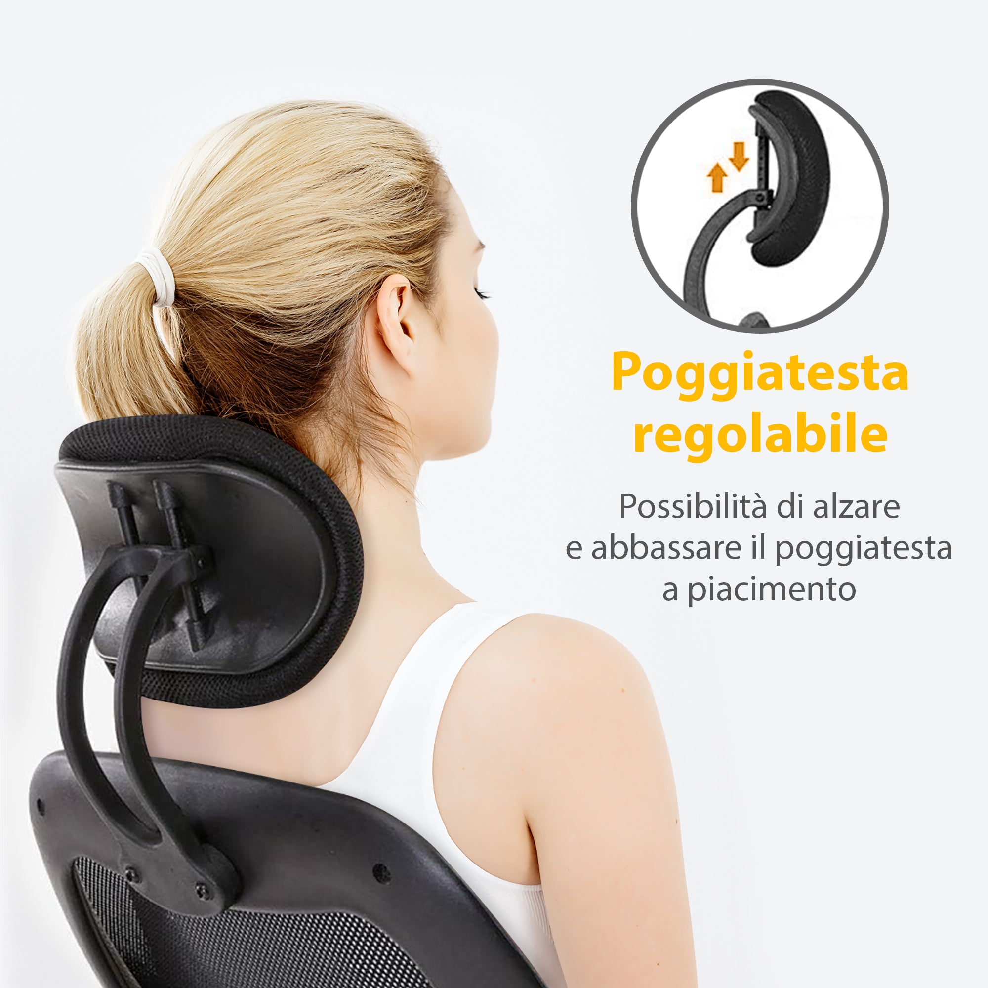 Ergonomica: Lo schienale ergonomico si adatta alla curva naturale della parte bassa della schiena, consentendoci di rimanere concentrato e rilassato prevenendo il dolore alla colonna vertebrale. La parte posteriore in rete di poliestere premium mantiene il tuo corpo fresco e confortevole consentendo un flusso d'aria continuo.