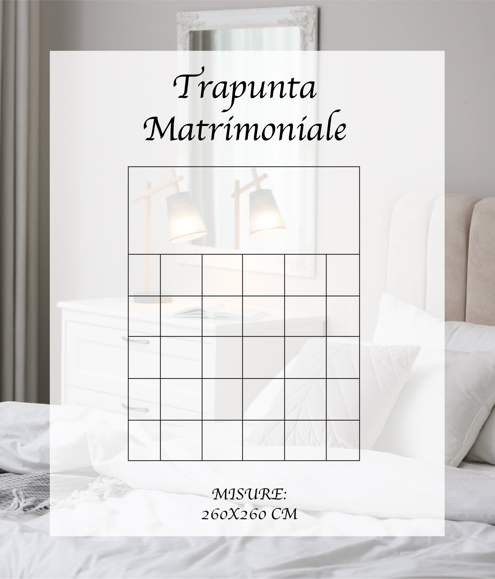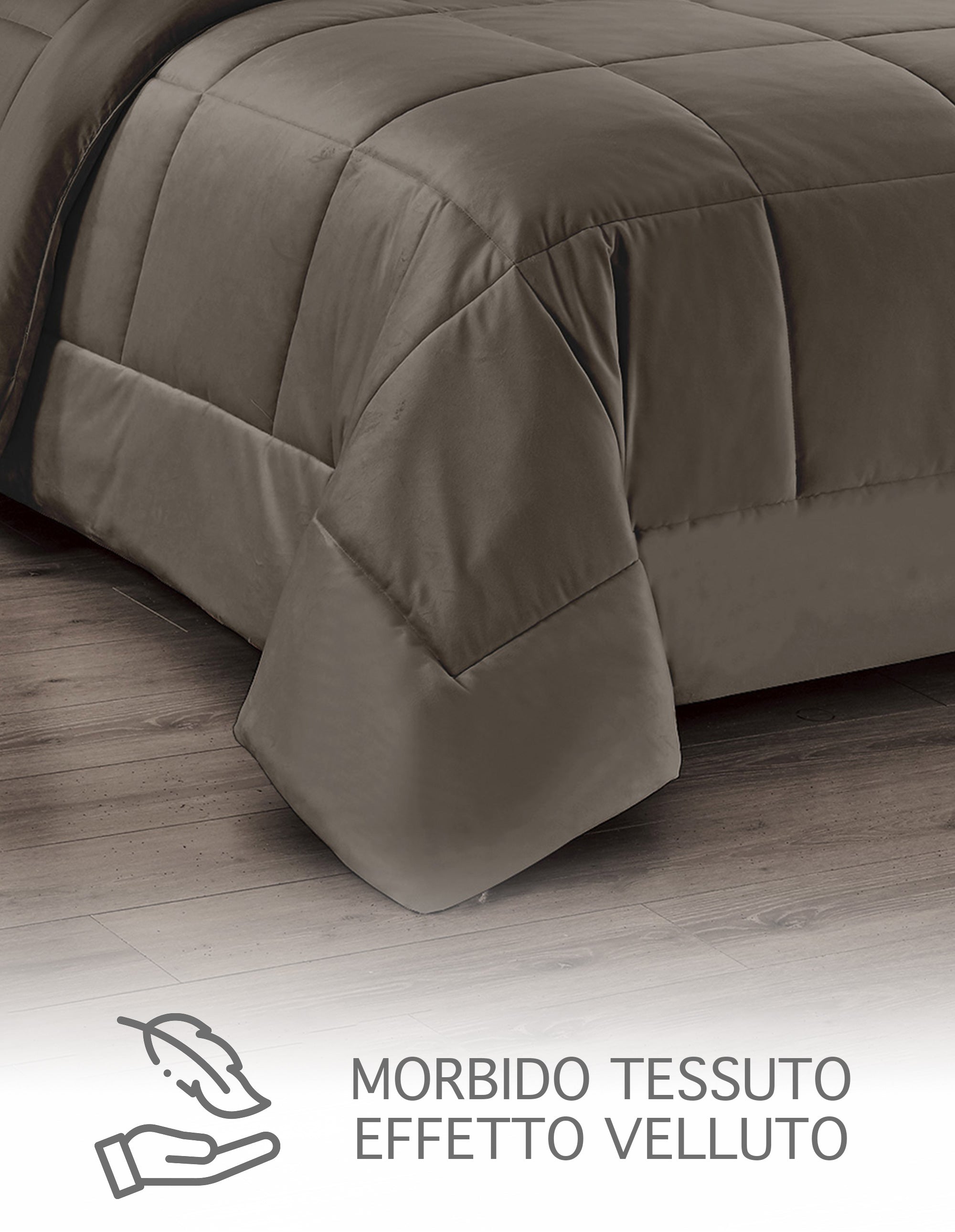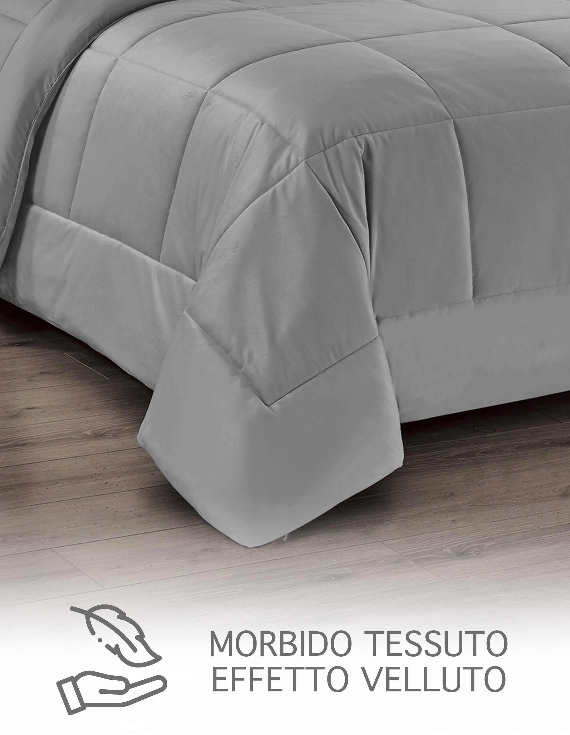 Tessuto esterno vellutato morbido al tatto, trattato Manopesca, con microfibra di poliestere di alta qualità ed imbottitura siliconata 100% anallergica. Per offrire il miglior comfort, il piumone invernale è composto da 270 gr di velluto al fronte, 75 gr al retro e 200 gr di poliestere siliconato, per un totale di 625 gr-mq. La trapunta è stata prodotta e rifinita con cura, garantendo la massima qualità dei materiali e lavorazioni innovative, che ricordano la morbidezza della vera piuma, inoltre è certificata AZO FREE. Misura 260x260 cm, lavabile in lavatrice a 30°C, senza stirare