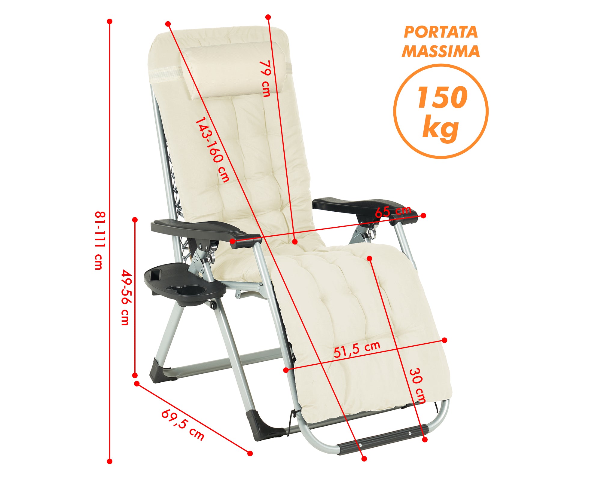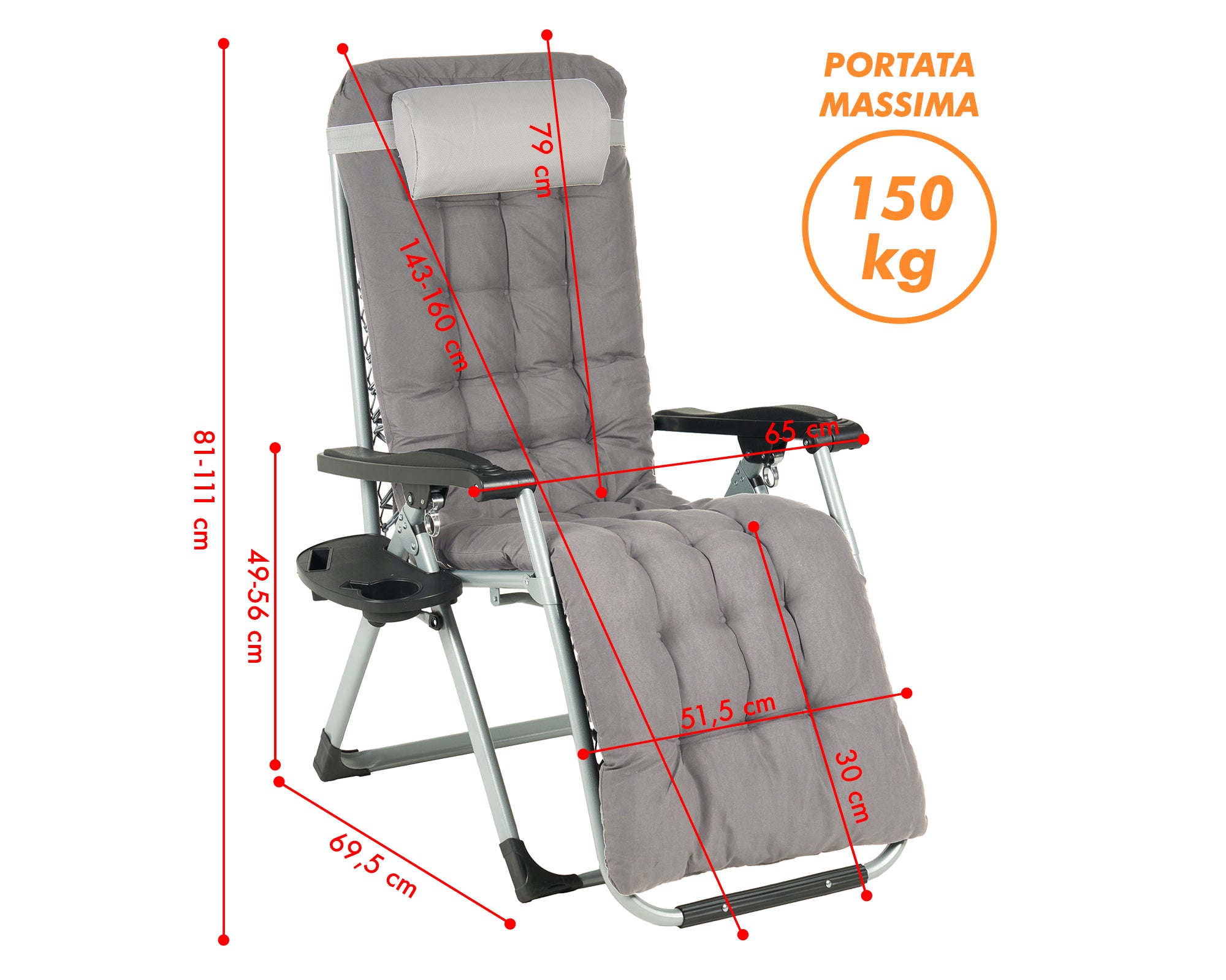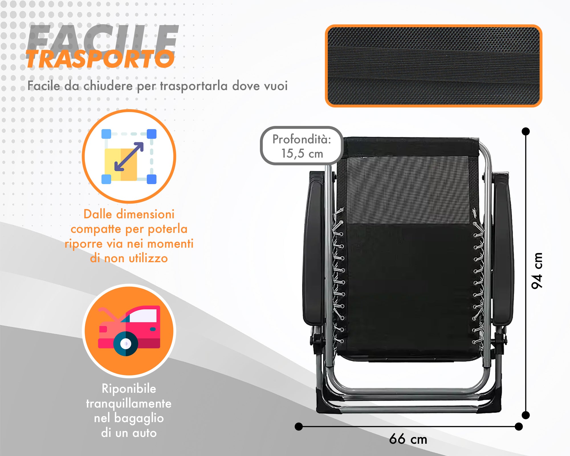 [Reclining and Practical] The chair's structure allows you to recline up to 170 degrees via a lever, allowing you to find the perfect position for relaxation. Furthermore, the chair is foldable and space-saving, making it easy to store when not in use. When folded, it measures just 66 x 94 x 15.50 cm, making it easy to transport and move wherever you want.