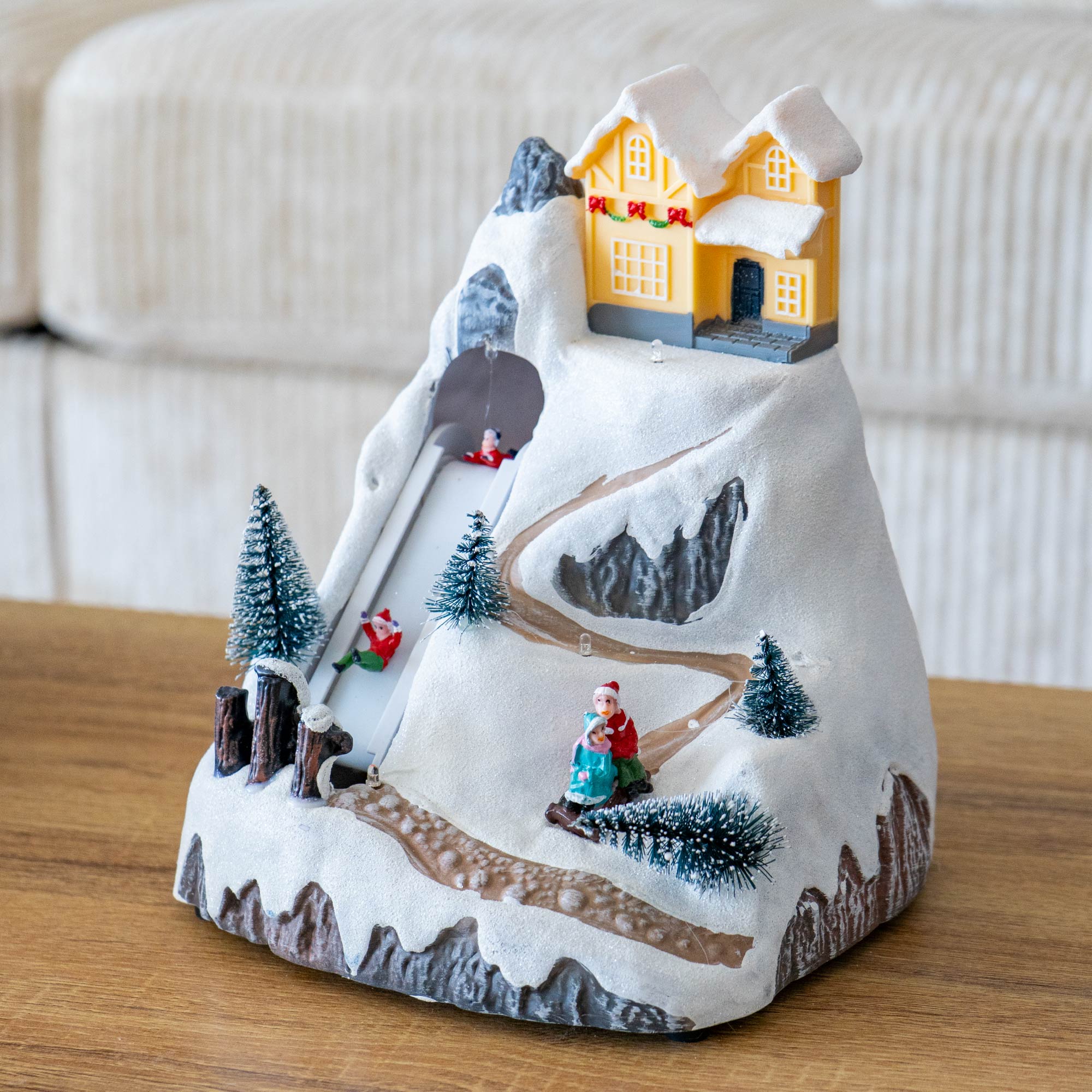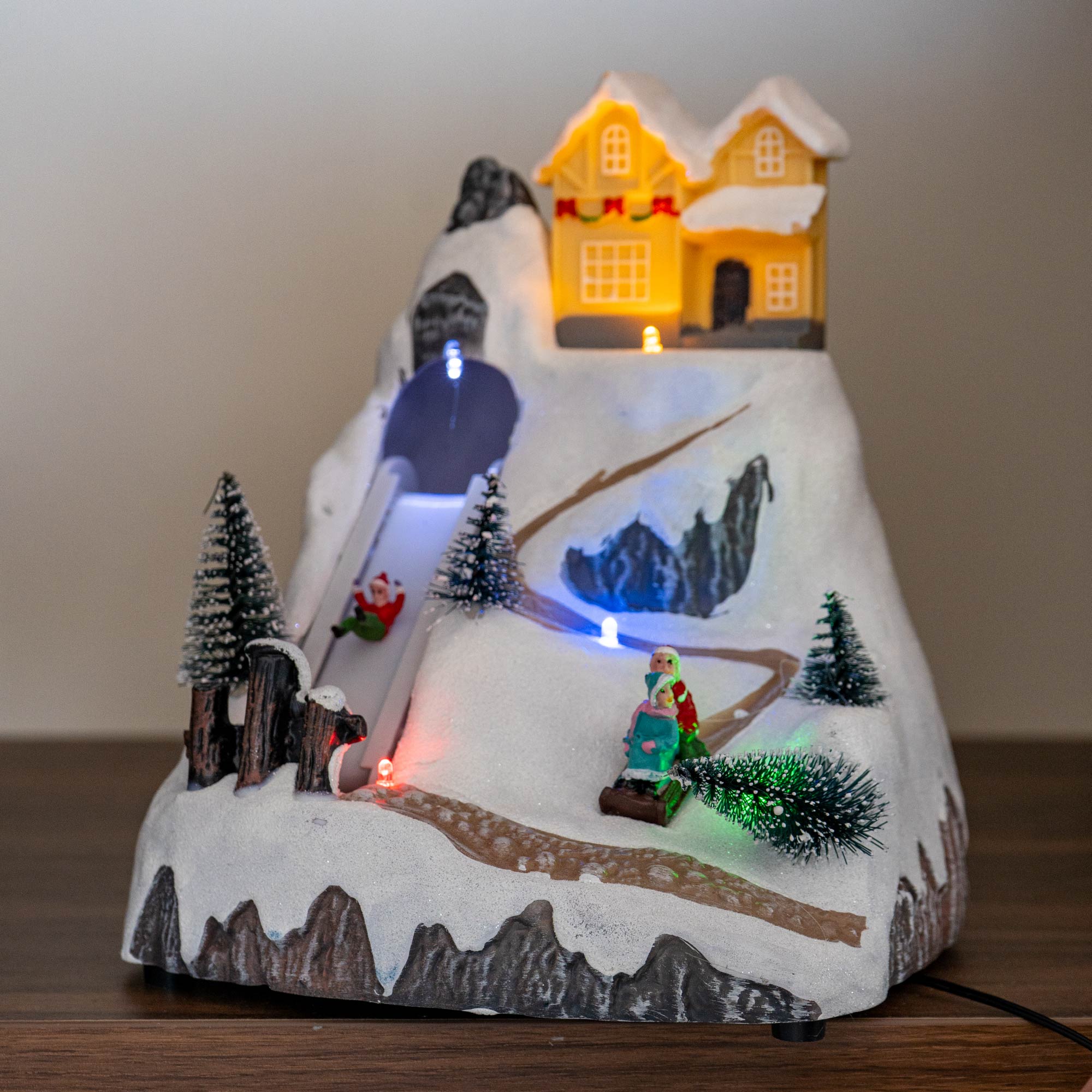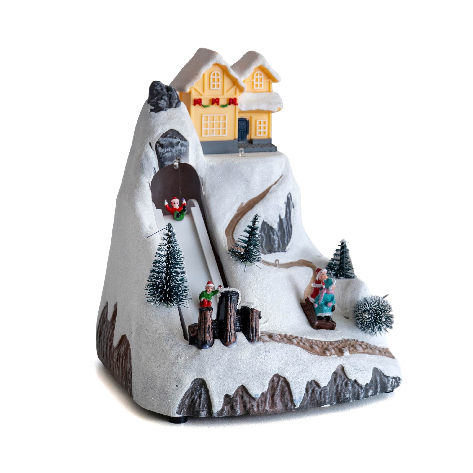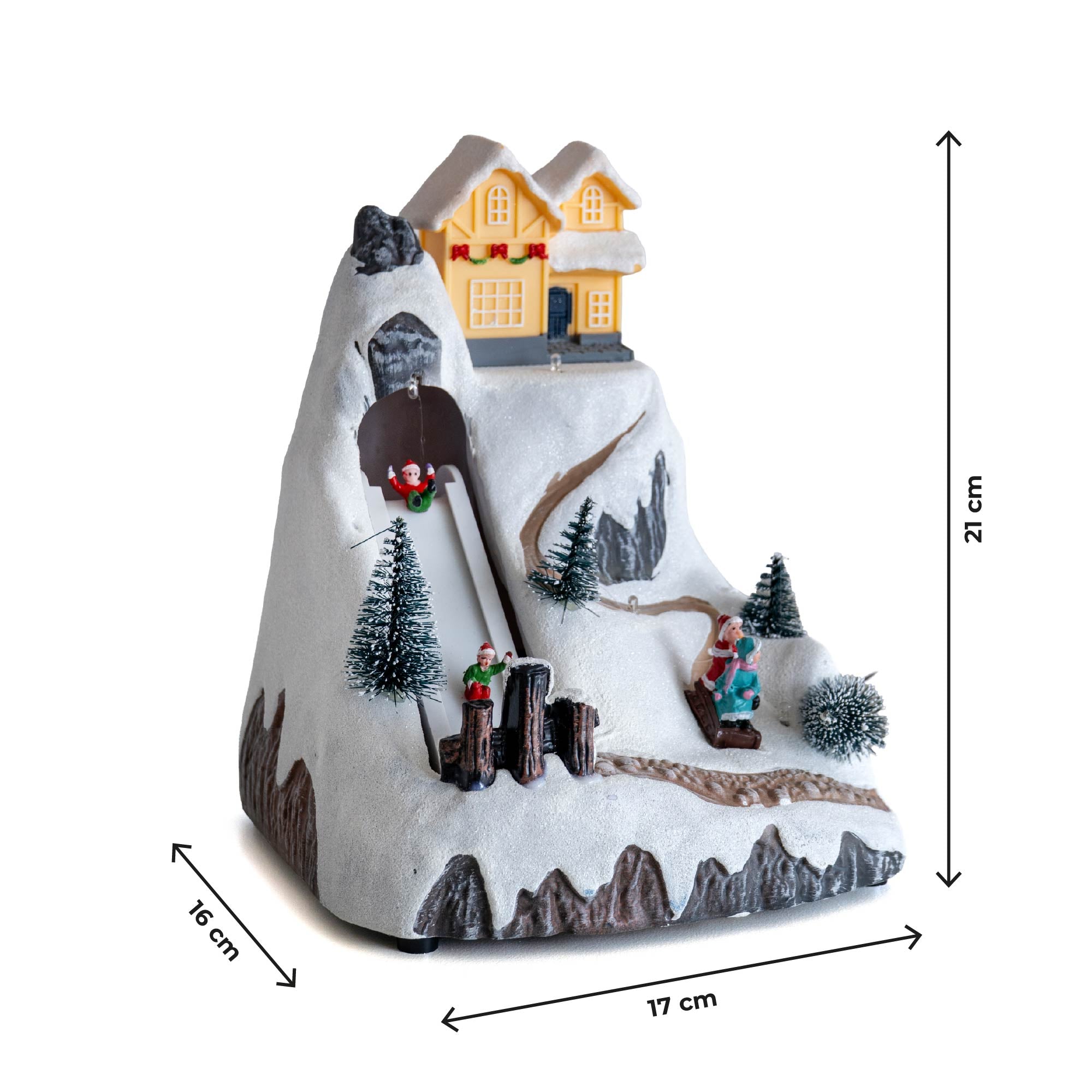 Magical Christmas Atmosphere: A snowy village with a little house, trees, and moving characters: a Christmas scene that will enchant both adults and children.