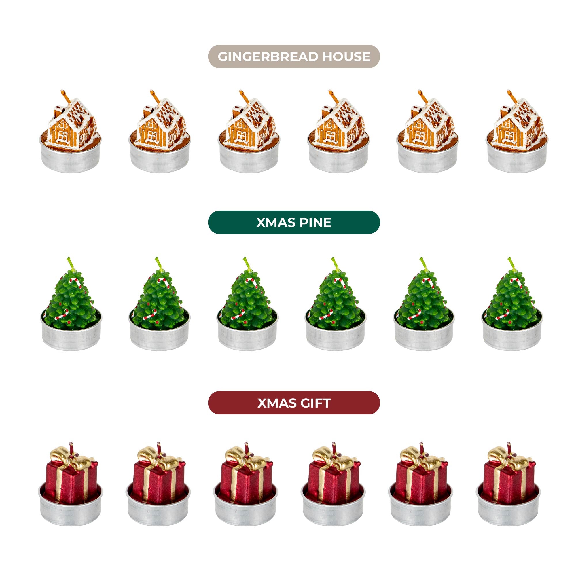 ✔️COMPLETE SET OF 18 CANDLES: The set includes 3 packs of 6 tea lights each, for a total of 18 Christmas-themed decorative pieces.