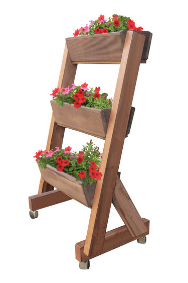 Maceta de tres compartimentos con ruedas, fabricada en Italia en WPC, para balcones, terrazas o espacios exteriores.