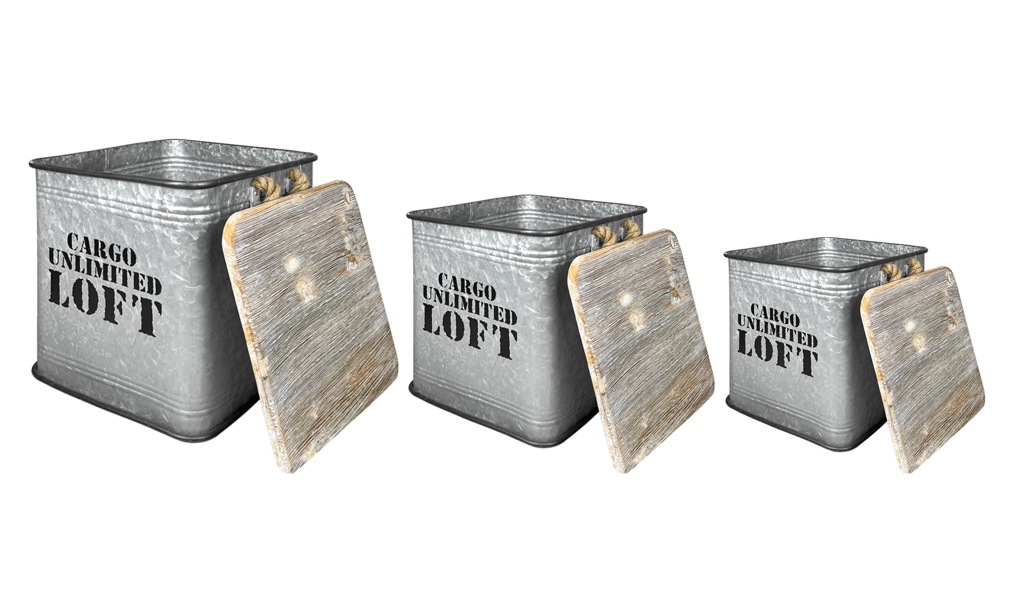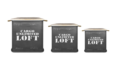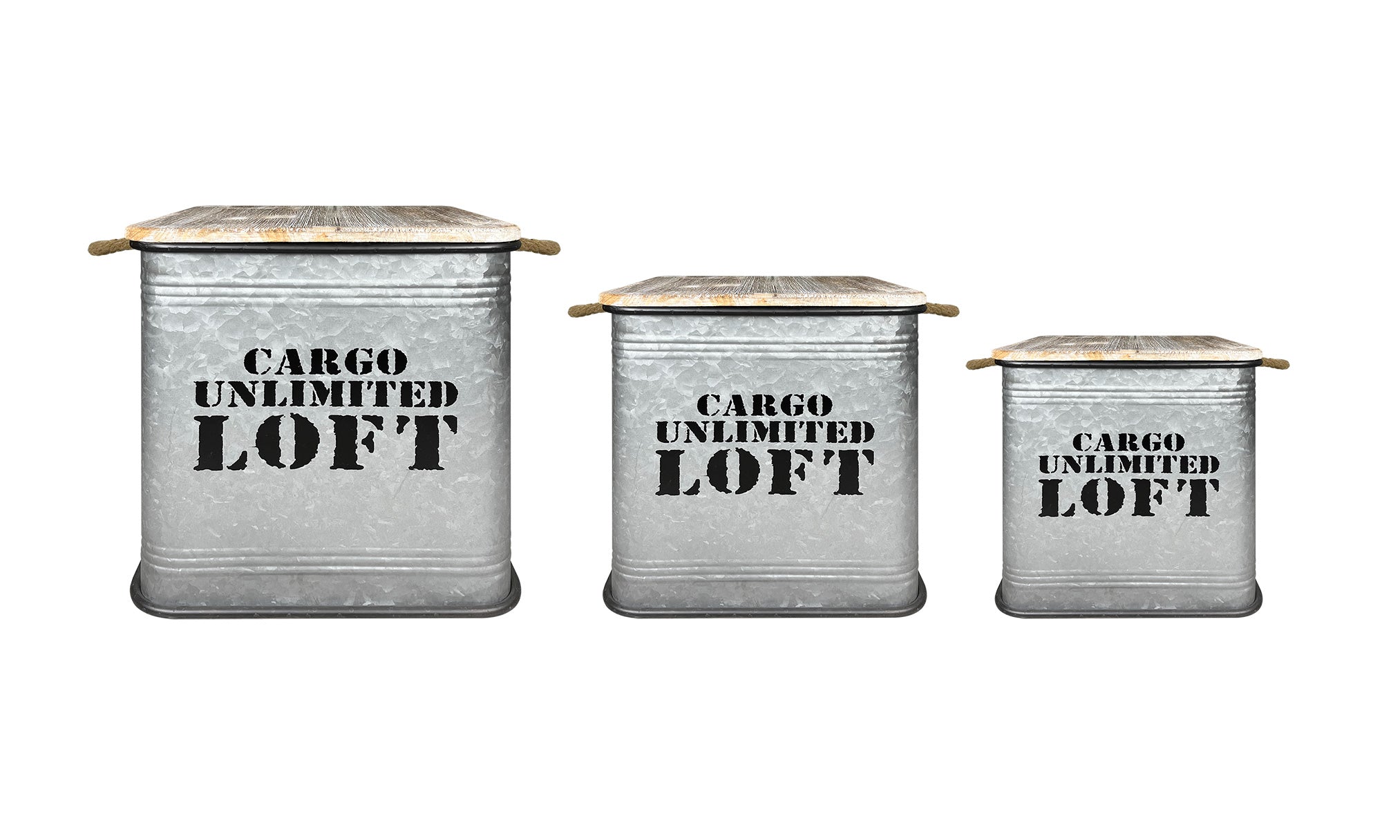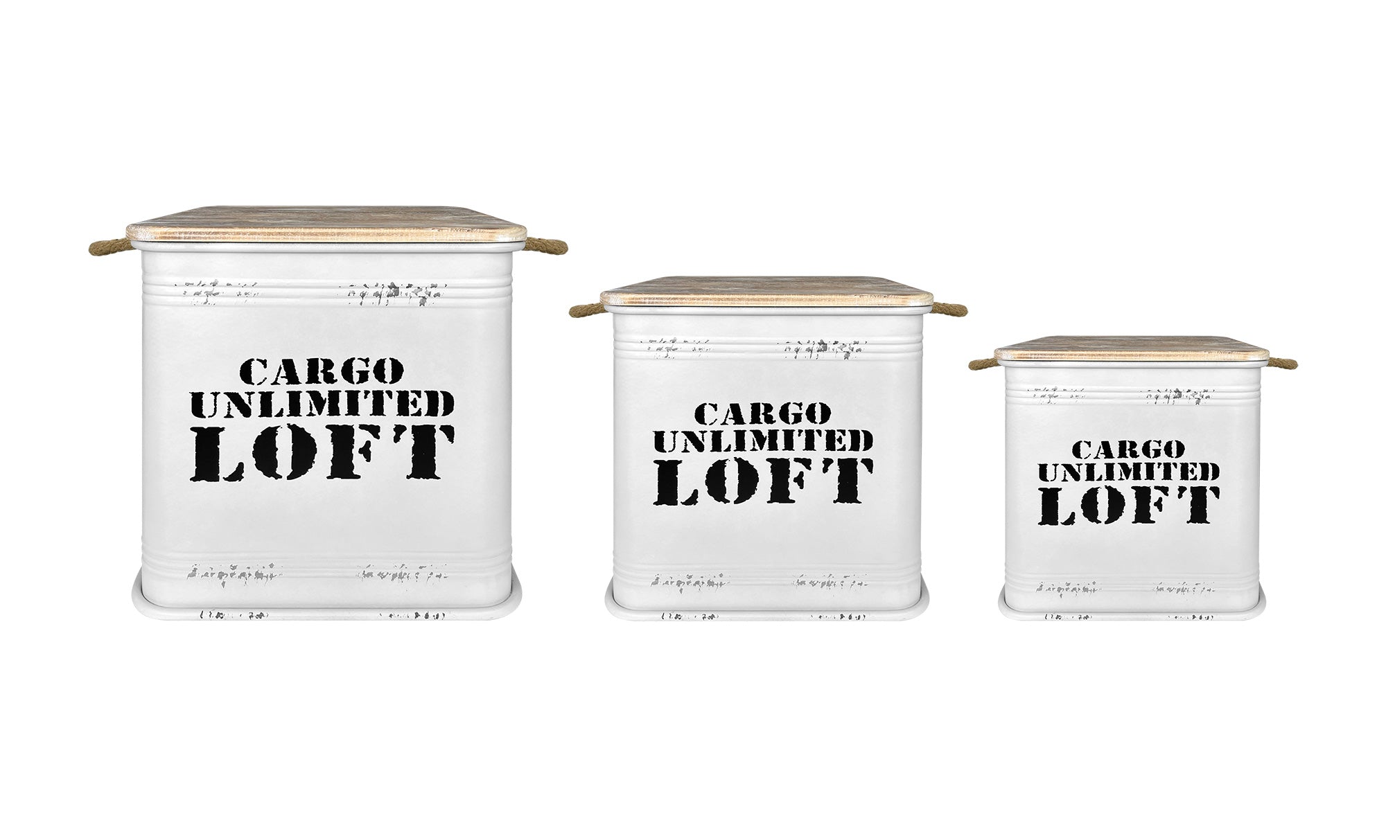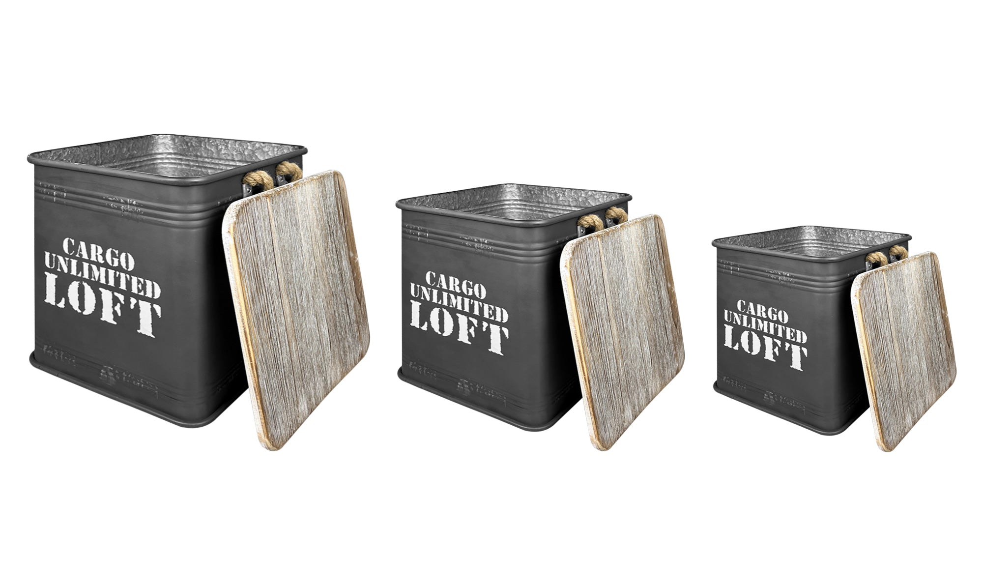 Juego de 3 contenedores grandes de acero, taburete tipo puf Cargo Unlimited Loft con tapa de madera, taburetes militares vintage, contenedor metálico