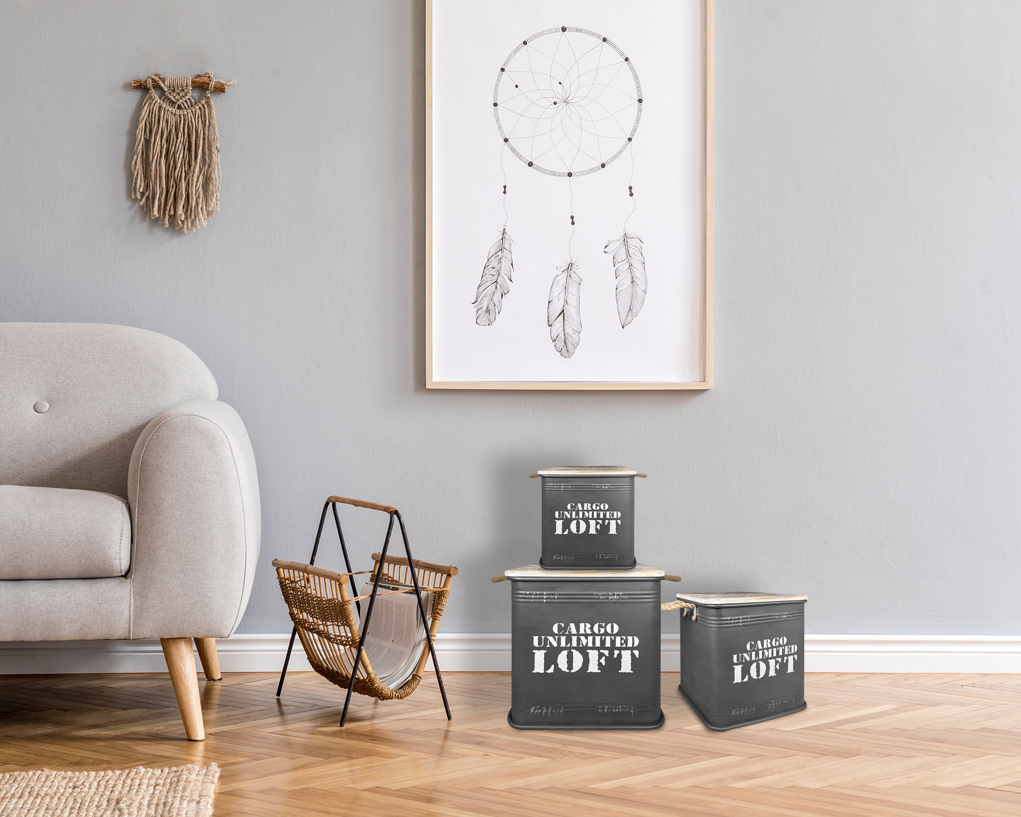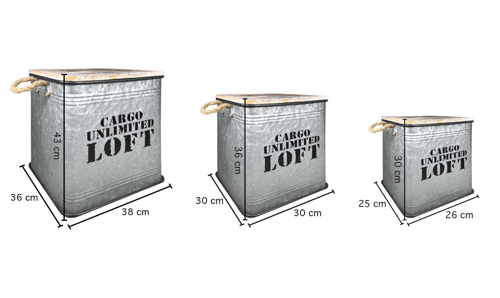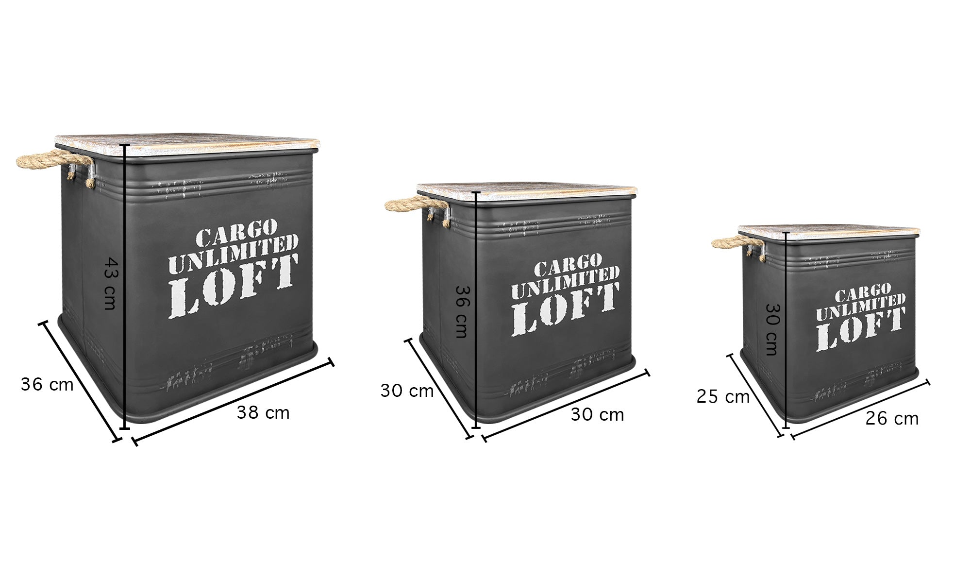 Juego de 3 contenedores grandes de acero, taburete tipo puf Cargo Unlimited Loft con tapa de madera, taburetes militares vintage, contenedor metálico