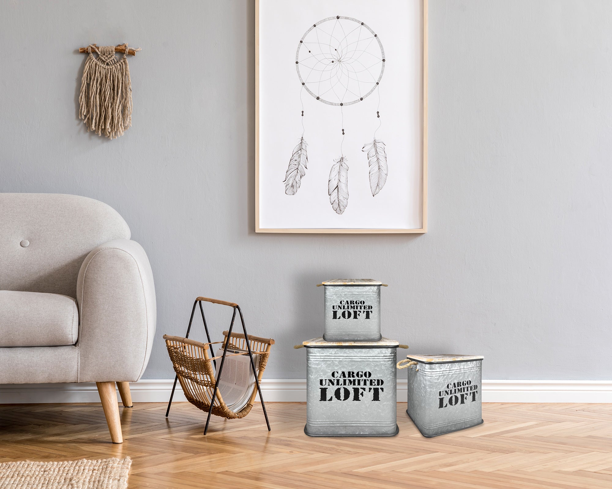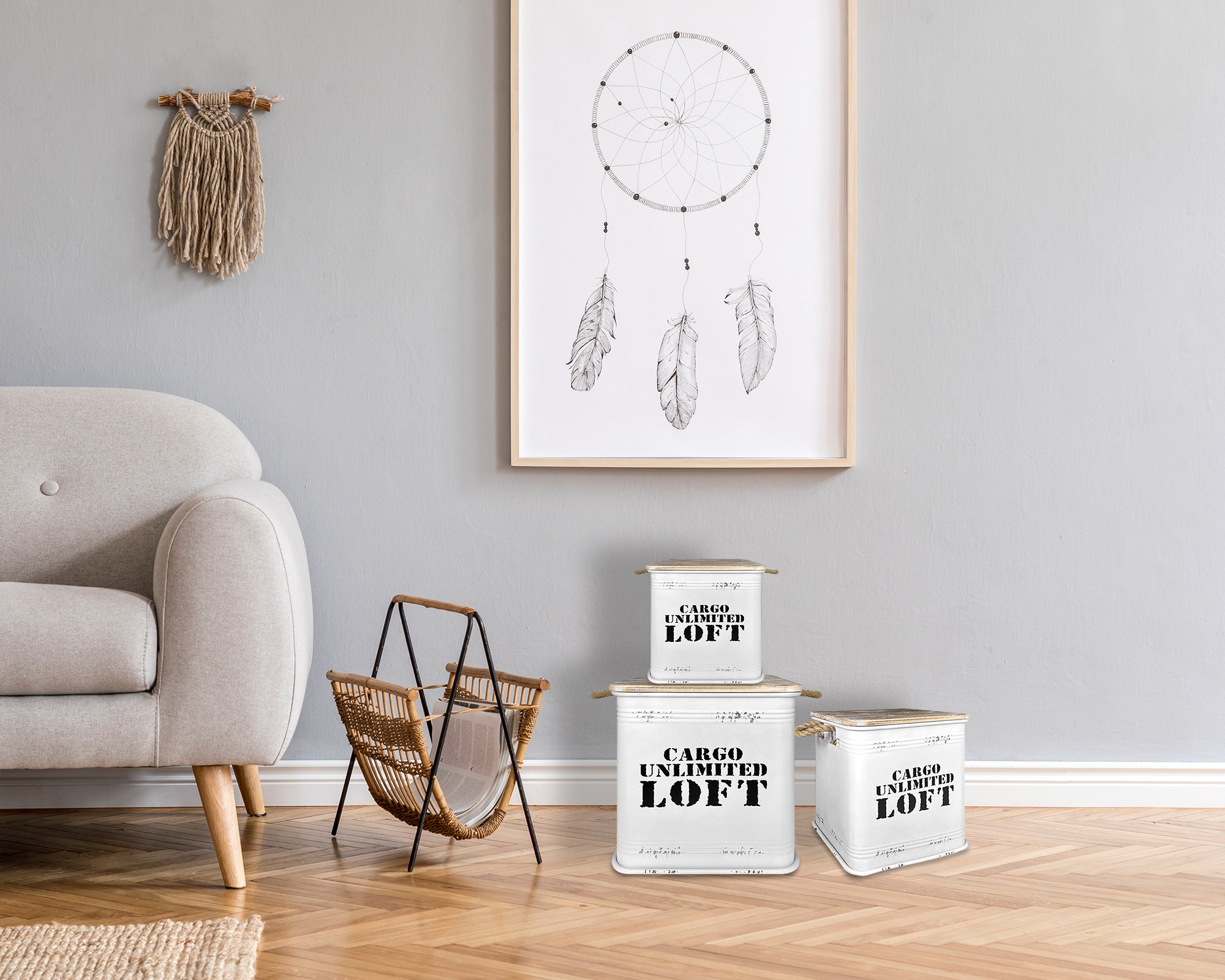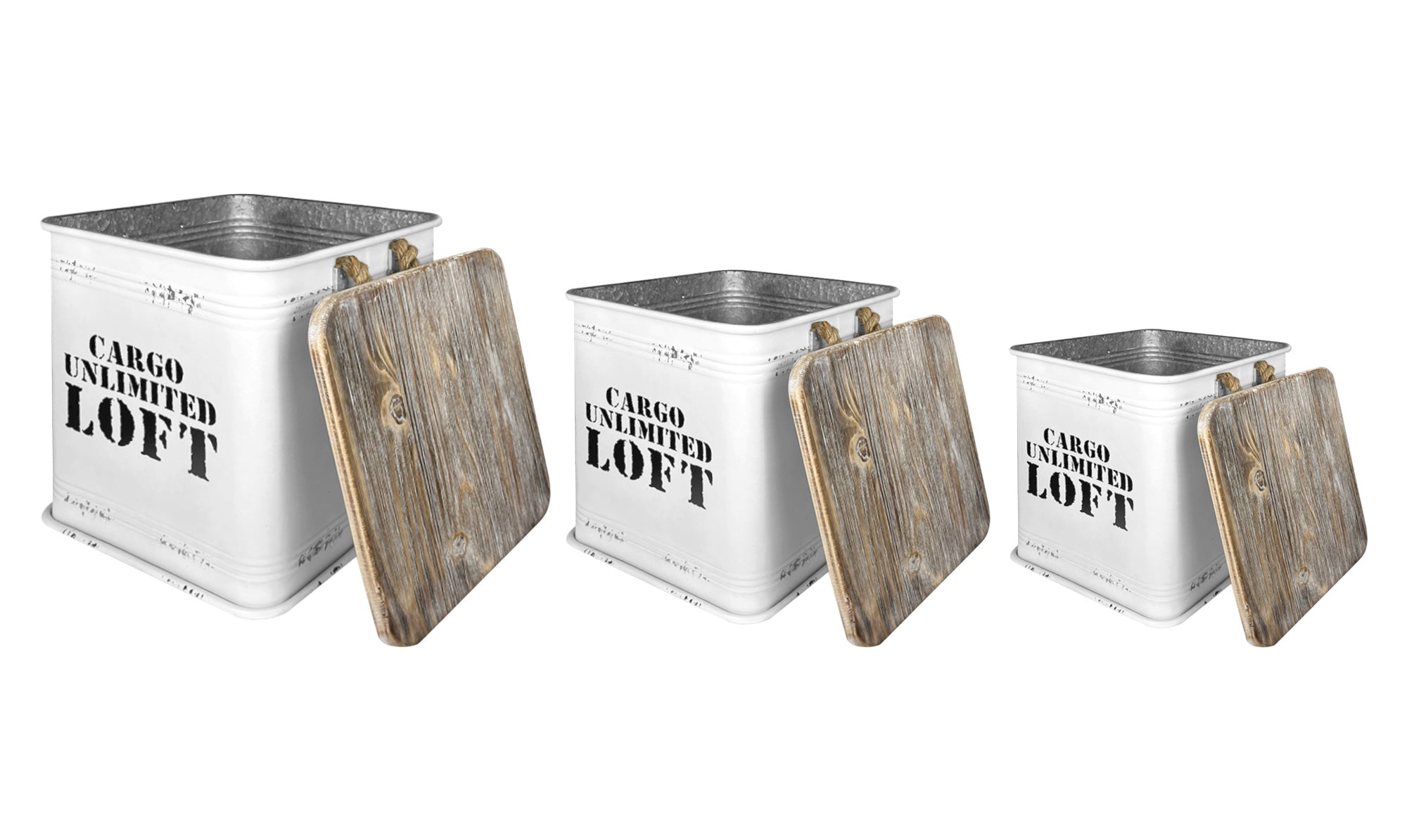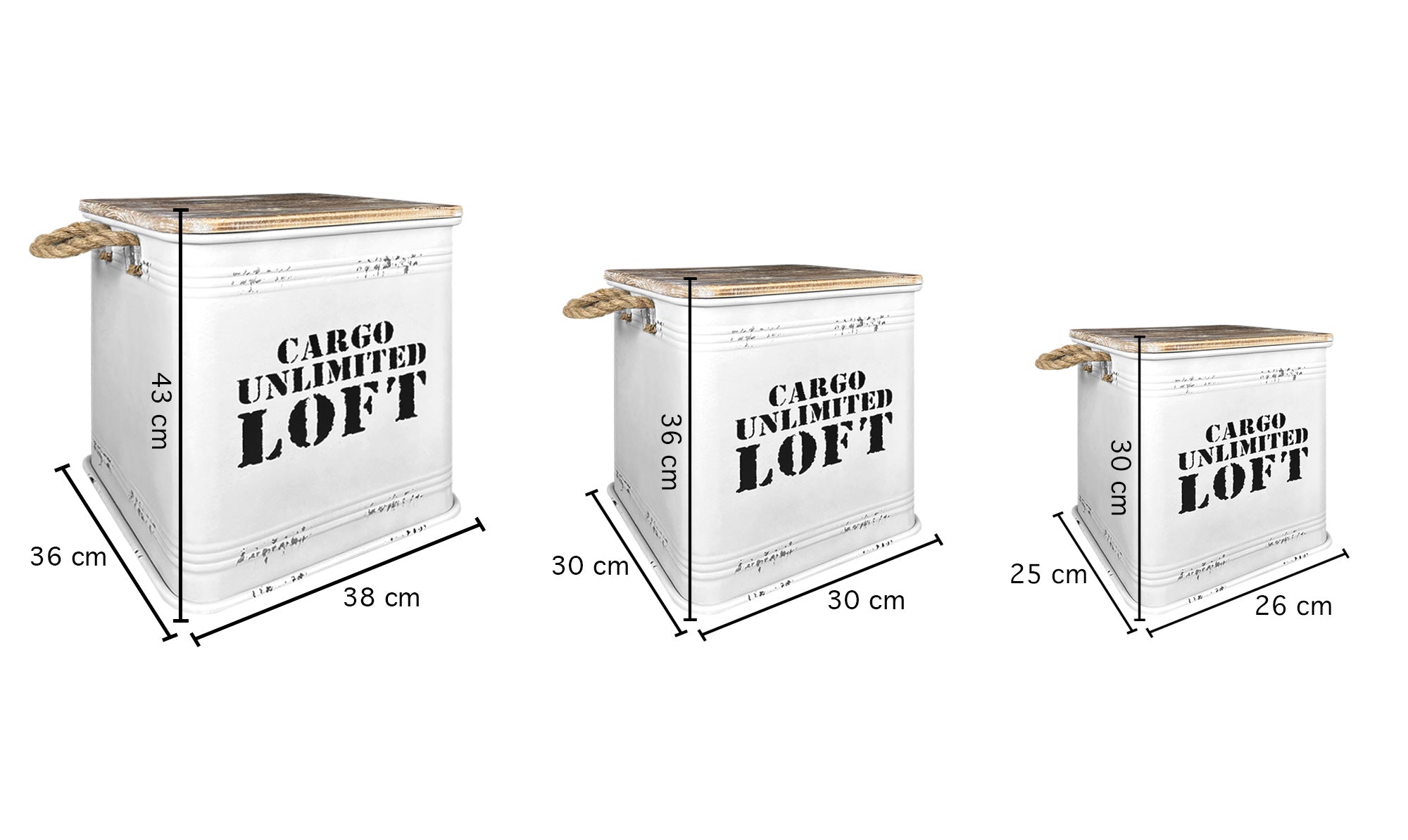 Juego de 3 contenedores grandes de acero, taburete tipo puf Cargo Unlimited Loft con tapa de madera, taburetes militares vintage, contenedor metálico