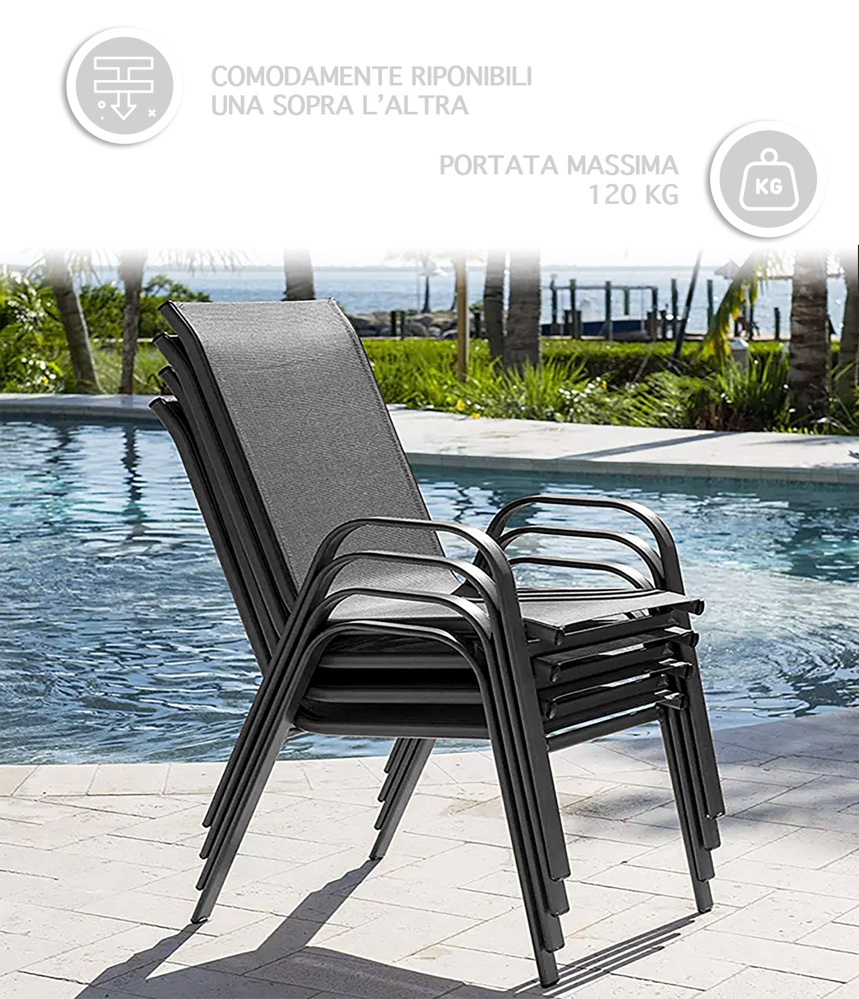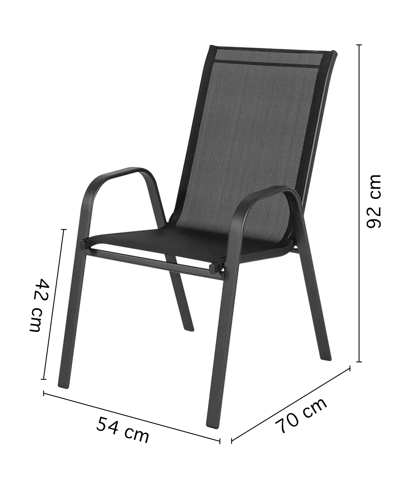 Juego de 4 sillas apilables de acero con respaldo alto y asiento de textileno, ideales para terraza, jardín, balcón, patio o piscina. Medidas: 92 x 70 x 54 cm.