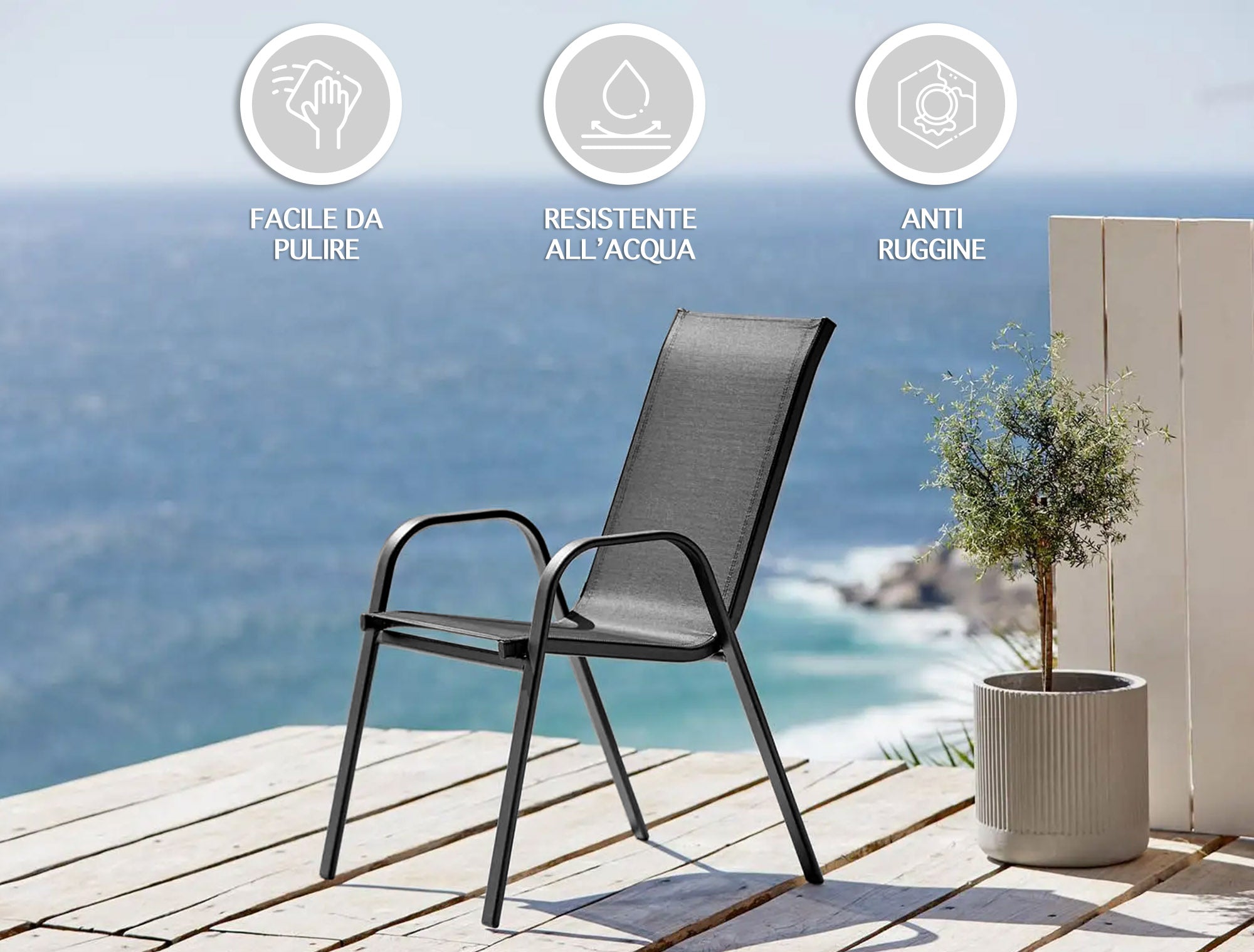 ✔️El recubrimiento en polvo hace que la silla sea inoxidable, por lo que siempre se puede dejar al aire libre; el asiento y el respaldo están hechos de textileno 2x1 resistente al desgarro con alta transpirabilidad que permite una excelente circulación de aire incluso en los días más calurosos, lo que garantiza la máxima comodidad.