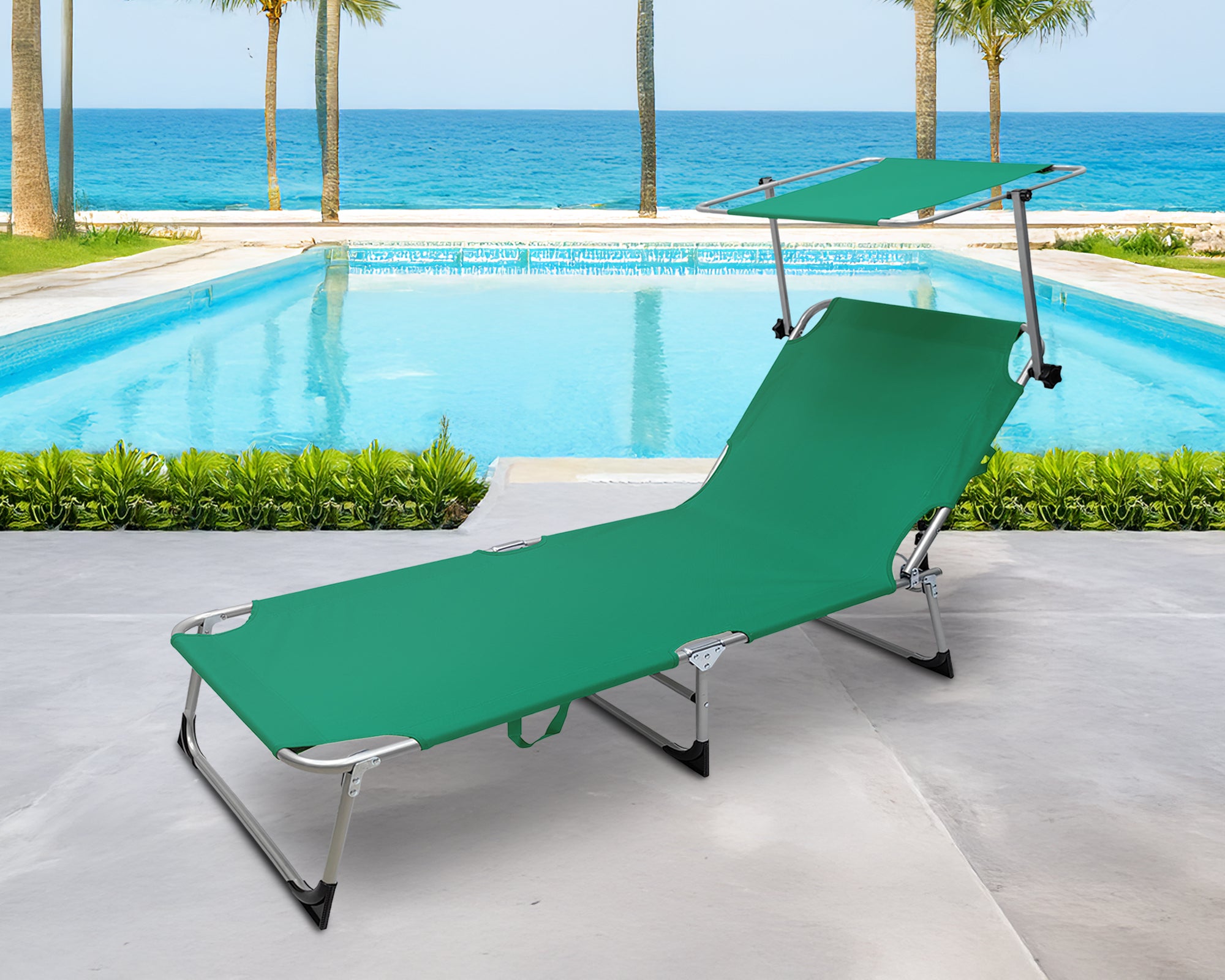 Conjunto de 2 tumbonas con toldo, estructura de aluminio anodizado, respaldo ajustable, plegables profesionalmente, tapizadas en textileno.