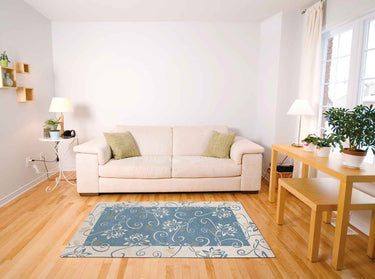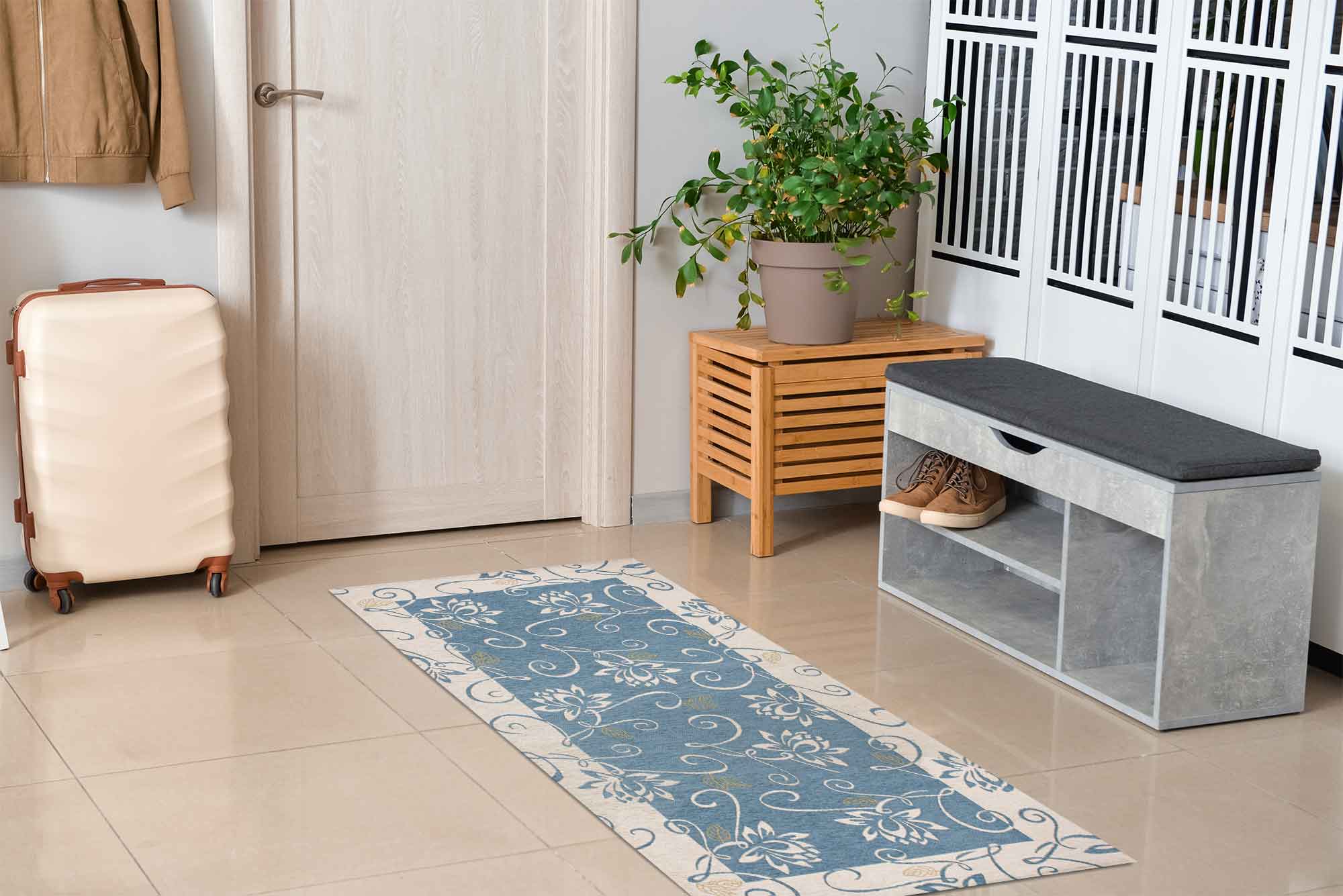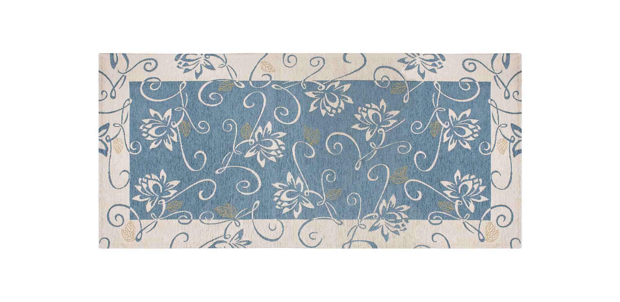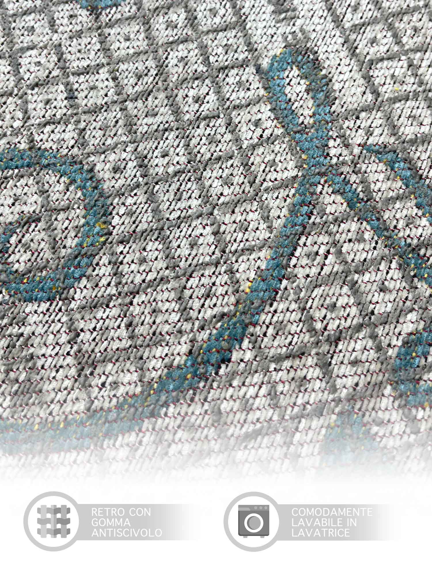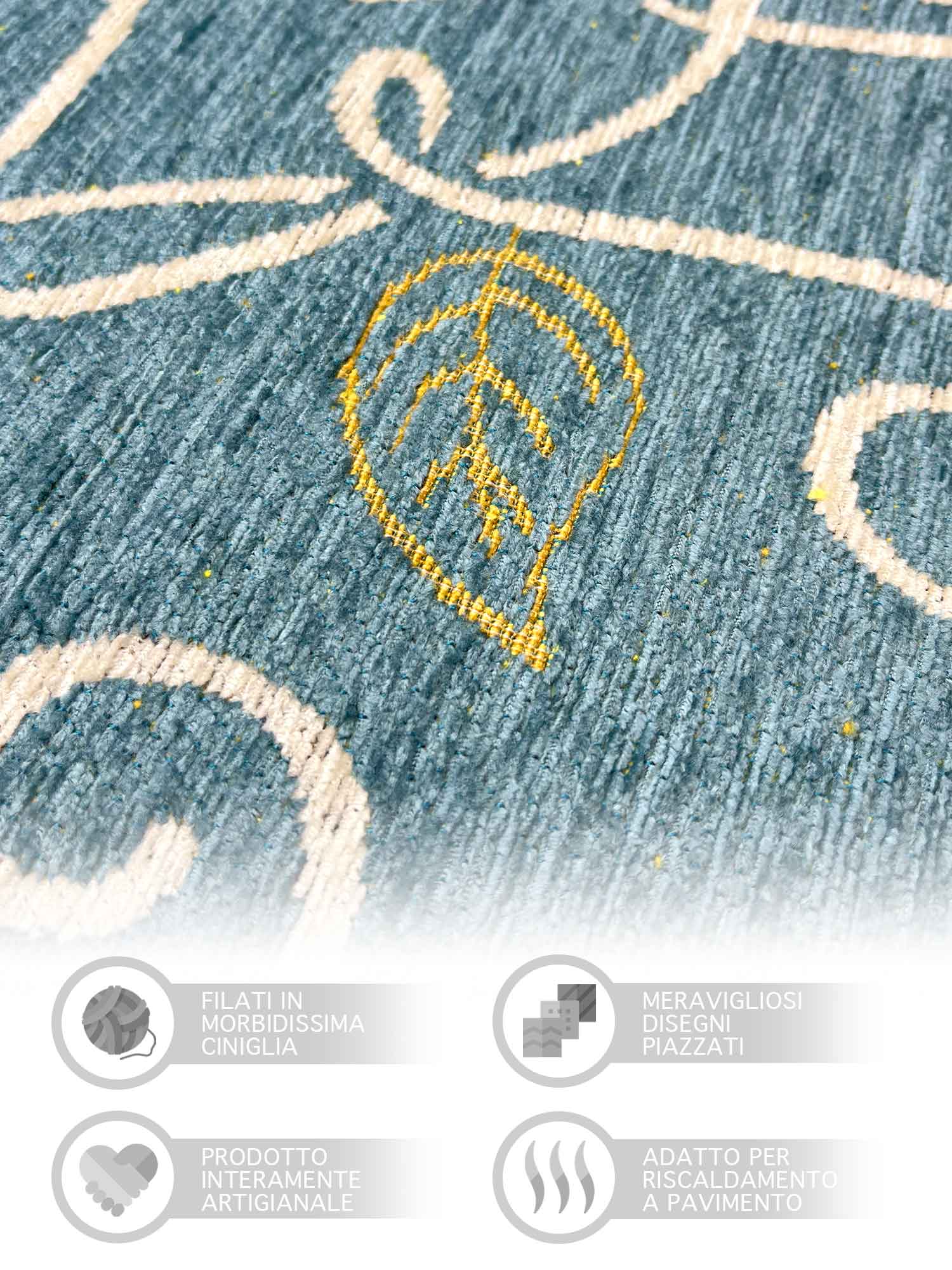 Alfombra moderna antideslizante de chenilla, fabricada en Italia, con diseños estampados en algodón azul nenúfar.