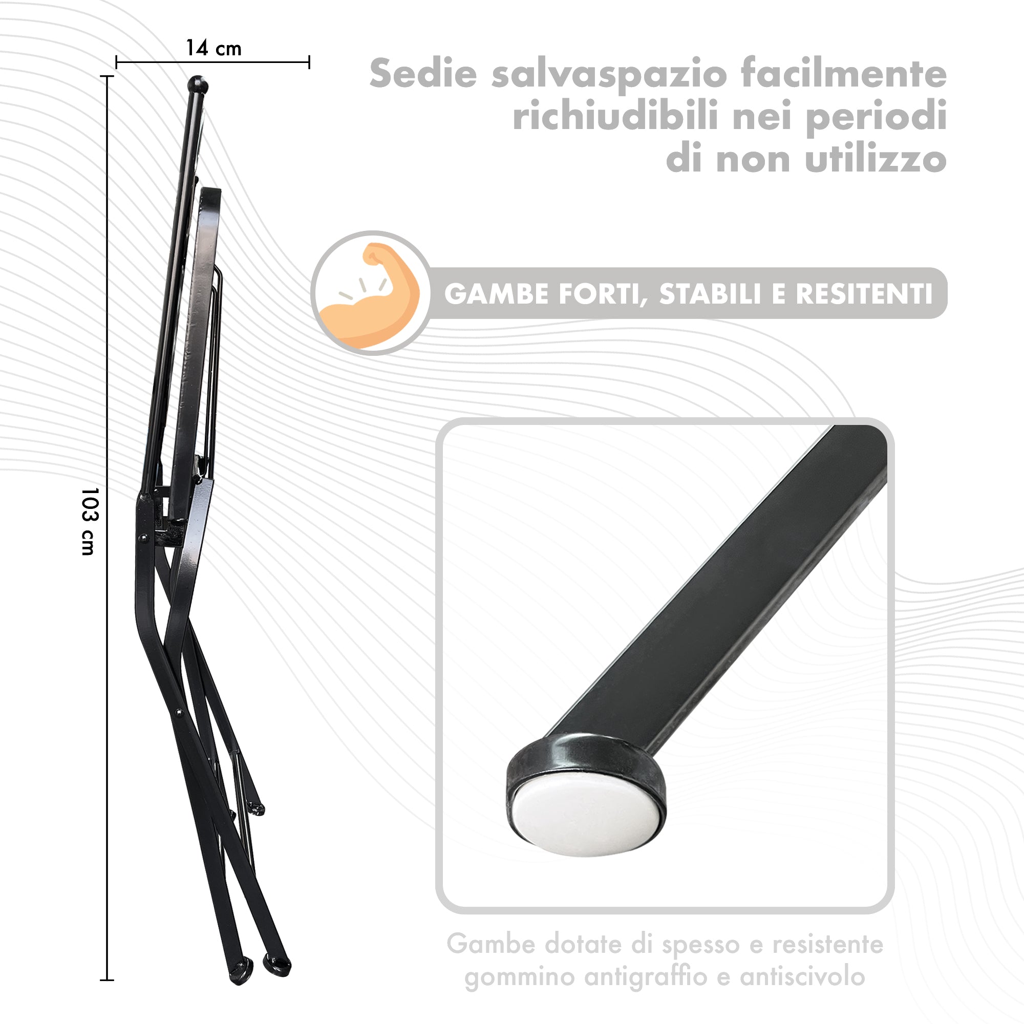 QUALITA': Interamente realizzato selezionando e testando i migliori materiali, set composto da 2 sedie e 1 tavolo in ferro verniciato e trattato, per resistere nel tempo in qualsiasi ambiente interno ed esterno al continuo utilizzo,alle intemperie e ai cambiamenti climatici, le sedie sono richiudibili per occupare meno spazio durante i periodi di non utilizzo e la base del tavolo è facilmente smontabile per poter riporre anch'essa