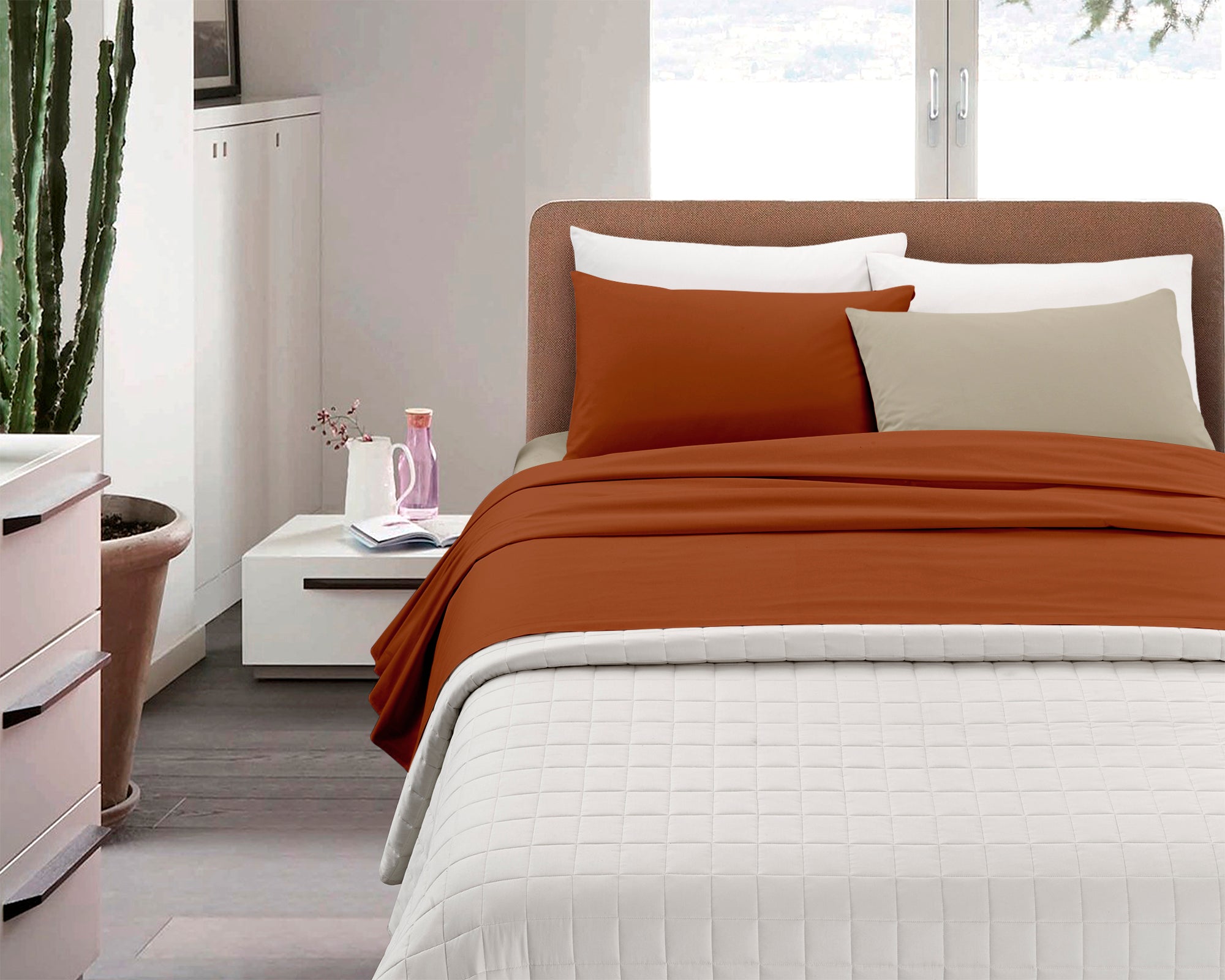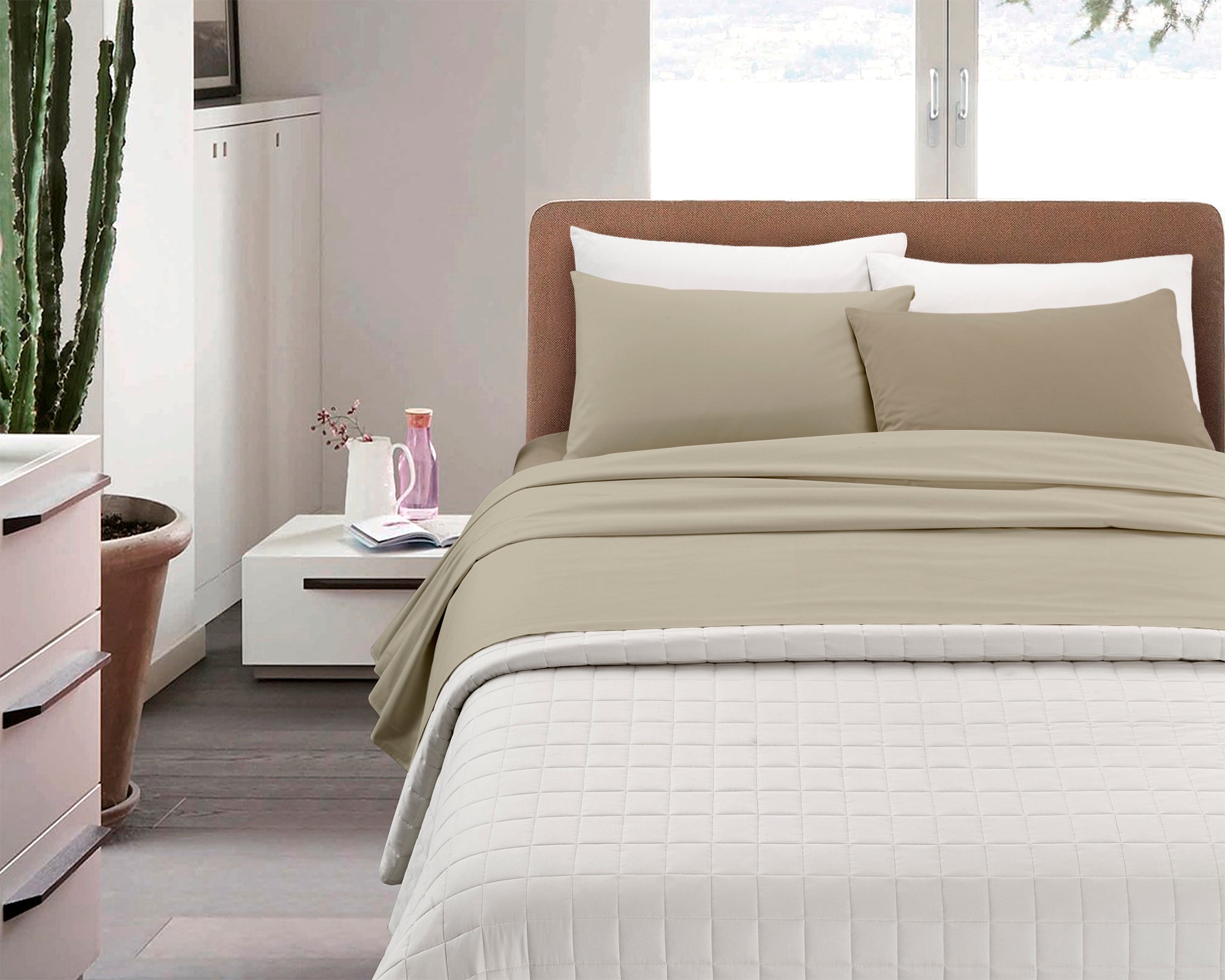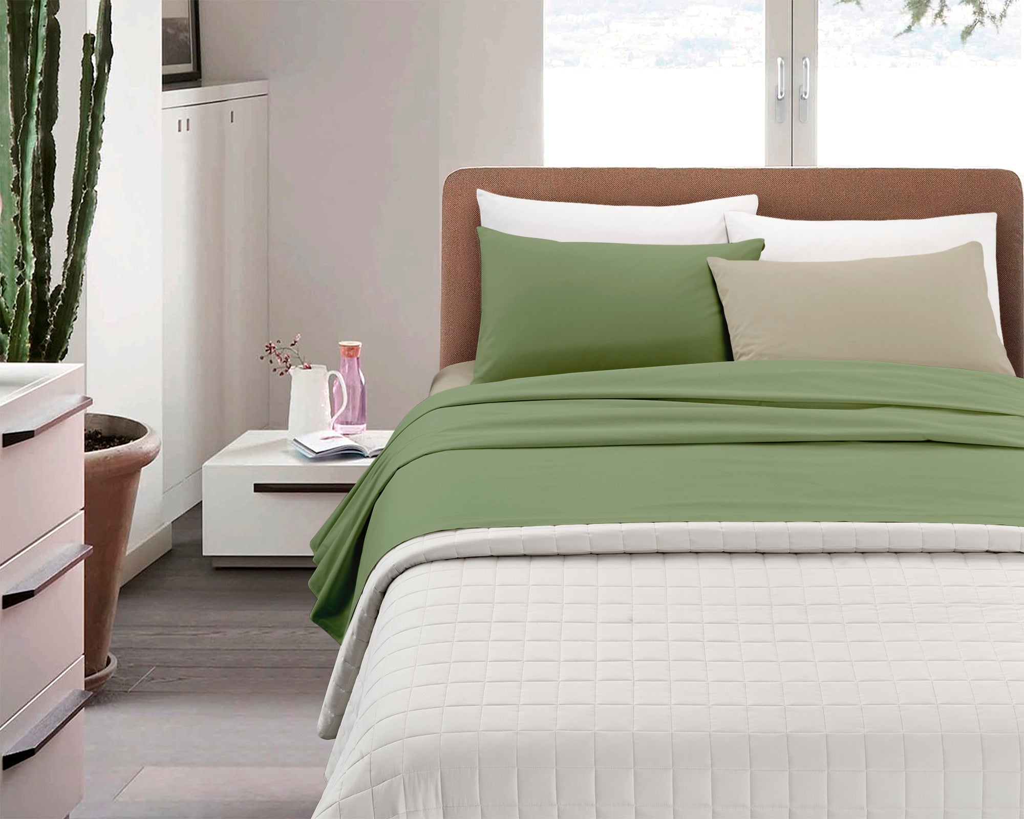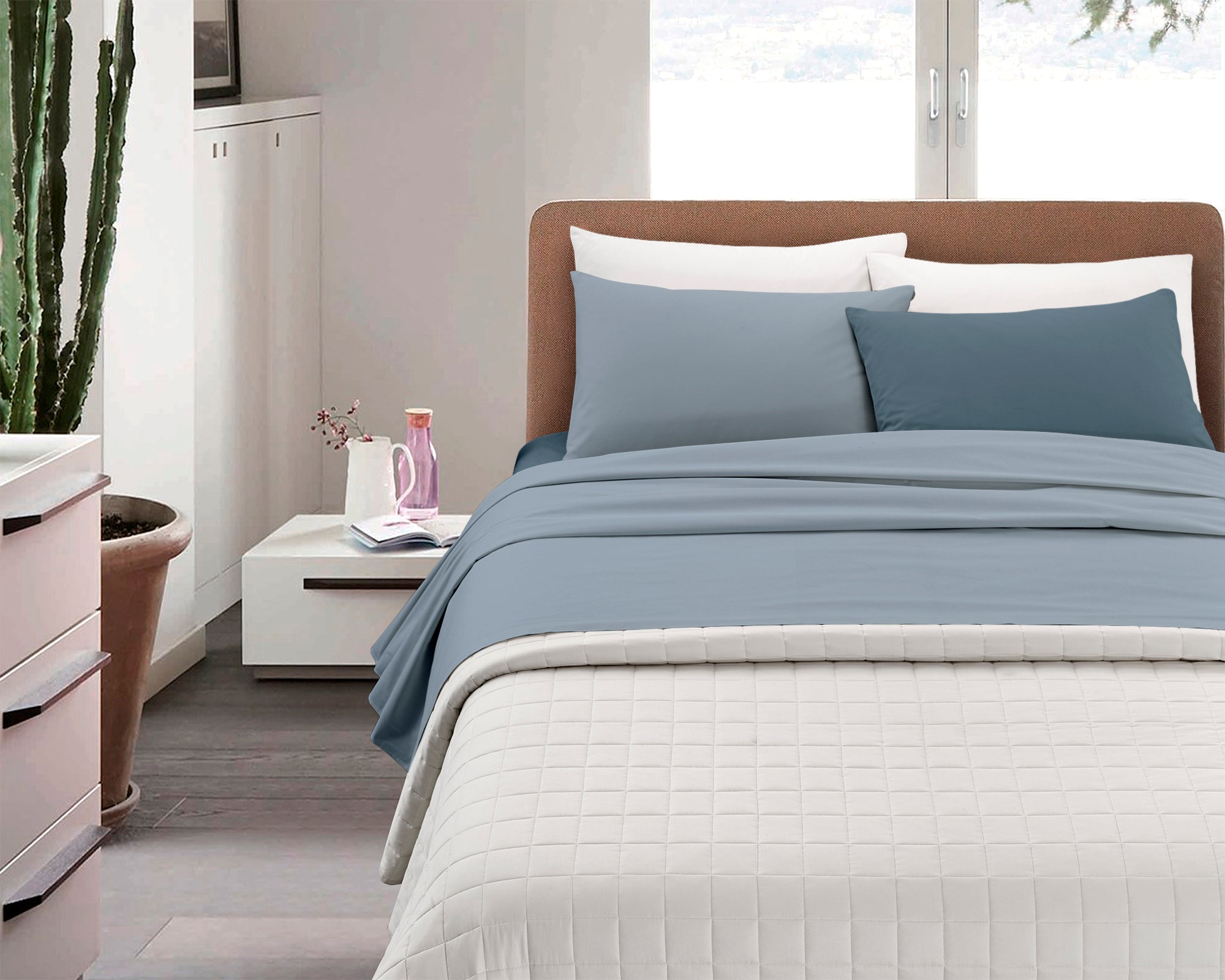 Misura Matrimoniale Lenzuolo Sotto con angoli 180 x 200 + 23 Cm di angoli elastici su tutto il perimetro Lenzuolo Sopra 240 x 280 Cm 2 Federe con patella 50 x 80 Cm