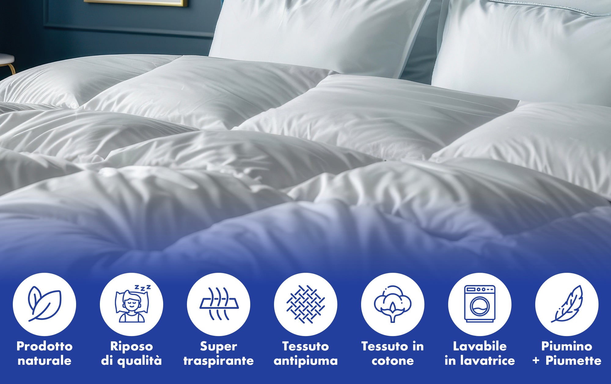 PRATICO E FUNZIONALE:Il piumino è disponibile in diverse misure: singolo (155x200 cm), piazza e mezzo (200x200 cm) e matrimoniale (250x200 cm). Ogni variante è leggera e facile da maneggiare, con pesi che variano da 310 gr per il modello singolo a 500 gr per quello matrimoniale. Il confezionamento trapuntato a quadri fissi non solo aggiunge un tocco estetico, ma garantisce anche una distribuzione uniforme dell'imbottitura.