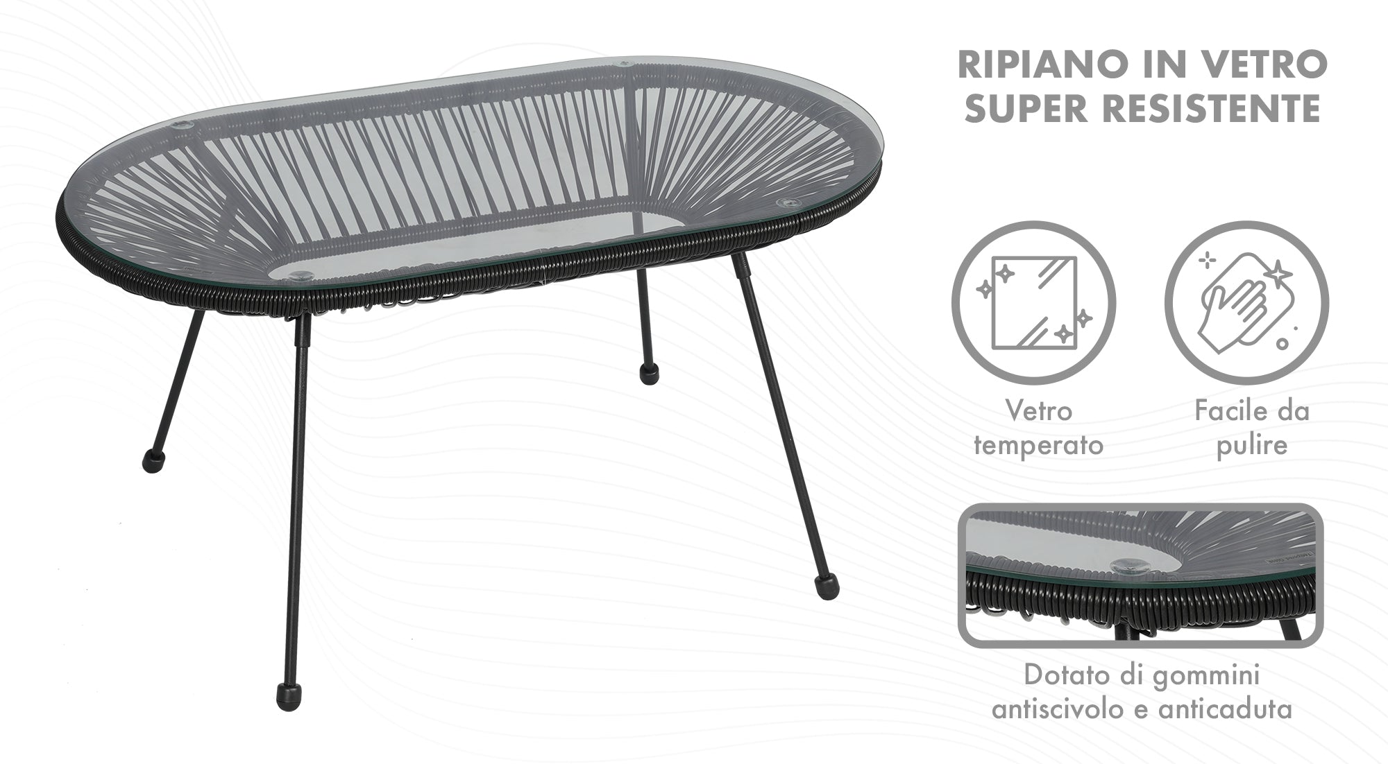 ✔️MATERIALE DI ALTA QUALITA':Ogni elemento del salottino è progettato per resistere alle intemperie, grazie alla sua costruzione impermeabile. la struttura è realizzata in acciaio verniciato a polvere e Il rivestimento in corda intrecciata non solo è altamente resistente, ma offre anche un comfort eccezionale, rendendo ogni momento trascorso seduti un vero piacere. Il piano superiore del tavolo è realizzato in vetro temperato , che è sia resistente che facile da pulire, garantendo praticità e durata nel tempo.